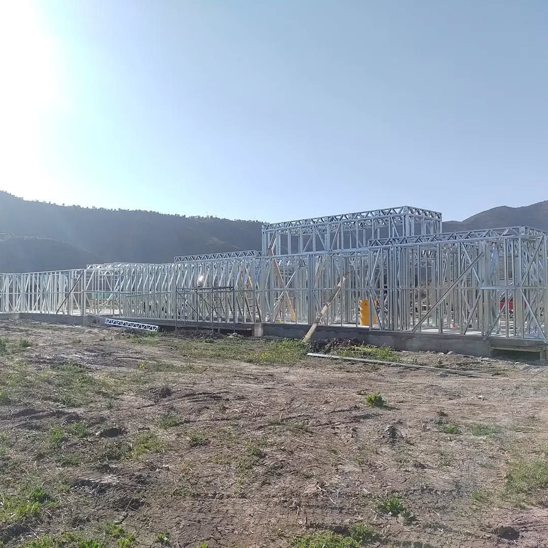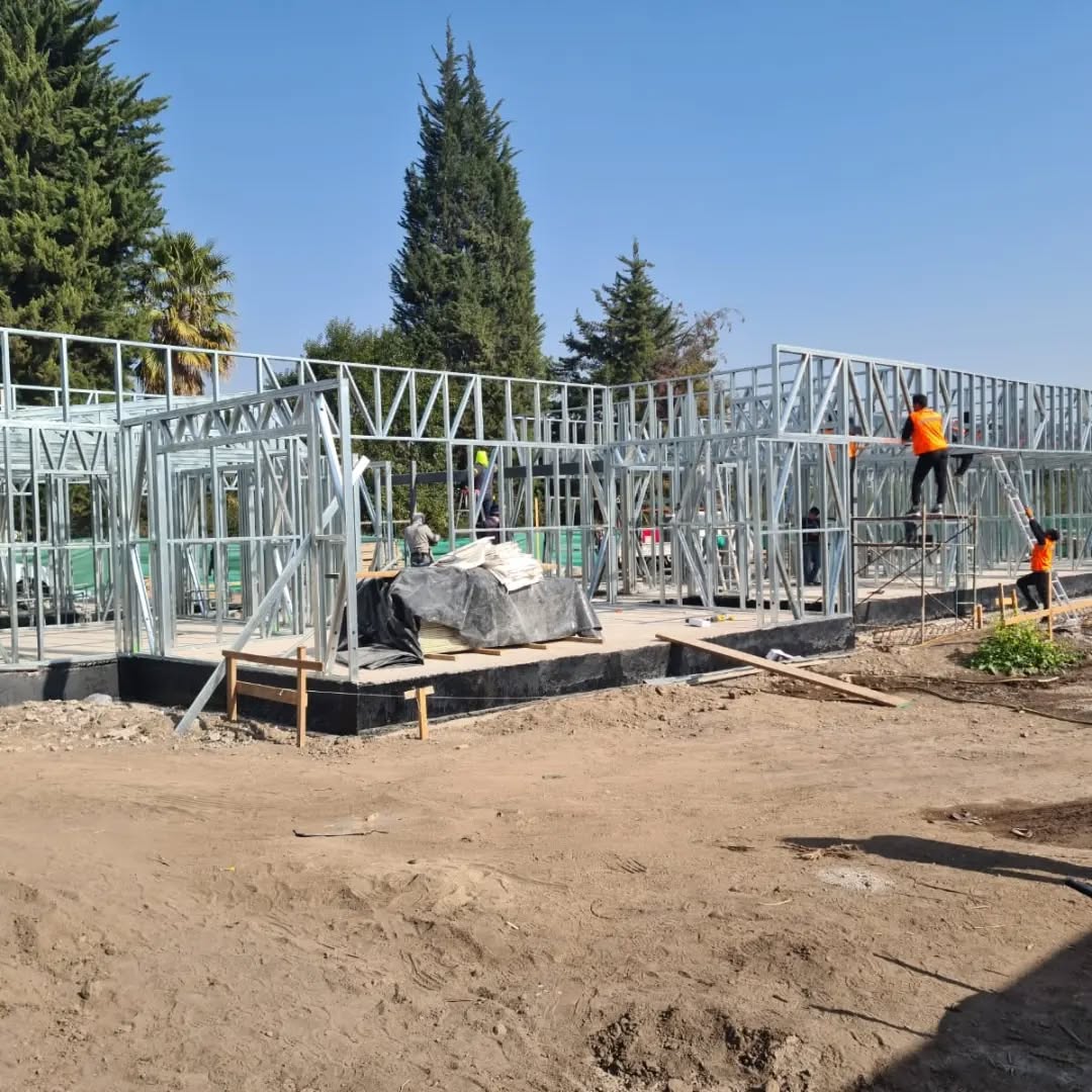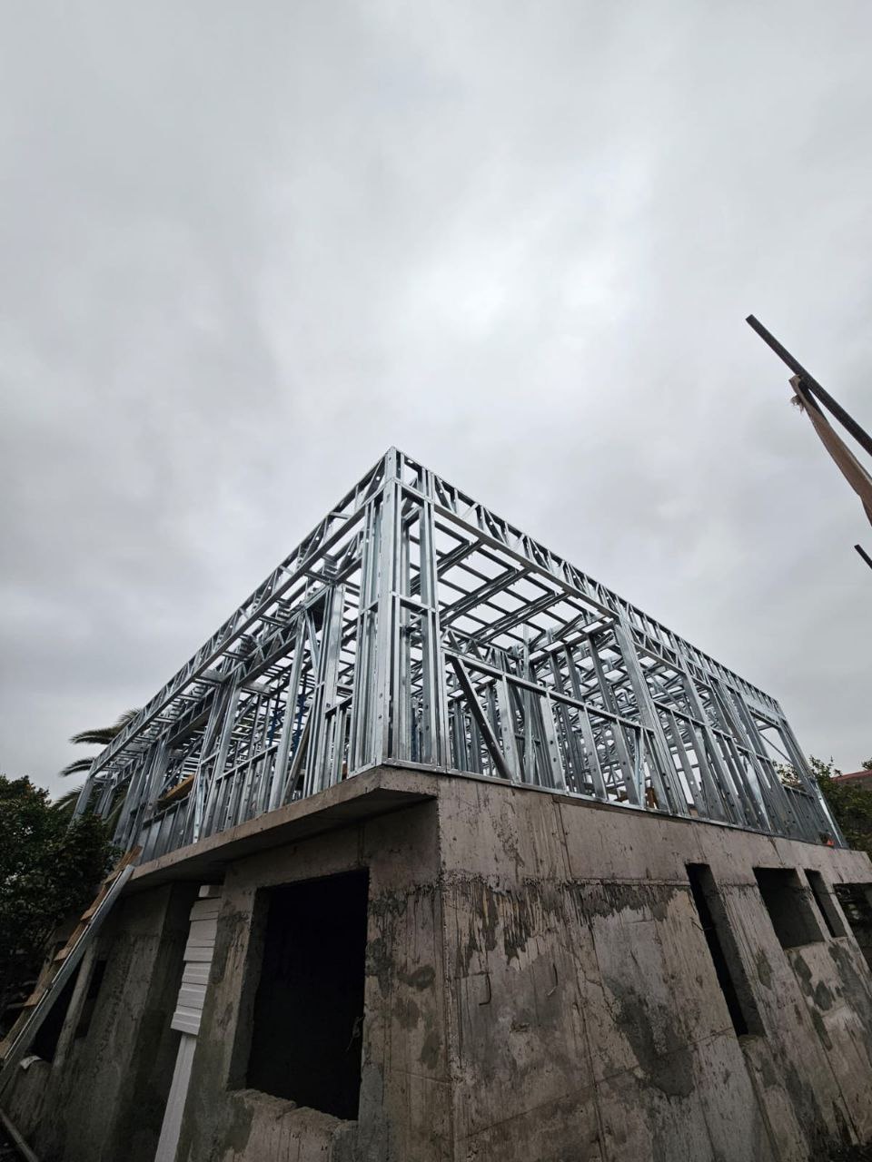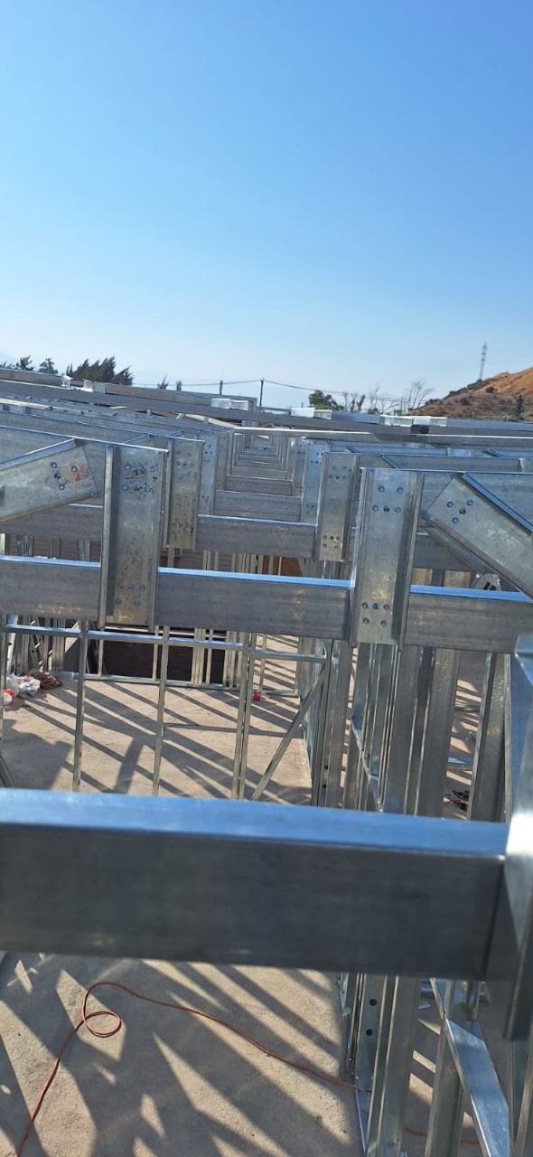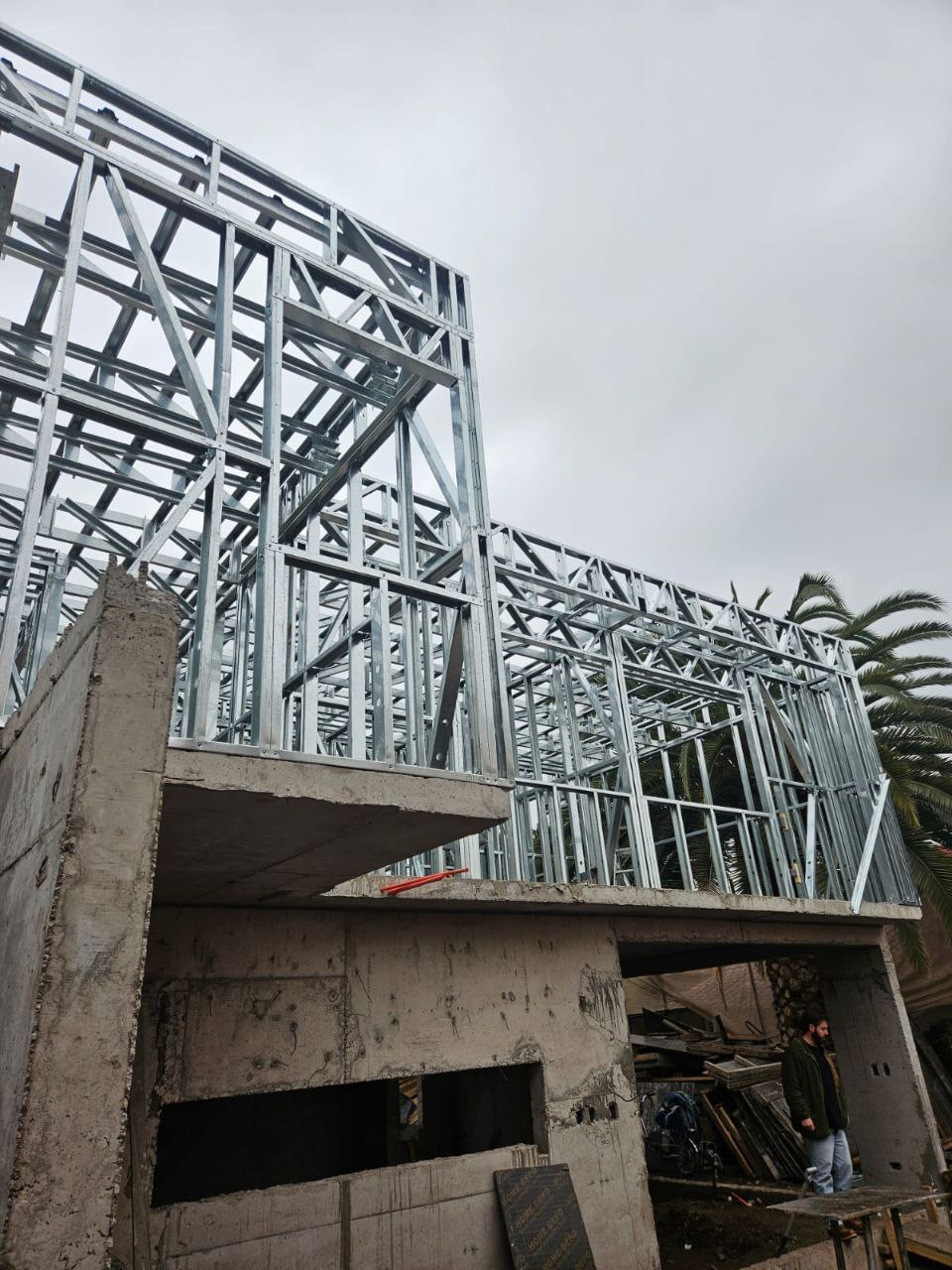 La instalación de una estructura en acero liviano tipo SteelFrame, con diseño de techo mediterráneo. La obra muestra un avance eficiente en el montaje, combinando precisión estructural y un sistema de paneles que permite un proceso rápido, limpio y ordenado.