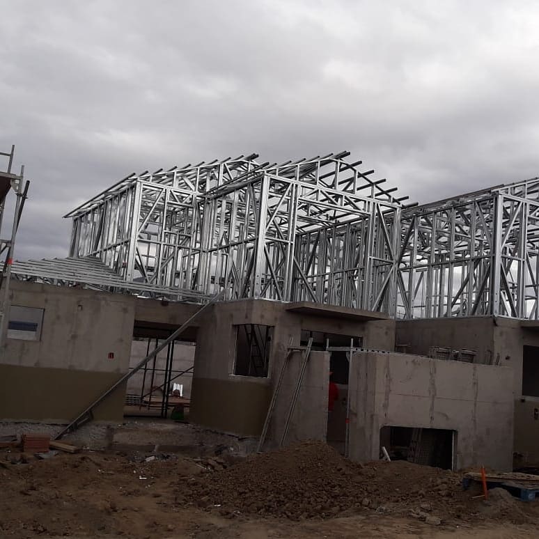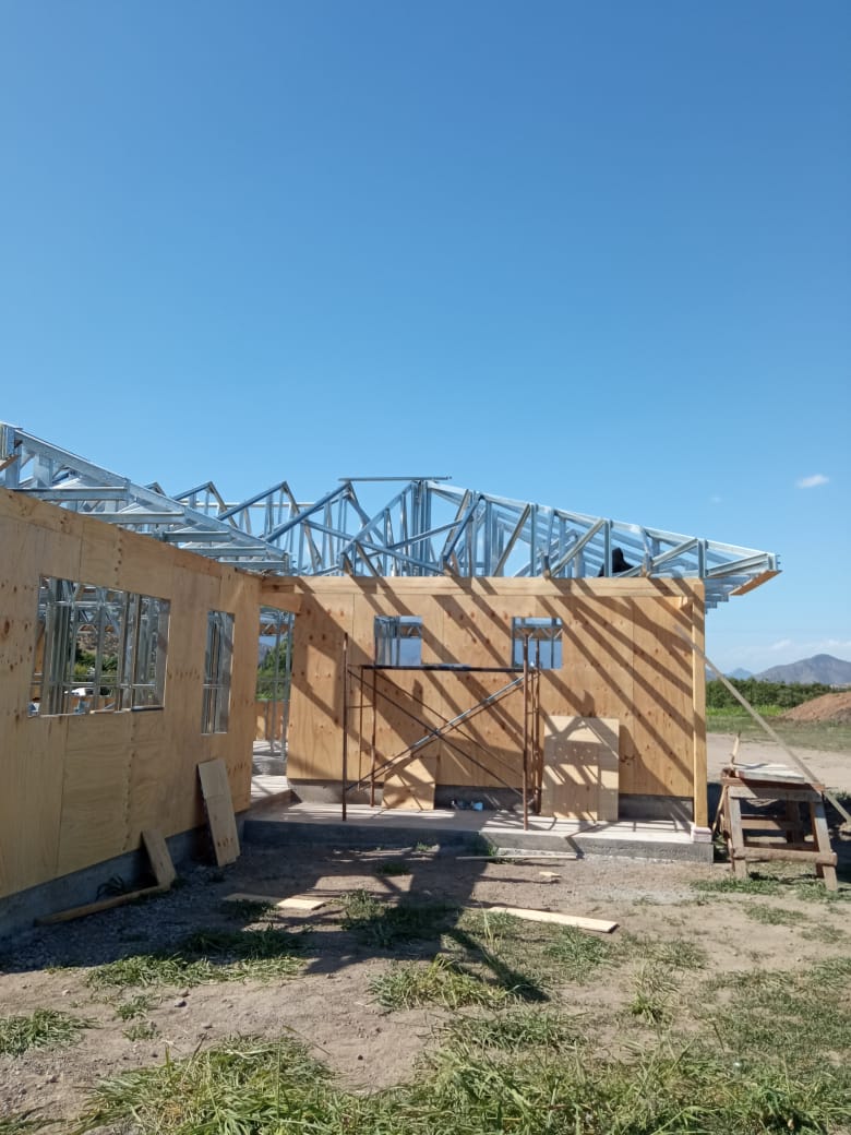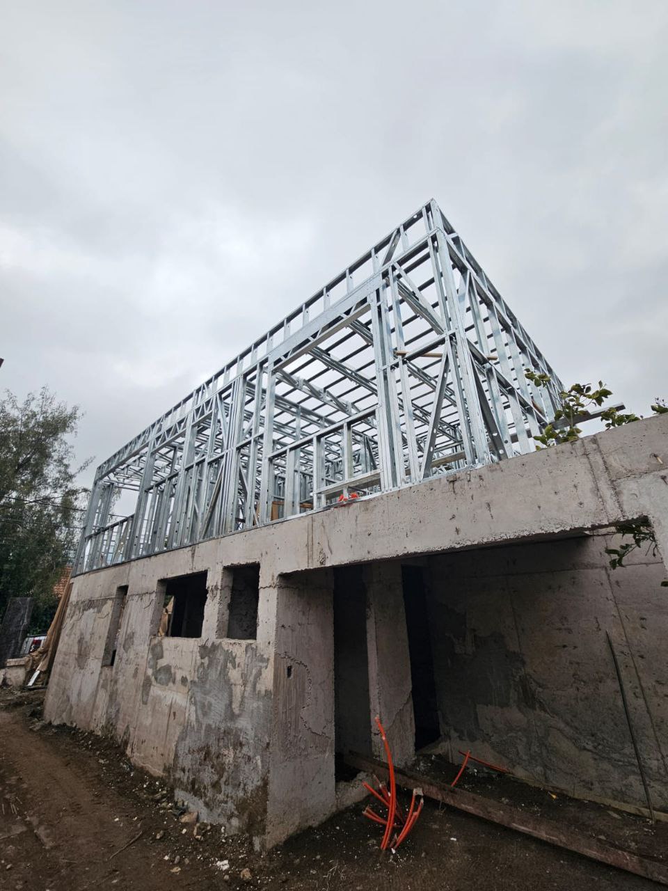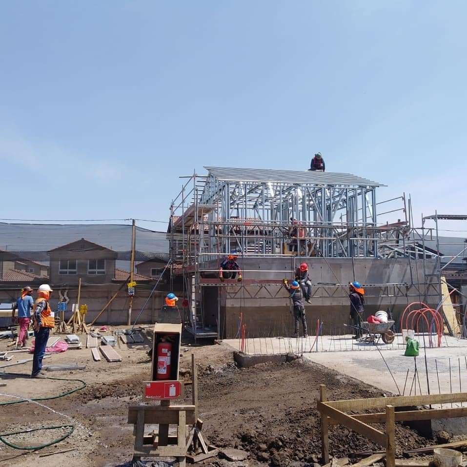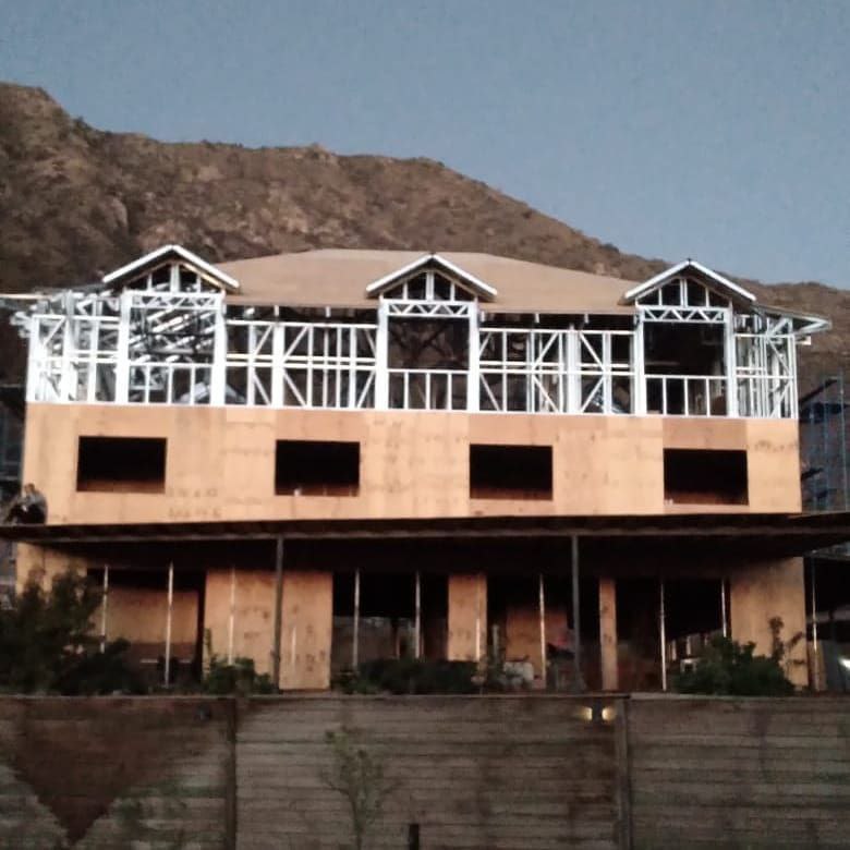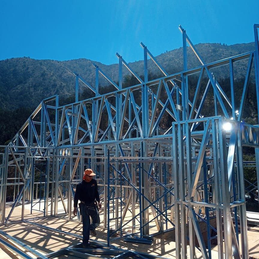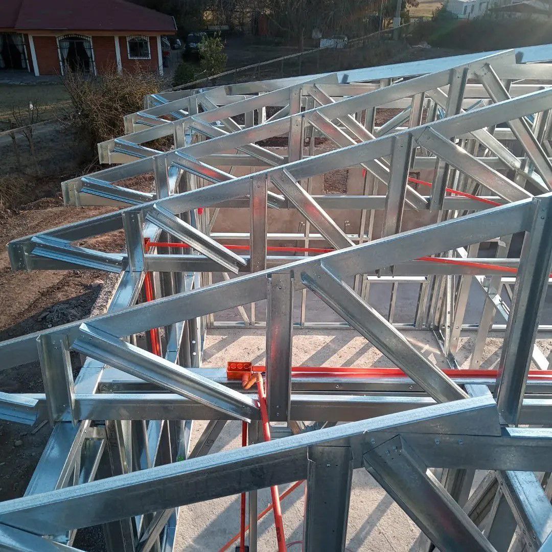 La instalación de una estructura en acero liviano tipo SteelFrame, con diseño de techo mediterráneo. La obra muestra un avance eficiente en el montaje, combinando precisión estructural y un sistema de paneles que permite un proceso rápido, limpio y ordenado.