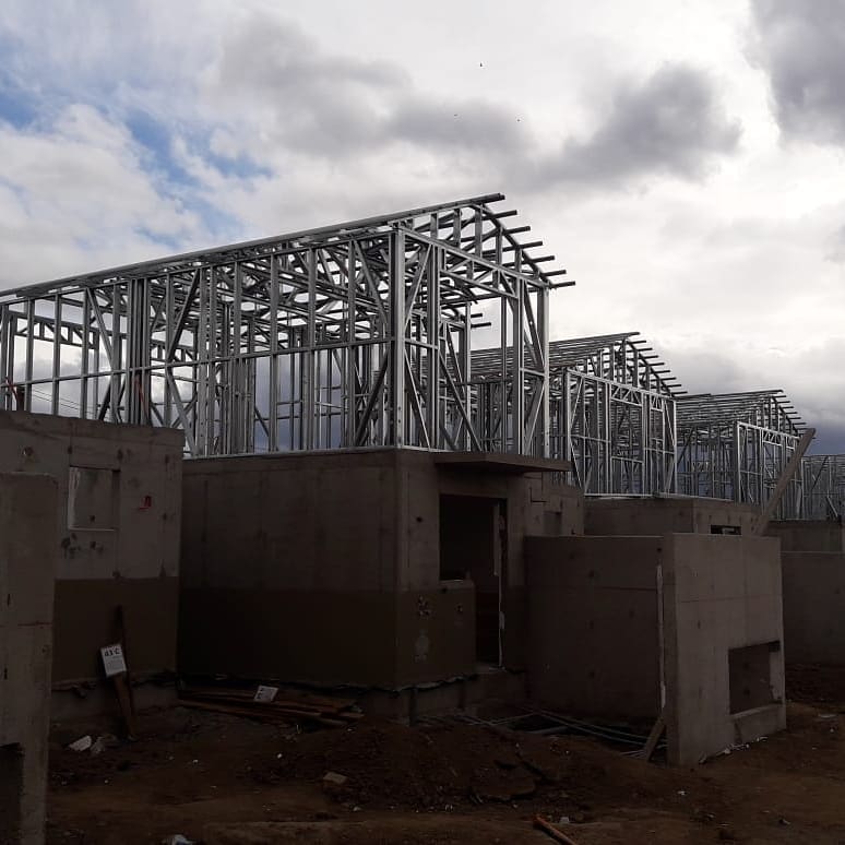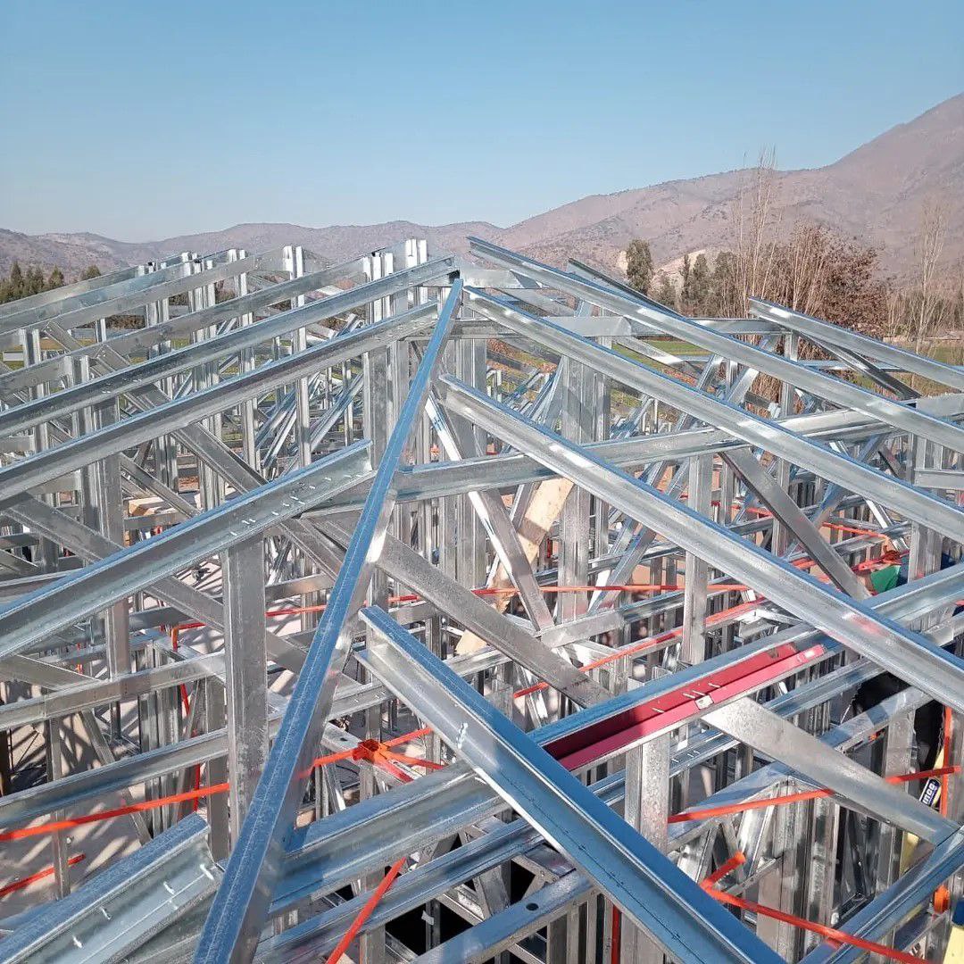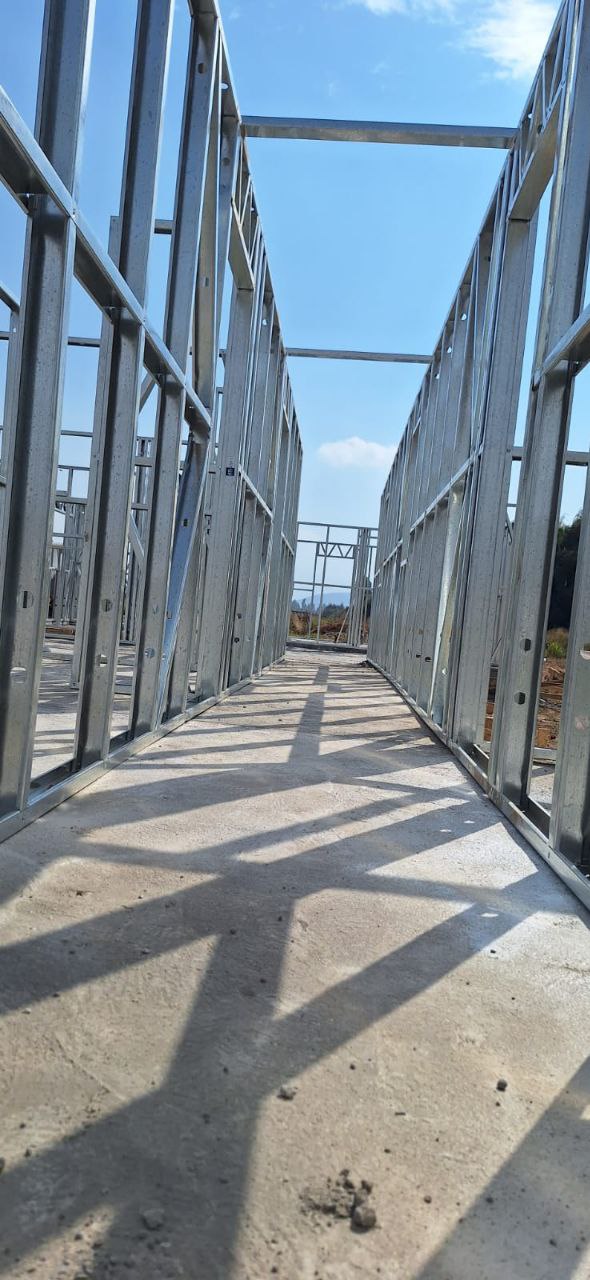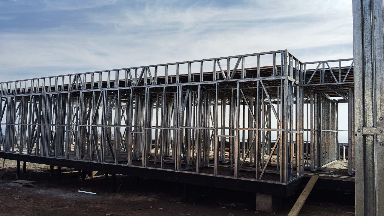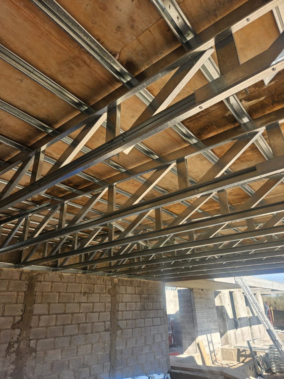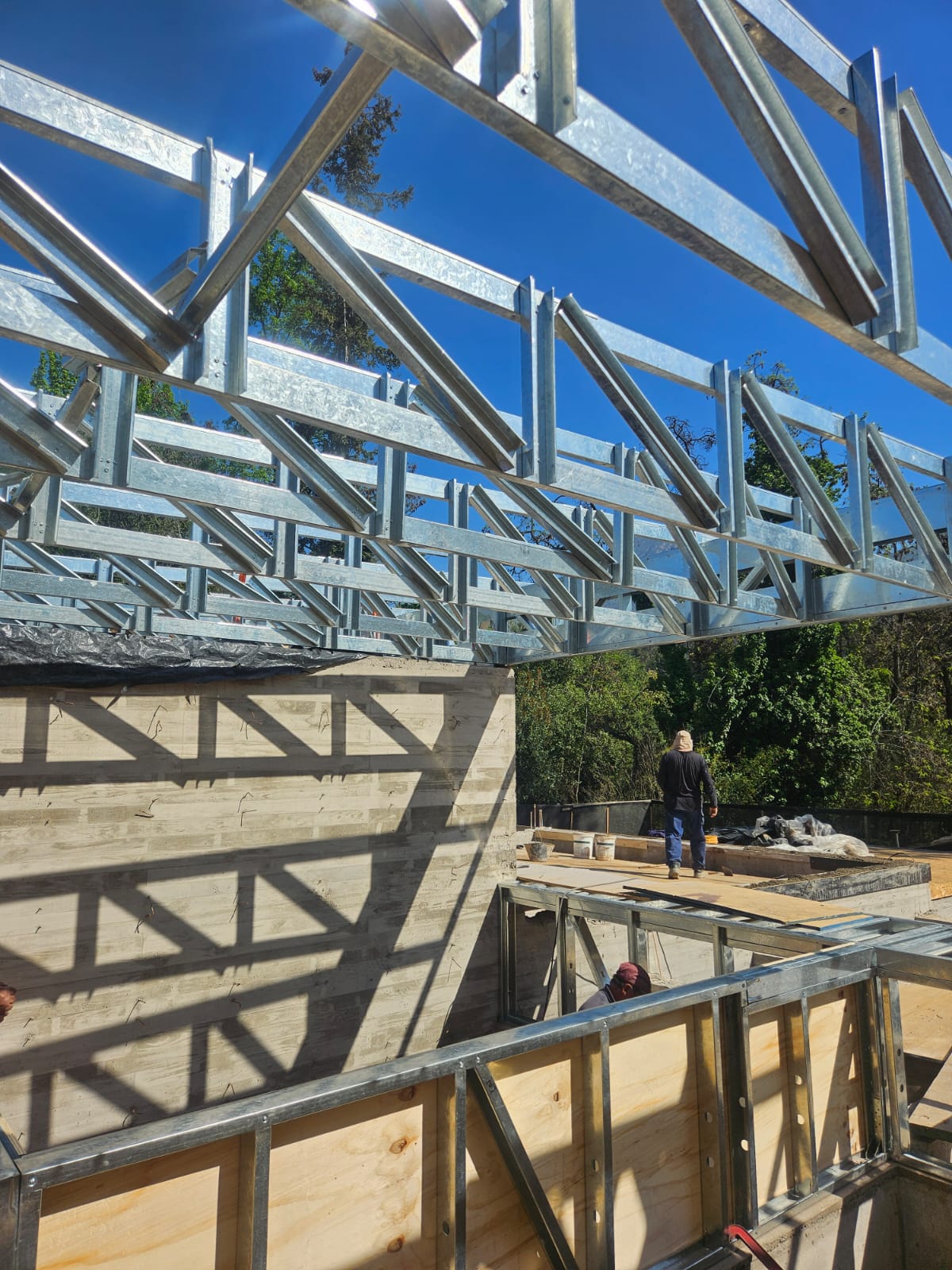 La instalación de una estructura en acero liviano tipo SteelFrame, con diseño de techo mediterráneo. La obra muestra un avance eficiente en el montaje, combinando precisión estructural y un sistema de paneles que permite un proceso rápido, limpio y ordenado.