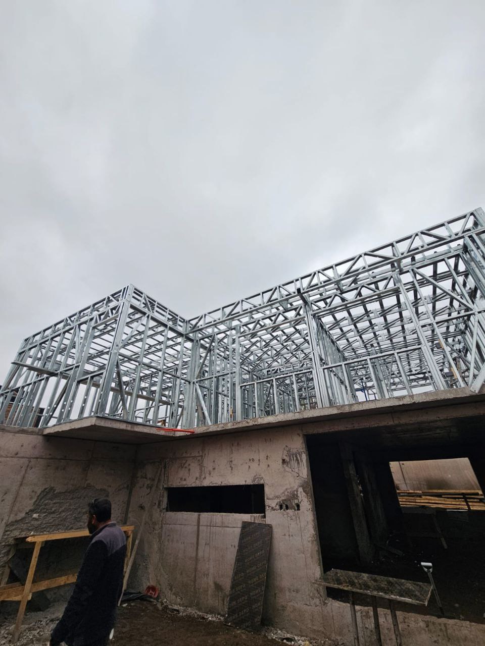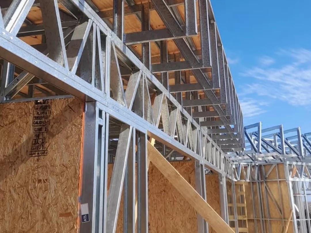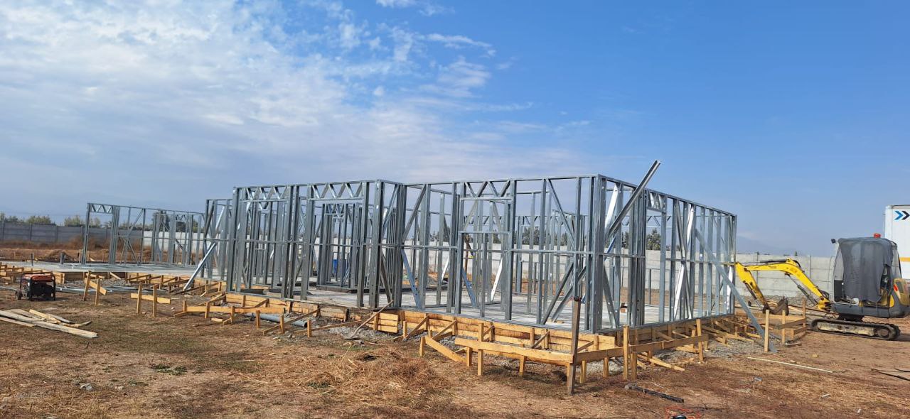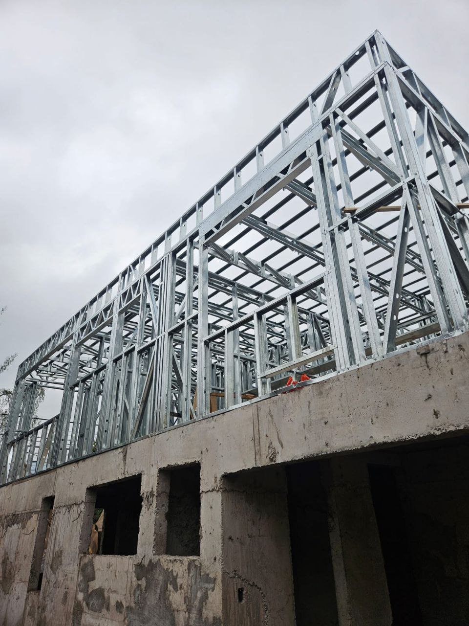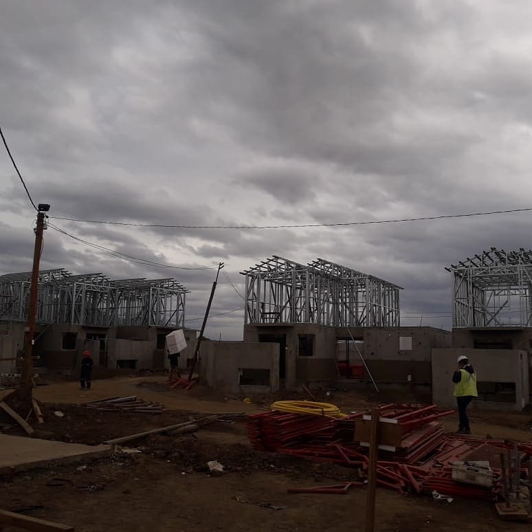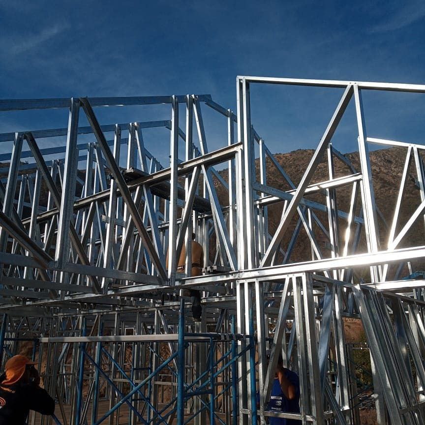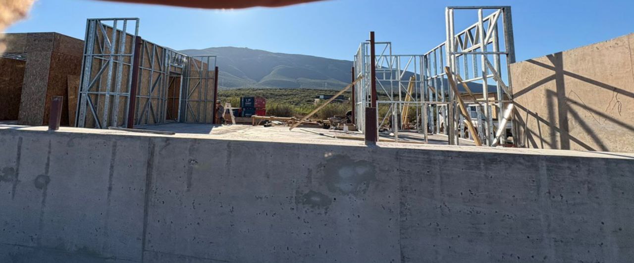 La instalación de una estructura en acero liviano tipo SteelFrame, con diseño de techo mediterráneo. La obra muestra un avance eficiente en el montaje, combinando precisión estructural y un sistema de paneles que permite un proceso rápido, limpio y ordenado.