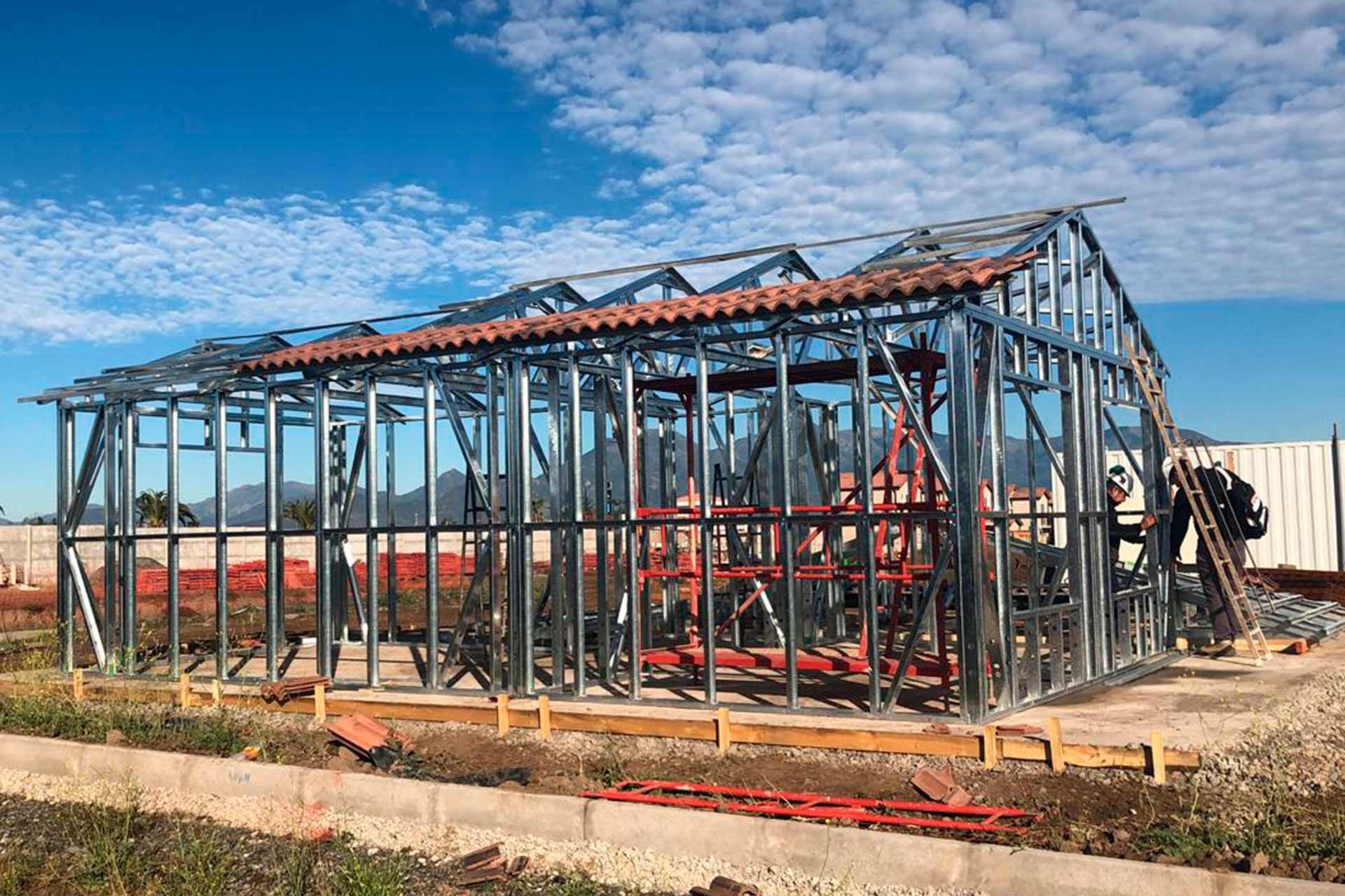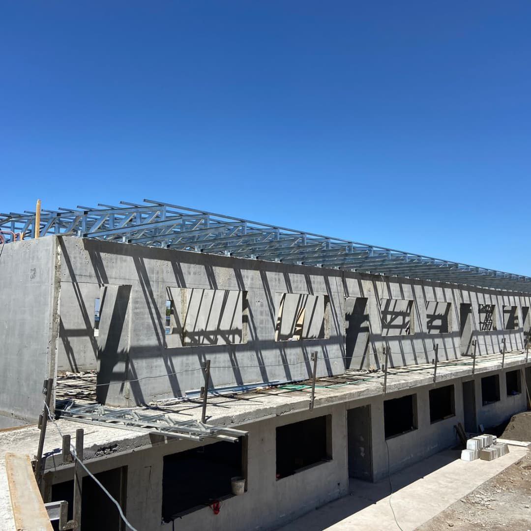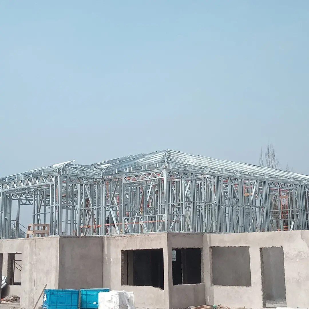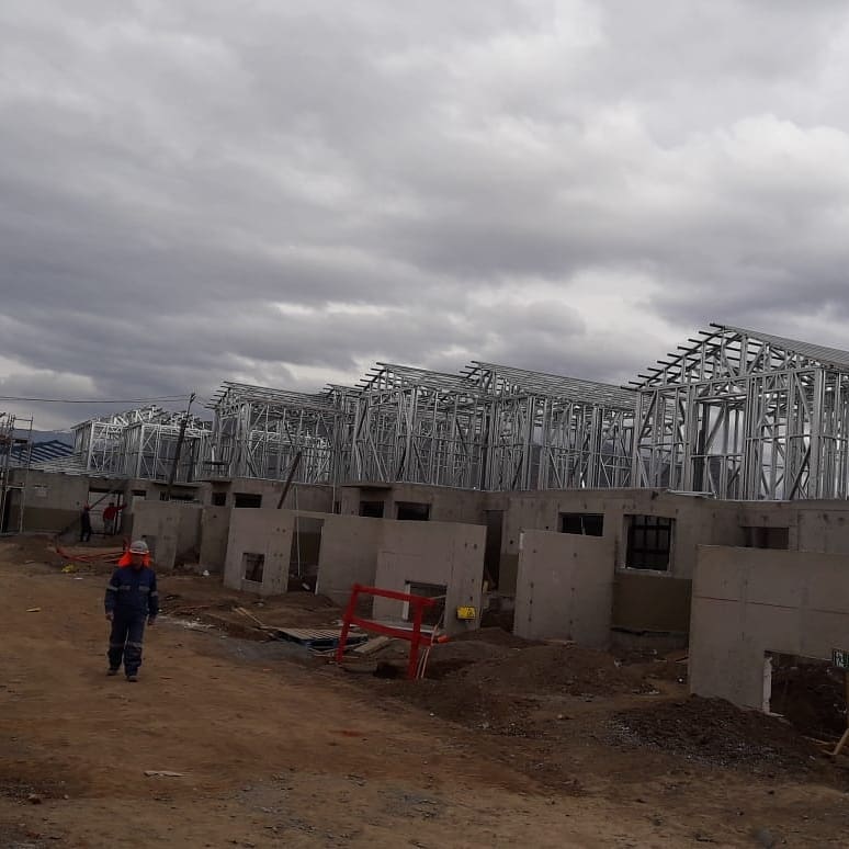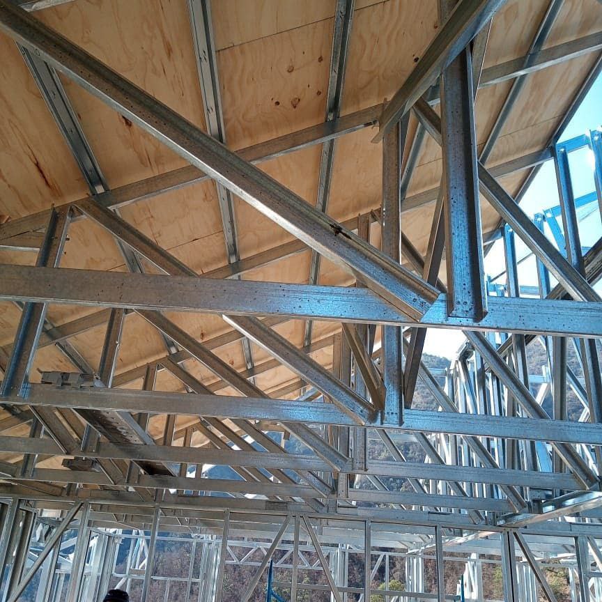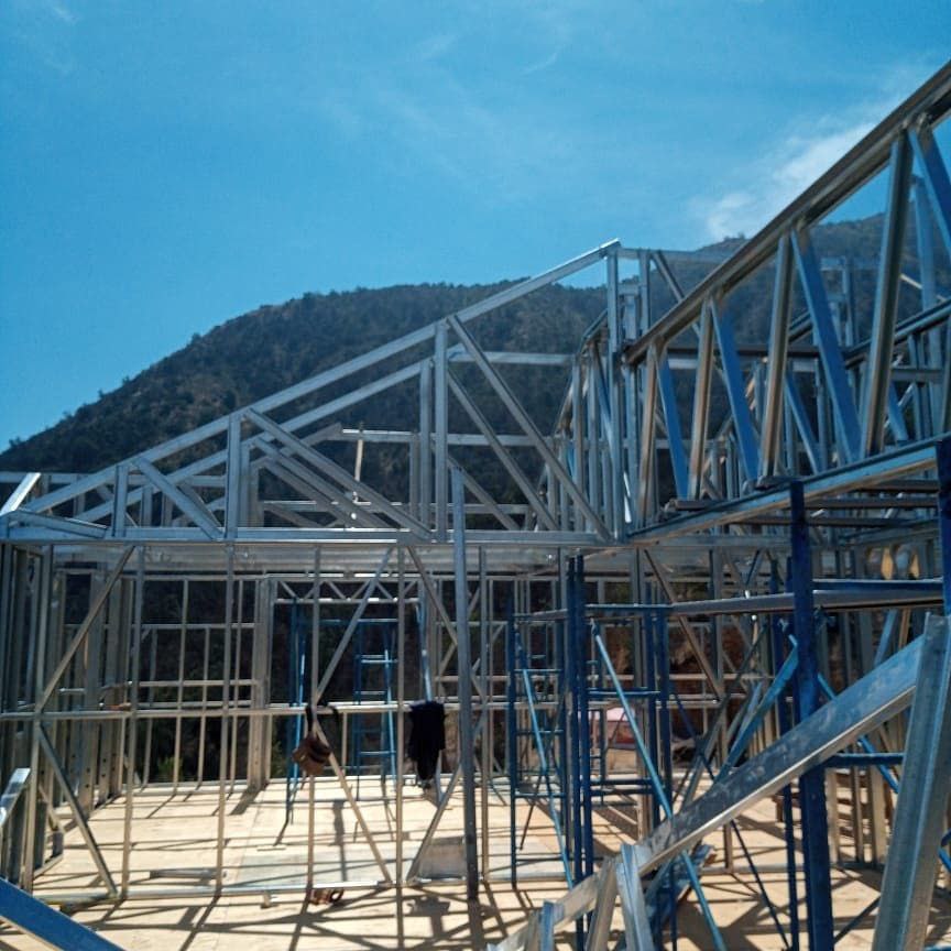 La instalación de una estructura en acero liviano tipo SteelFrame, con diseño de techo mediterráneo. La obra muestra un avance eficiente en el montaje, combinando precisión estructural y un sistema de paneles que permite un proceso rápido, limpio y ordenado.