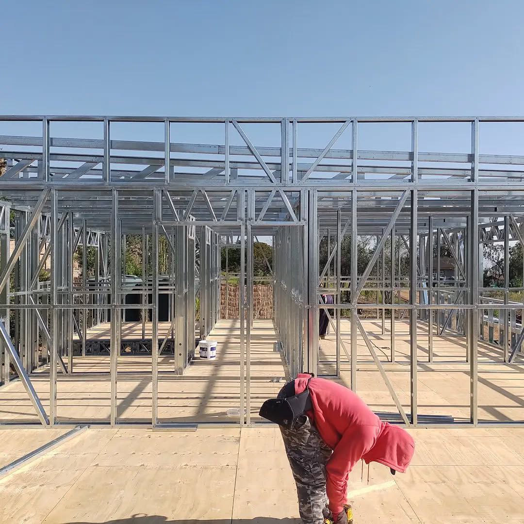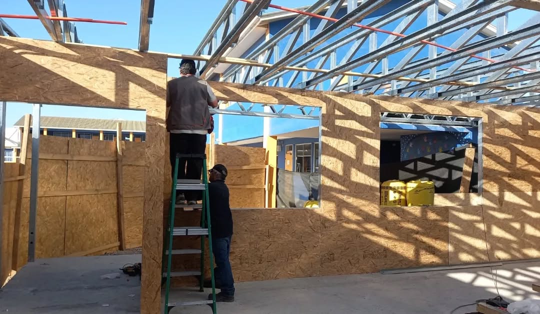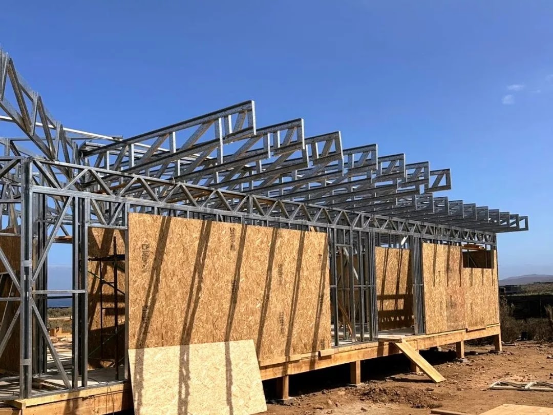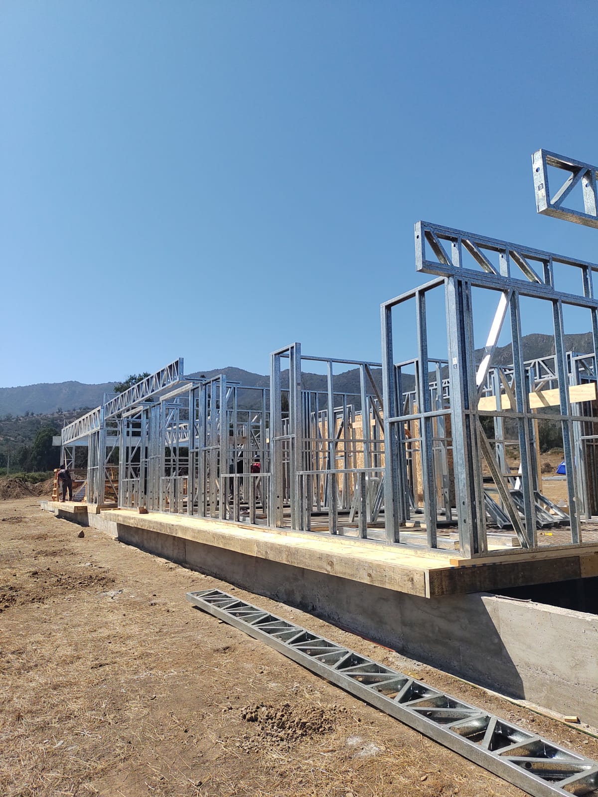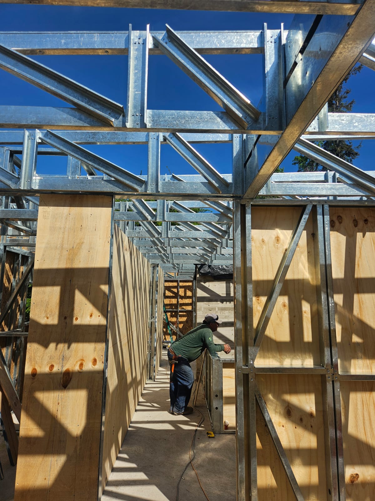La instalación de una estructura en acero liviano tipo SteelFrame, con diseño de techo mediterráneo. La obra muestra un avance eficiente en el montaje, combinando precisión estructural y un sistema de paneles que permite un proceso rápido, limpio y ordenado.