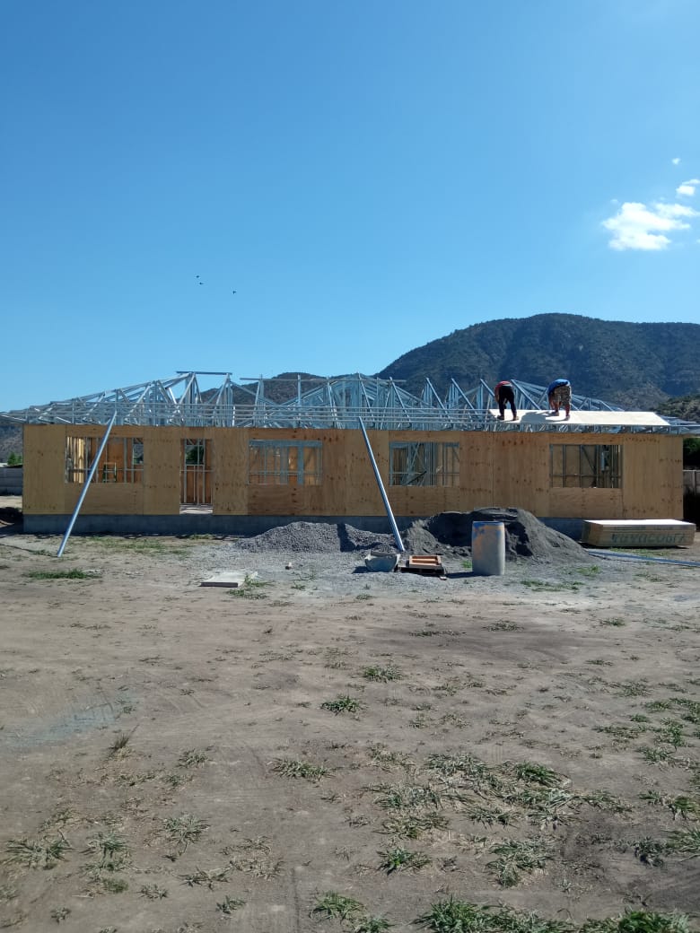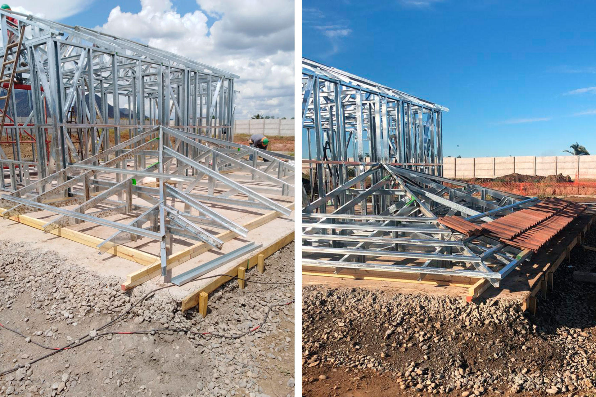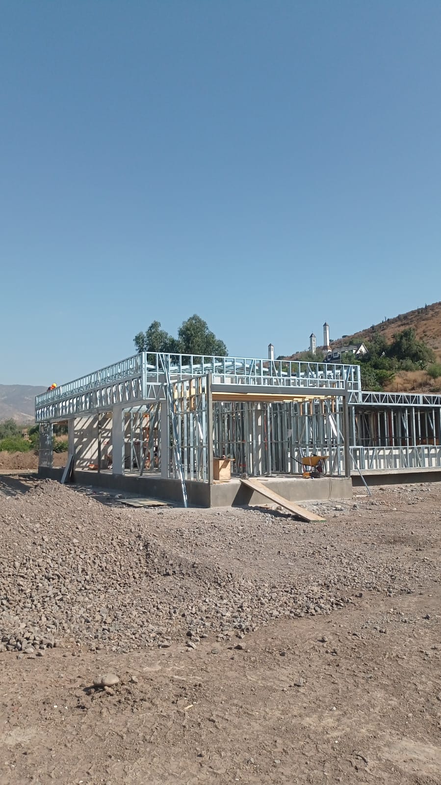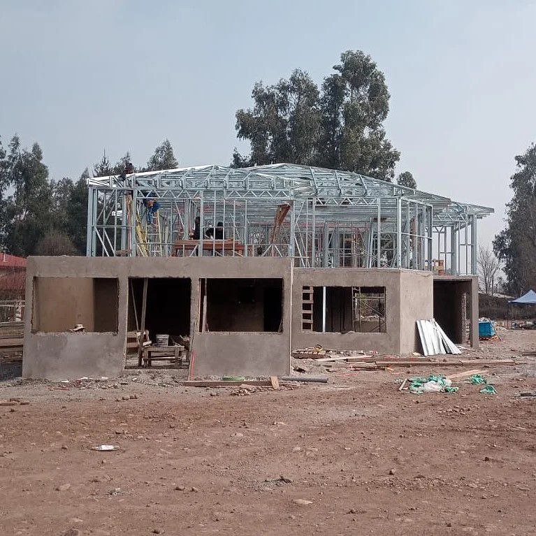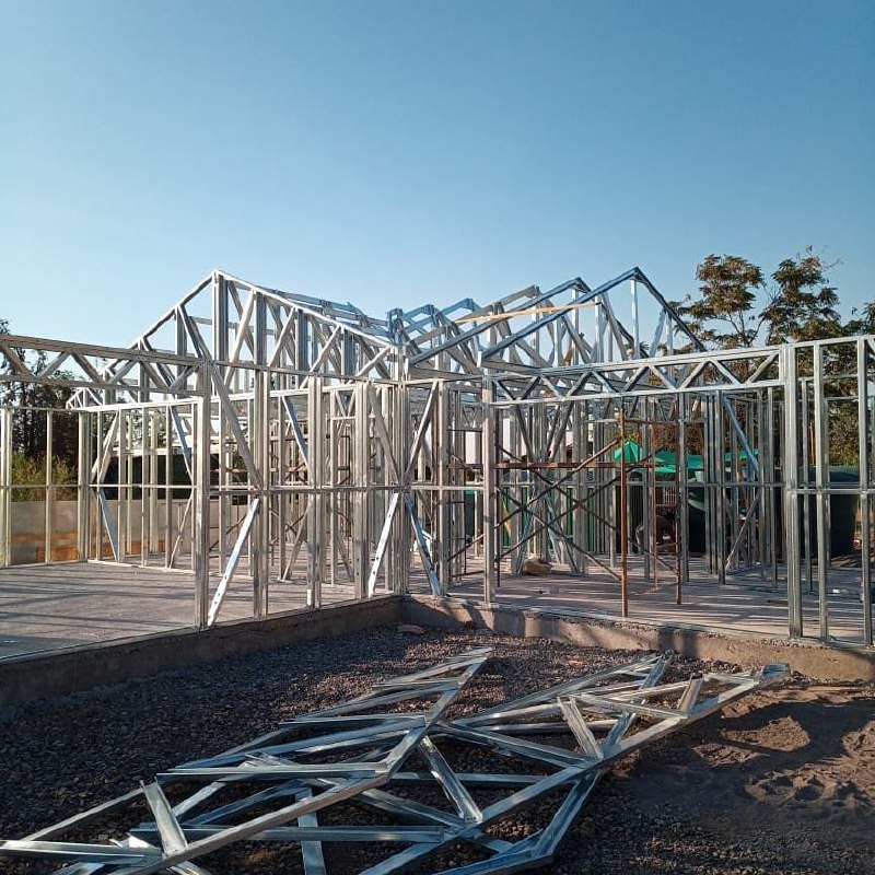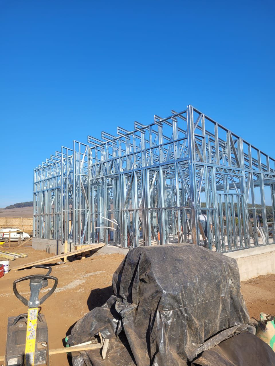 La instalación de una estructura en acero liviano tipo SteelFrame, con diseño de techo mediterráneo. La obra muestra un avance eficiente en el montaje, combinando precisión estructural y un sistema de paneles que permite un proceso rápido, limpio y ordenado.