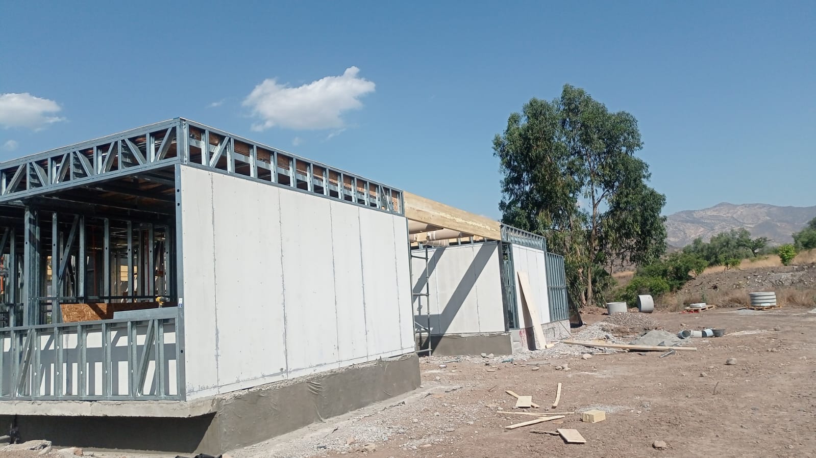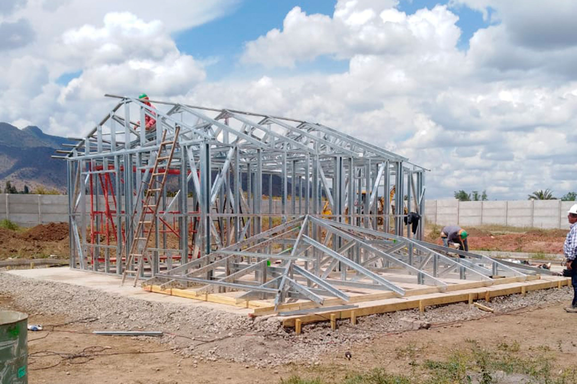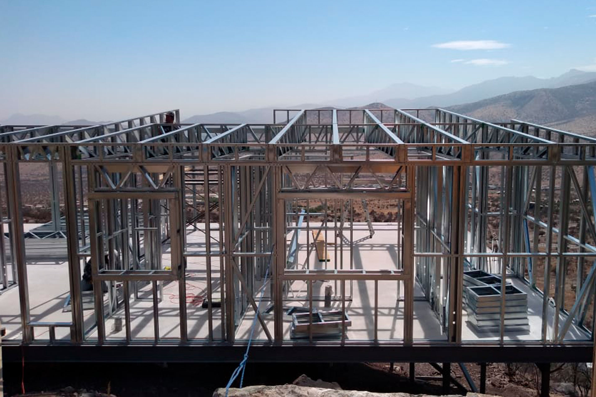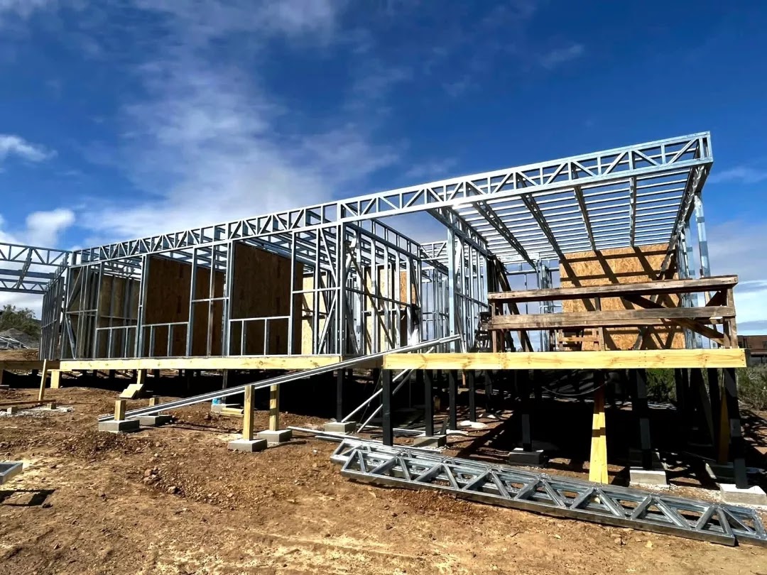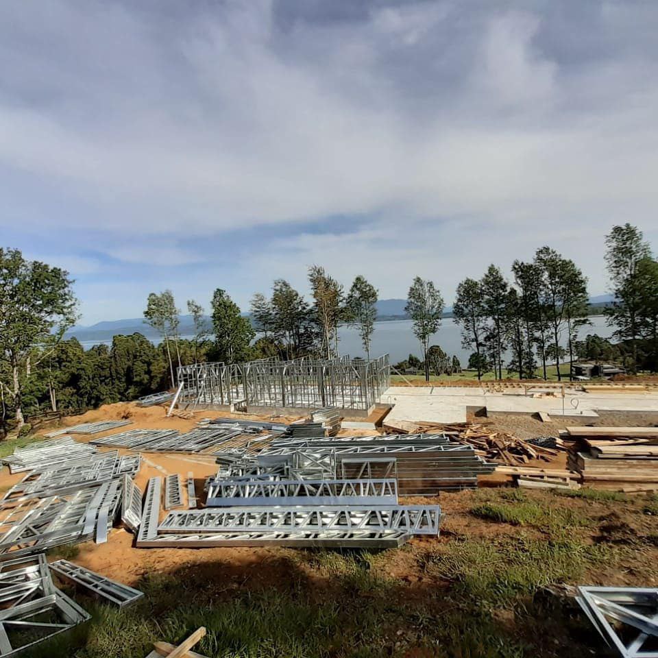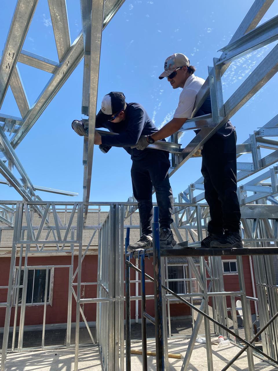 La instalación de una estructura en acero liviano tipo SteelFrame, con diseño de techo mediterráneo. La obra muestra un avance eficiente en el montaje, combinando precisión estructural y un sistema de paneles que permite un proceso rápido, limpio y ordenado.