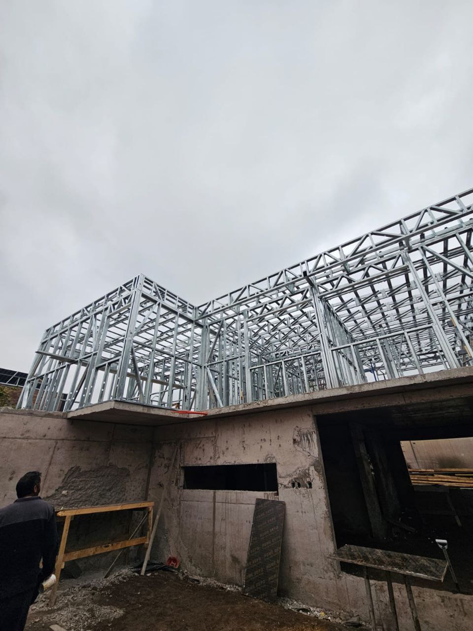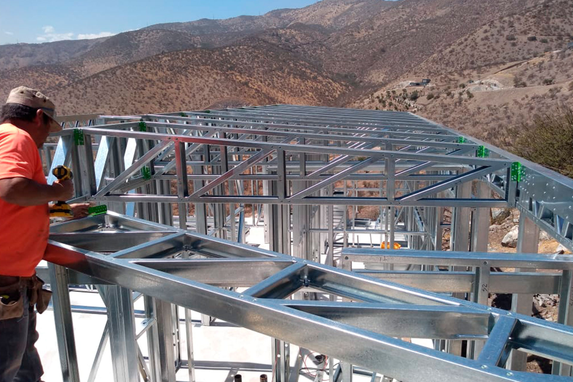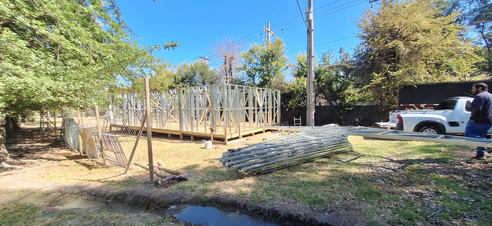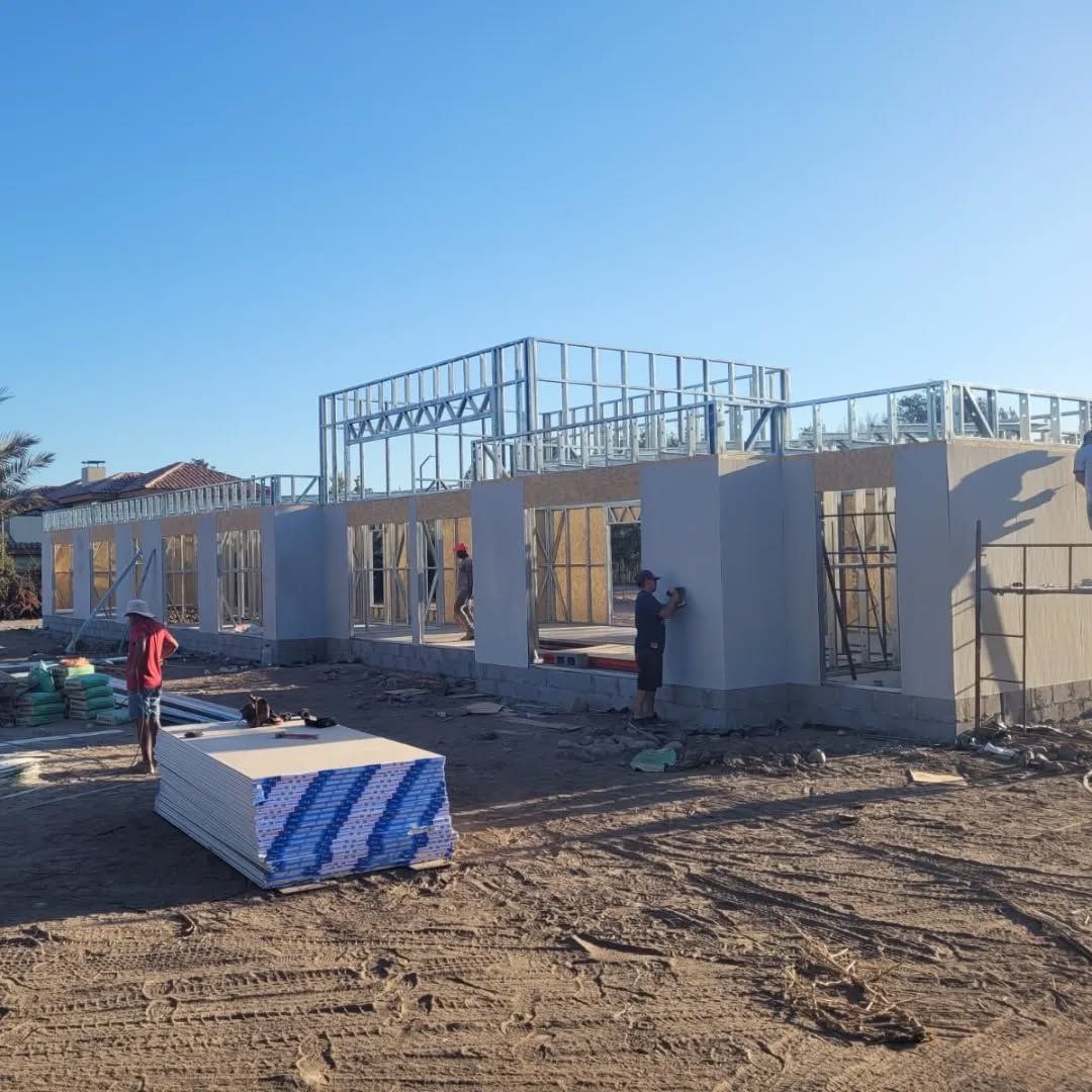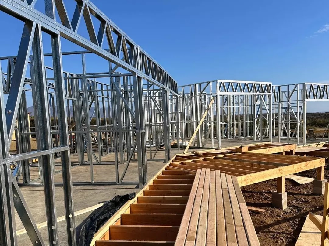 La instalación de una estructura en acero liviano tipo SteelFrame, con diseño de techo mediterráneo. La obra muestra un avance eficiente en el montaje, combinando precisión estructural y un sistema de paneles que permite un proceso rápido, limpio y ordenado.