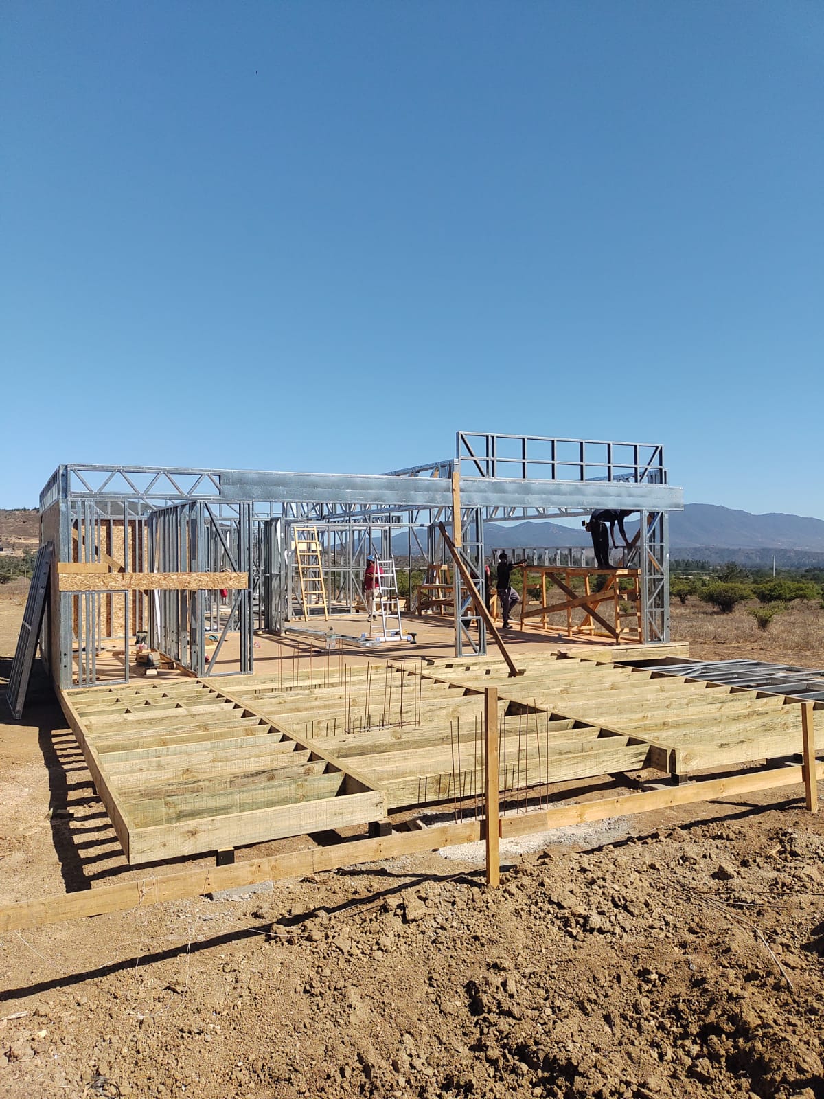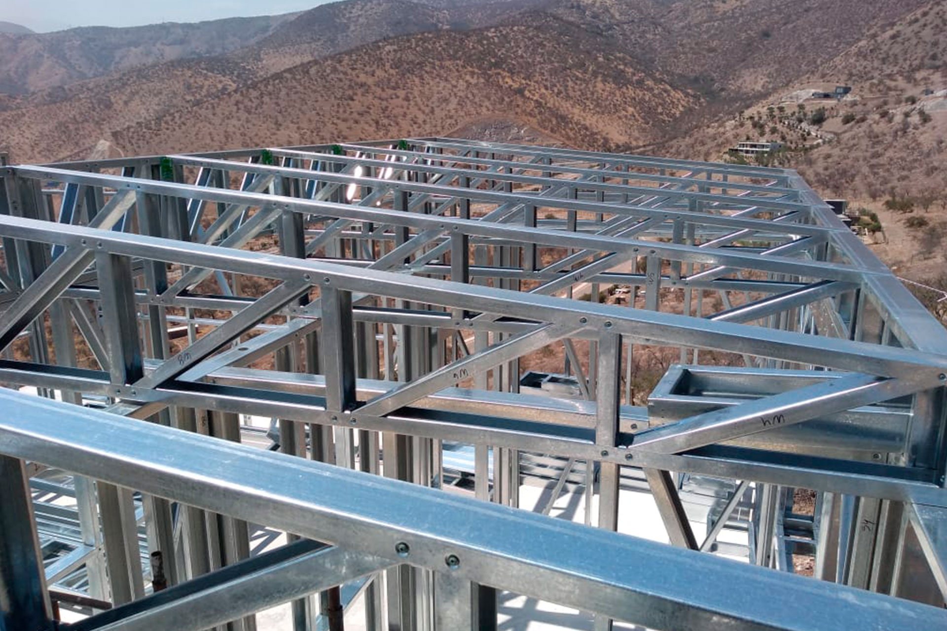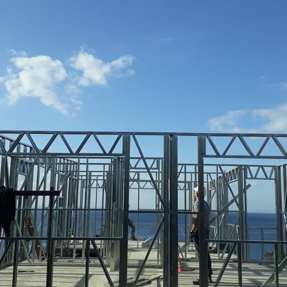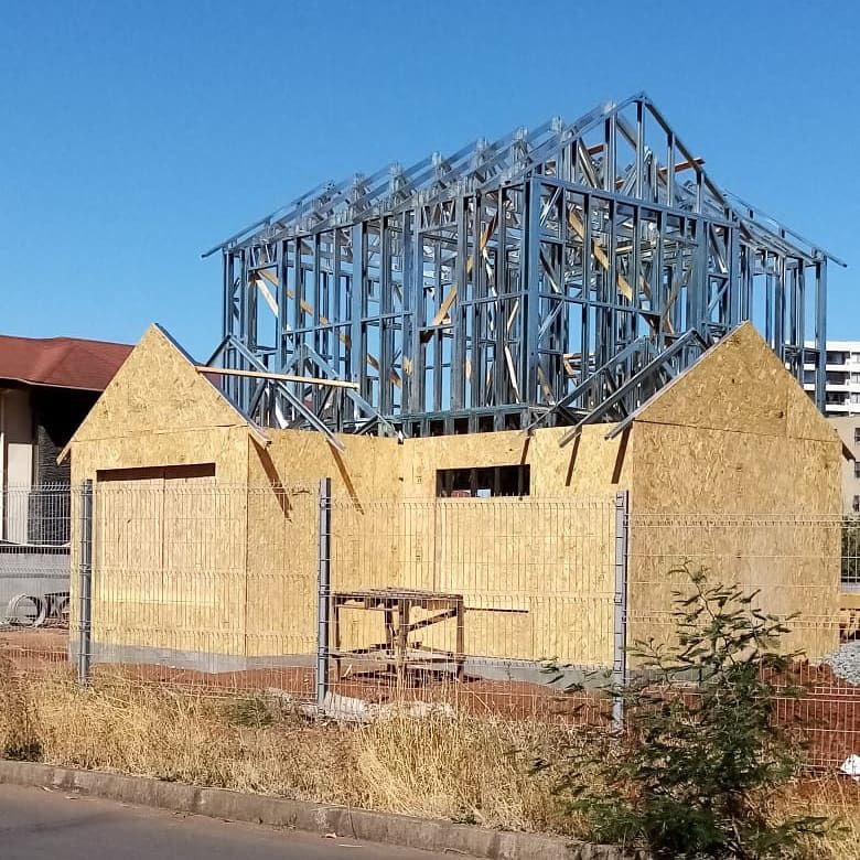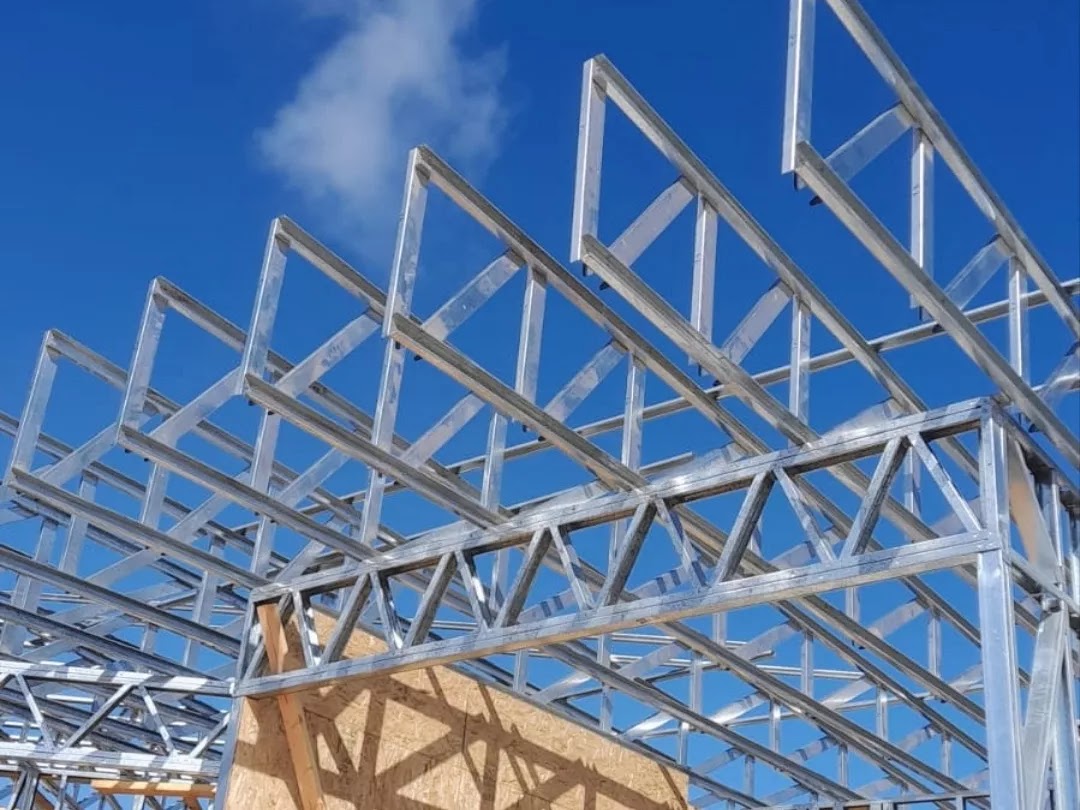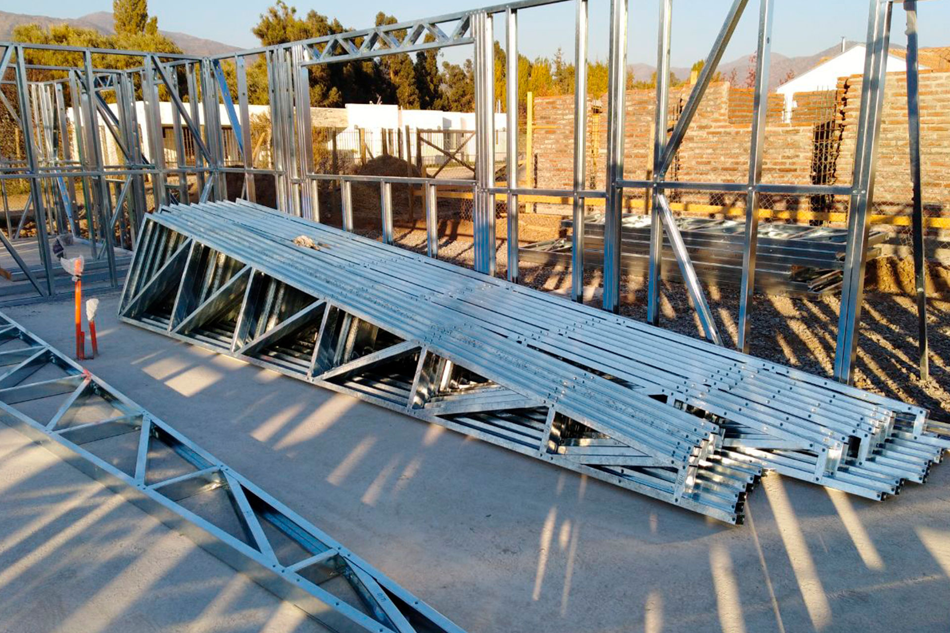 La instalación de una estructura en acero liviano tipo SteelFrame, con diseño de techo mediterráneo. La obra muestra un avance eficiente en el montaje, combinando precisión estructural y un sistema de paneles que permite un proceso rápido, limpio y ordenado.