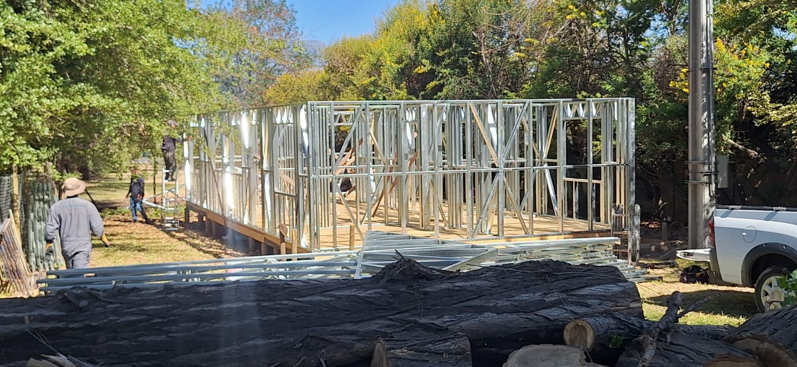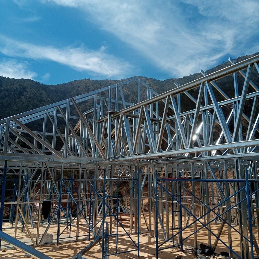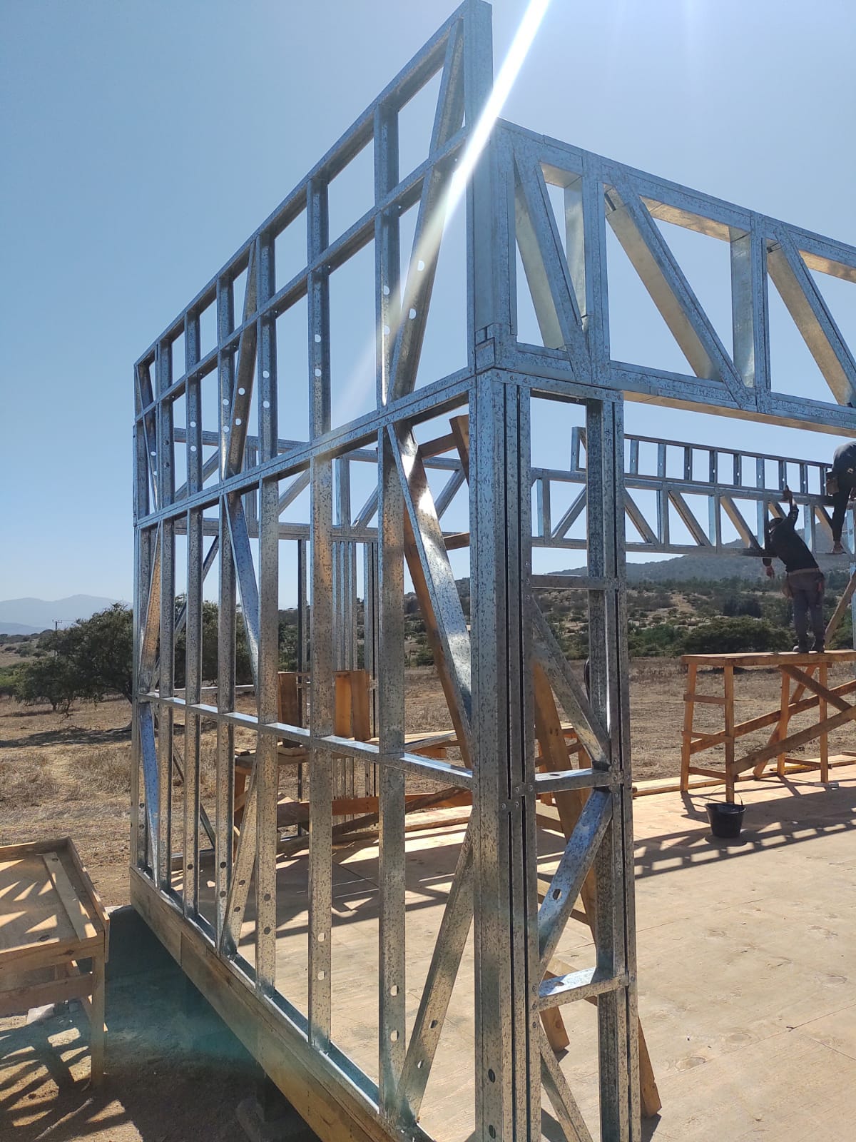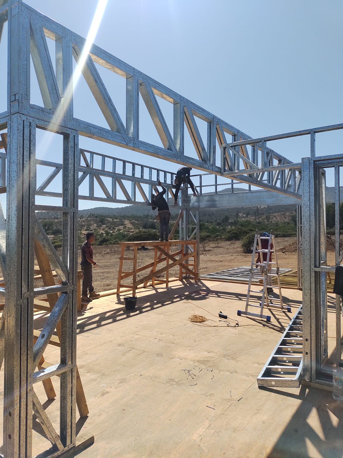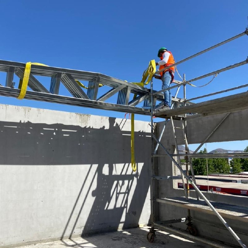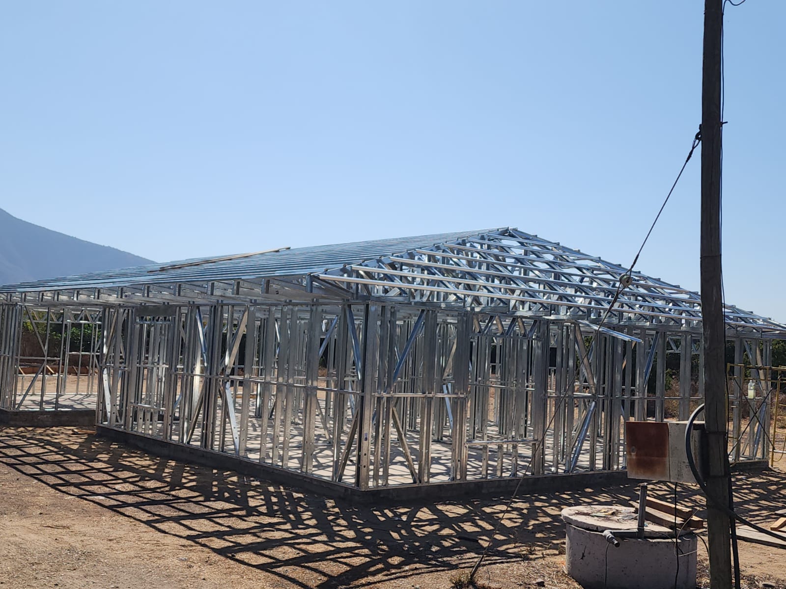 La instalación de una estructura en acero liviano tipo SteelFrame, con diseño de techo mediterráneo. La obra muestra un avance eficiente en el montaje, combinando precisión estructural y un sistema de paneles que permite un proceso rápido, limpio y ordenado.