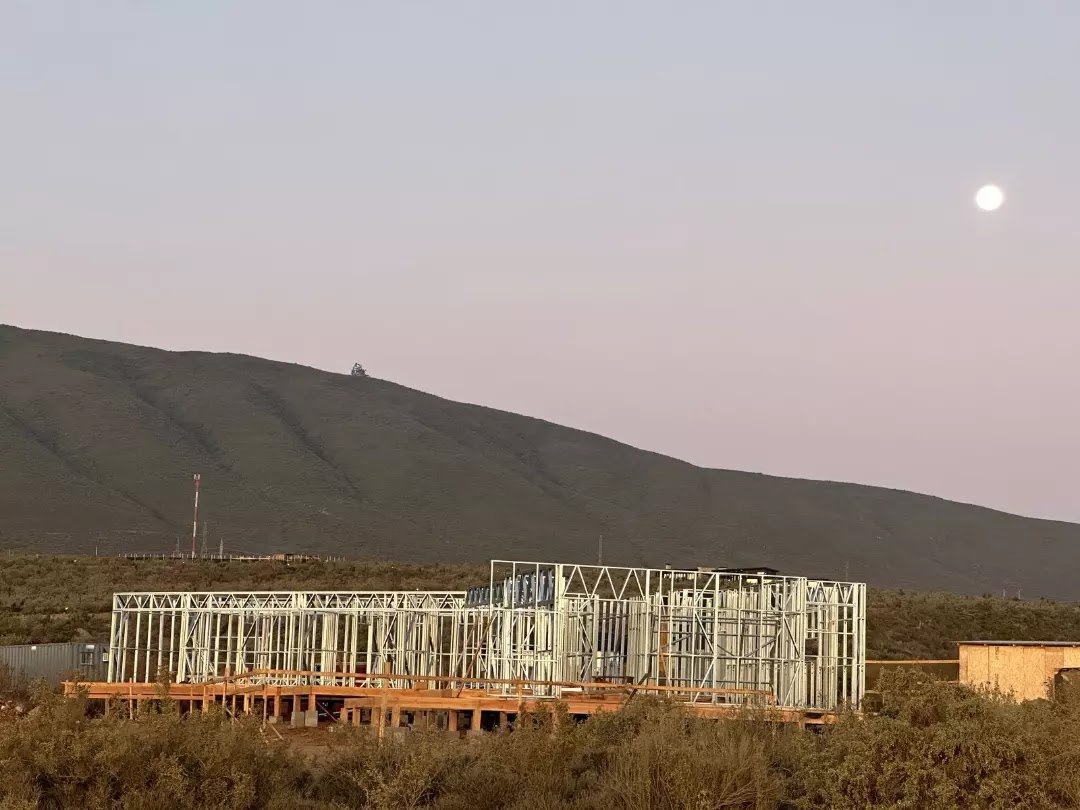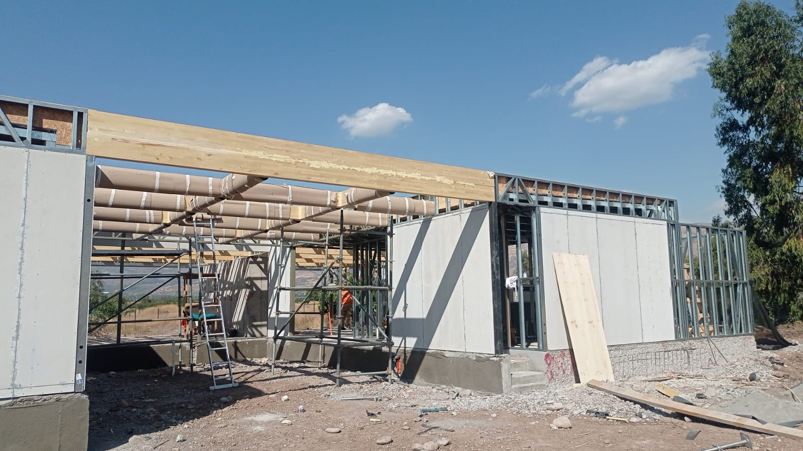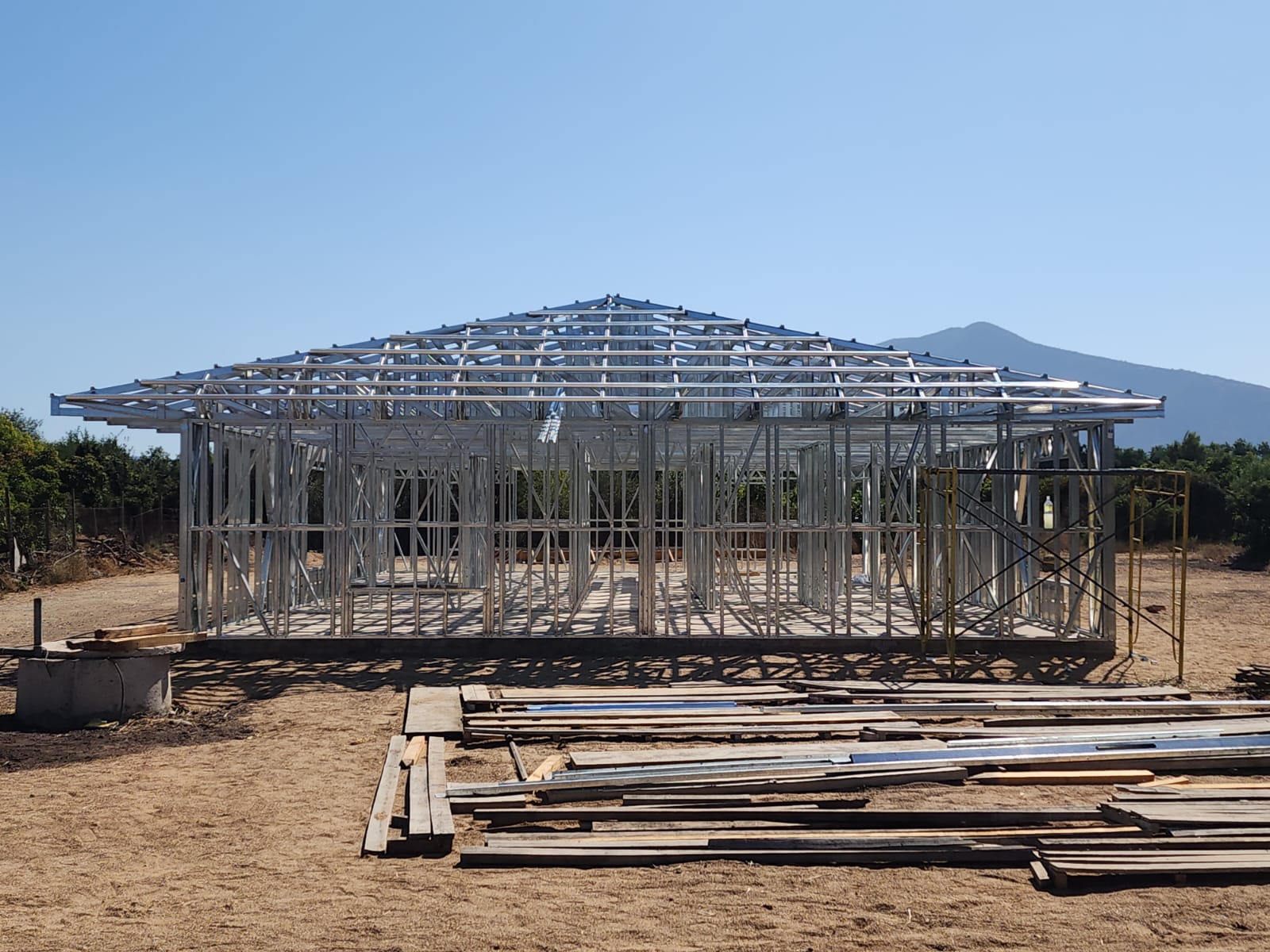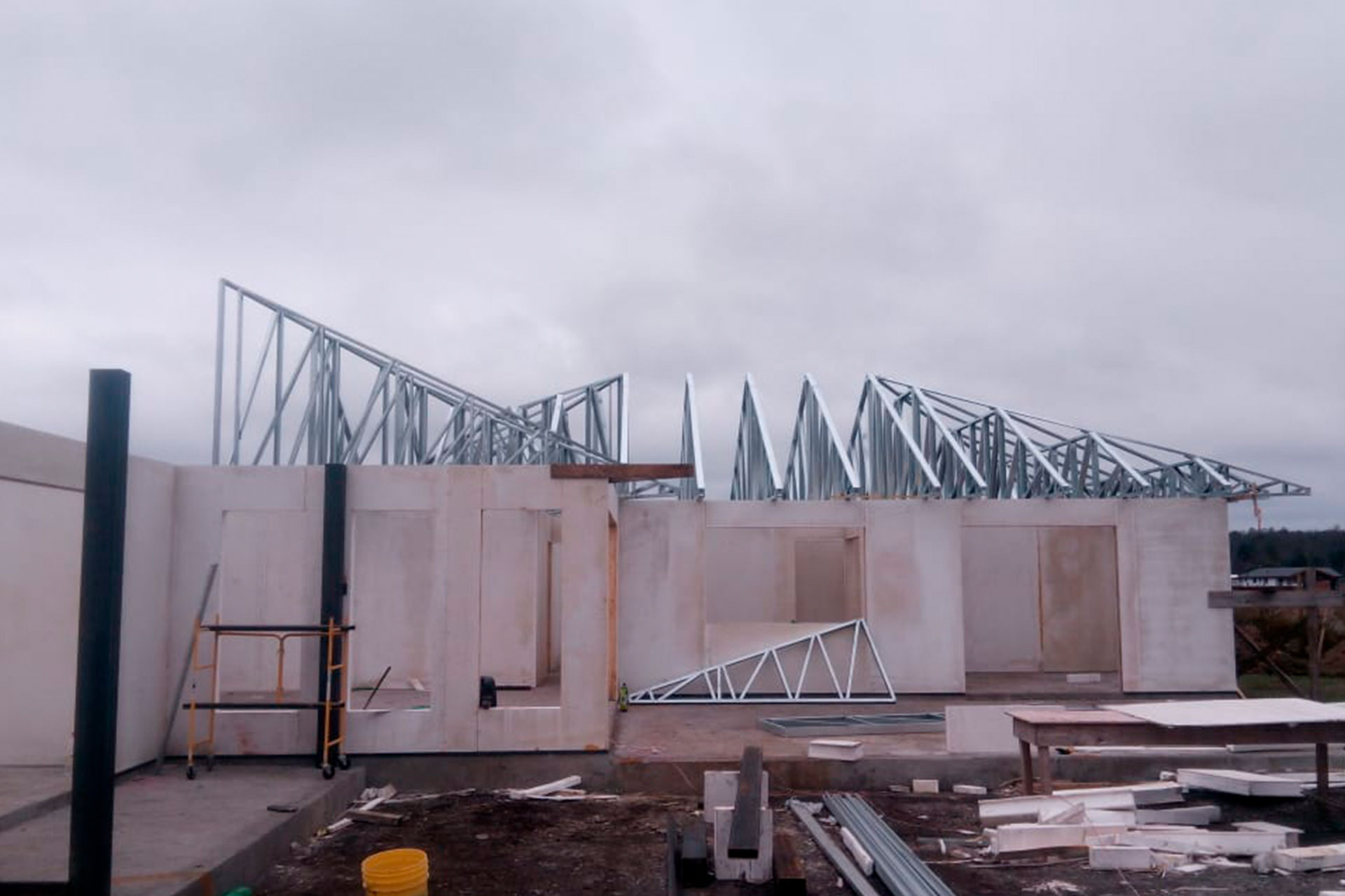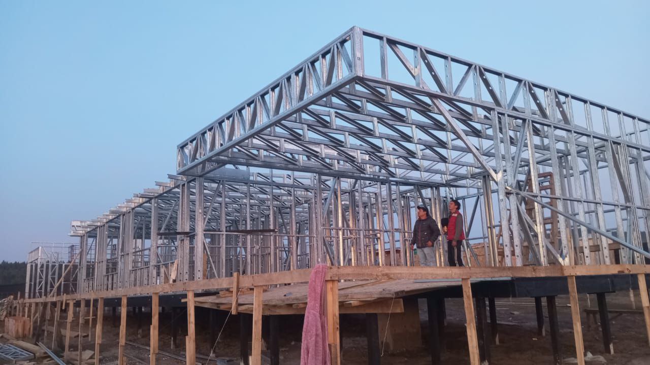 La instalación de una estructura en acero liviano tipo SteelFrame, con diseño de techo mediterráneo. La obra muestra un avance eficiente en el montaje, combinando precisión estructural y un sistema de paneles que permite un proceso rápido, limpio y ordenado.