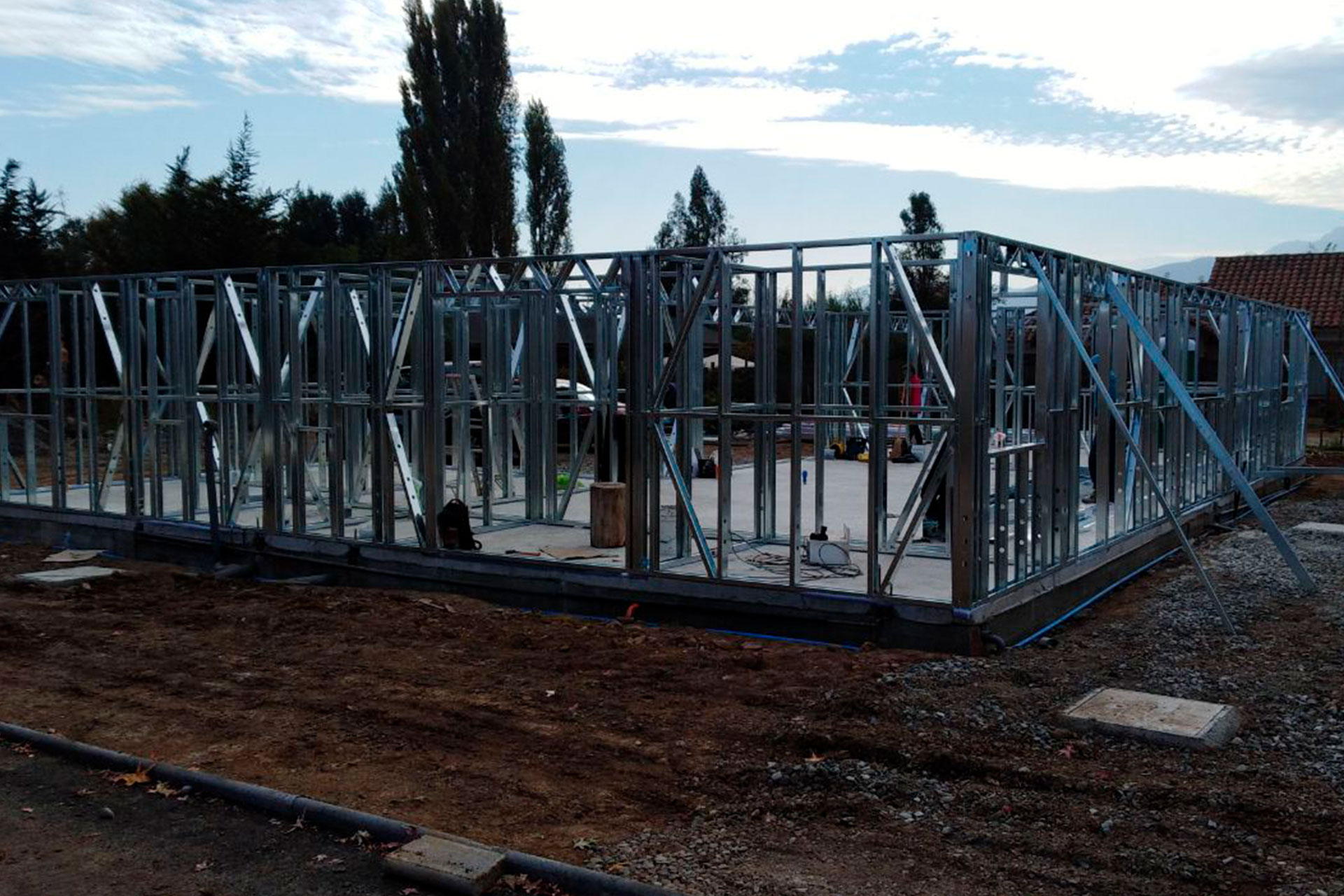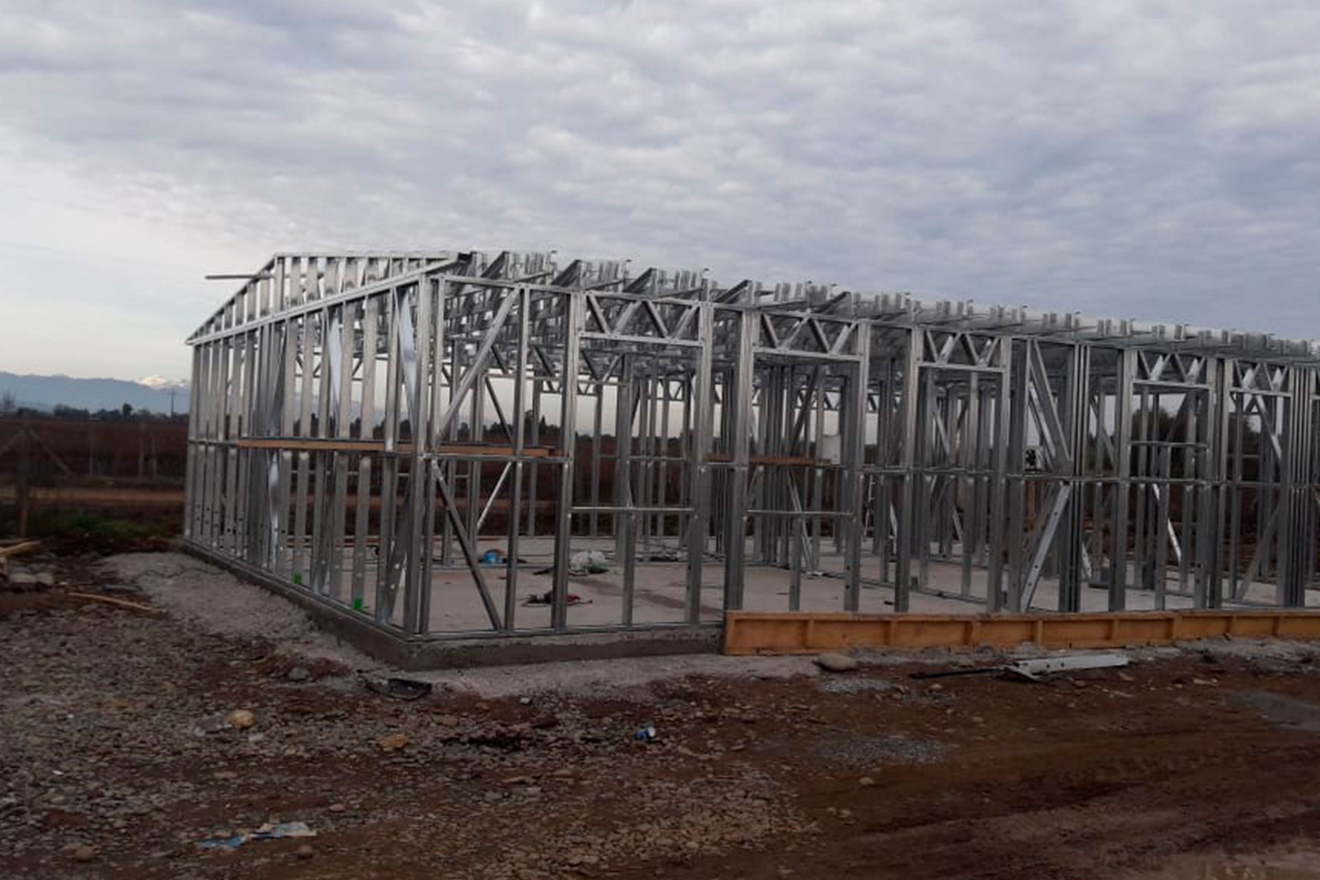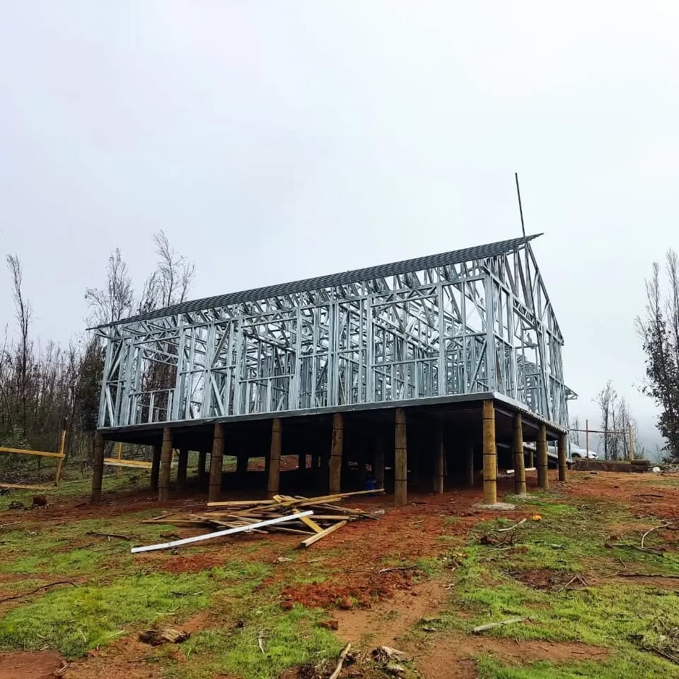 Proyecto de vivienda de 120 m², utilizando estructura de acero liviano tecnificado. La instalación se realizó sobre un radier con pendiente natural del terreno, optimizando el diseño estructural para adaptarse al desnivel. Una solución liviana, resistente y eficiente, ideal para zonas geográficas con topografía irregular.