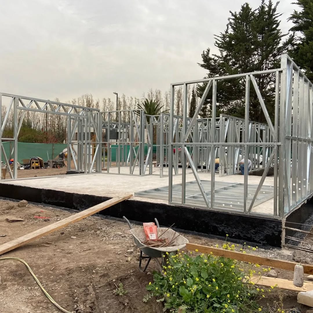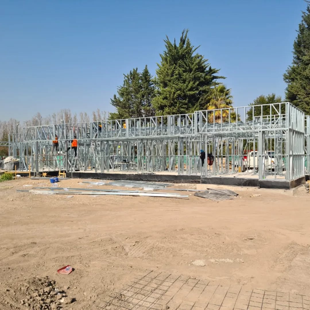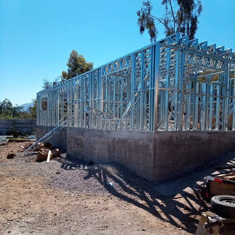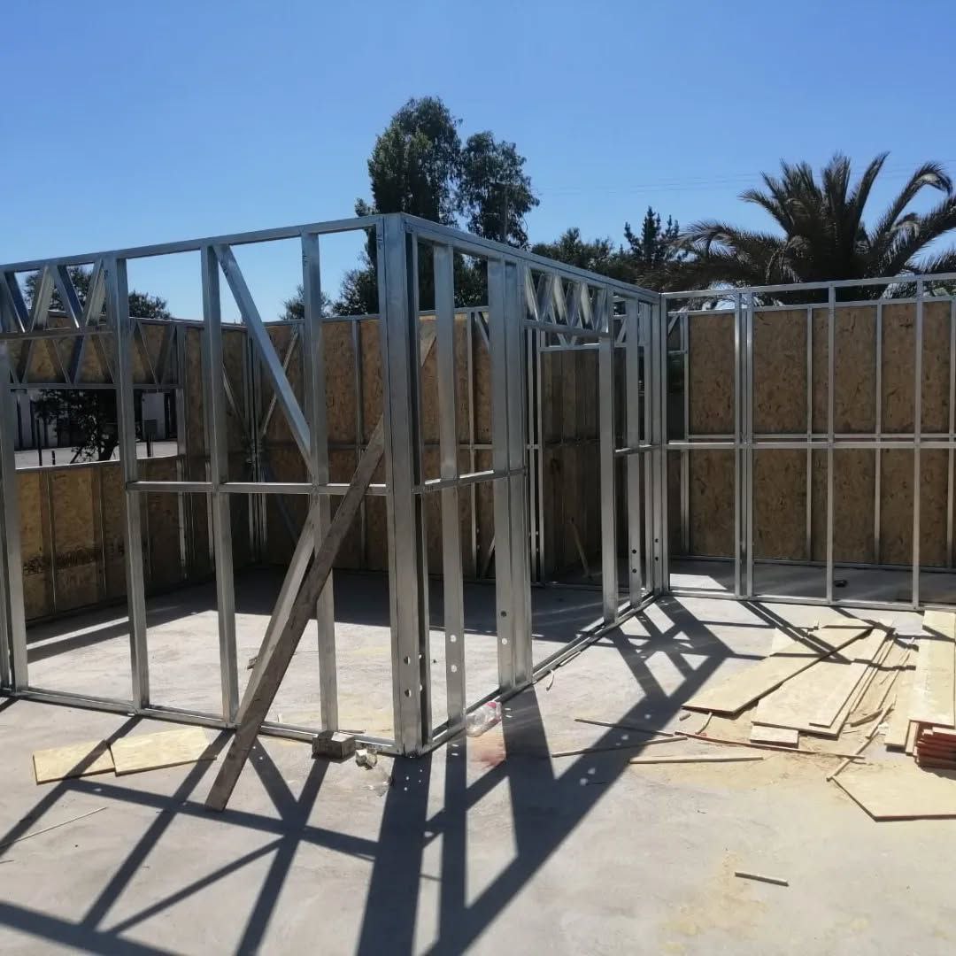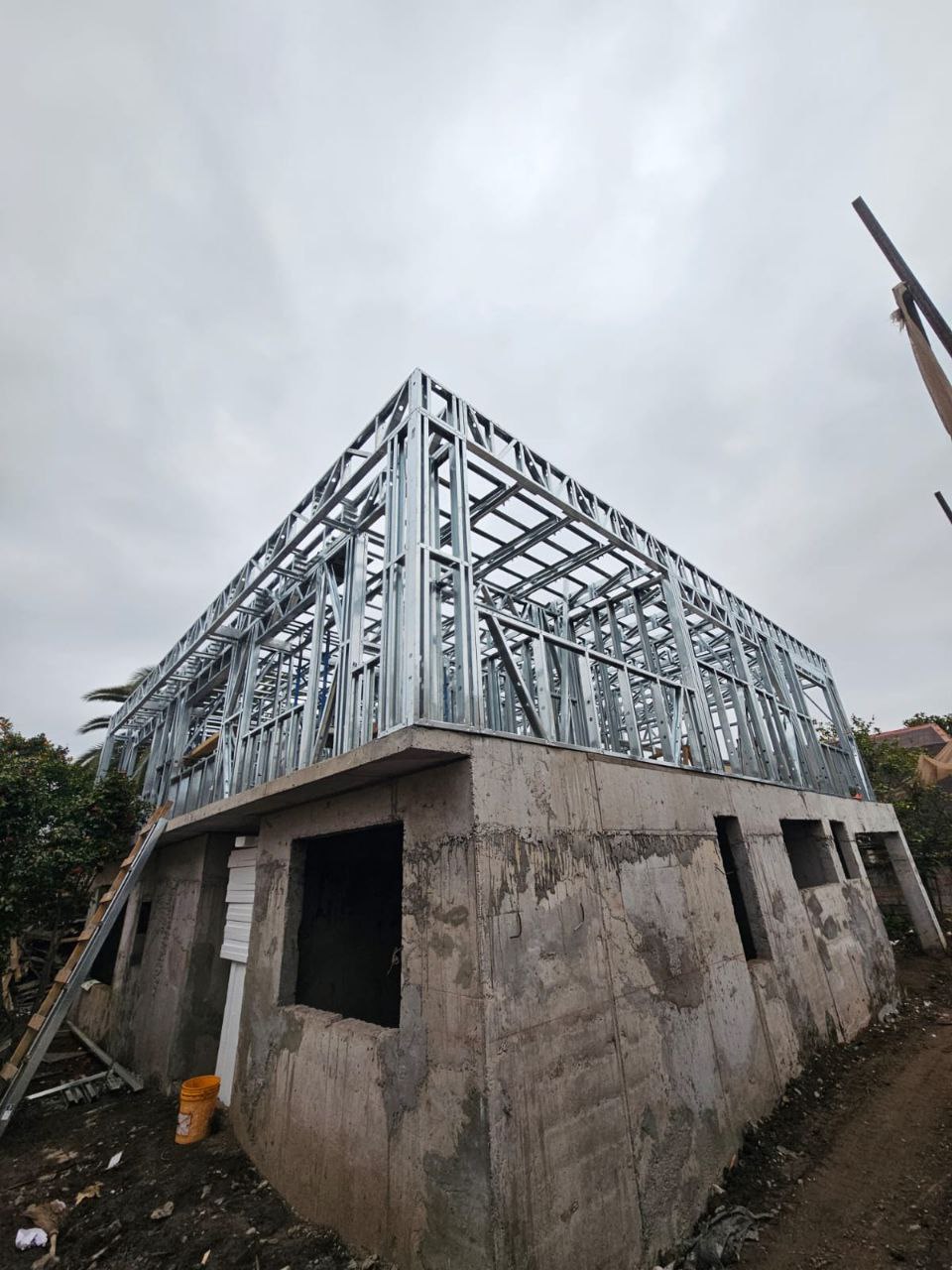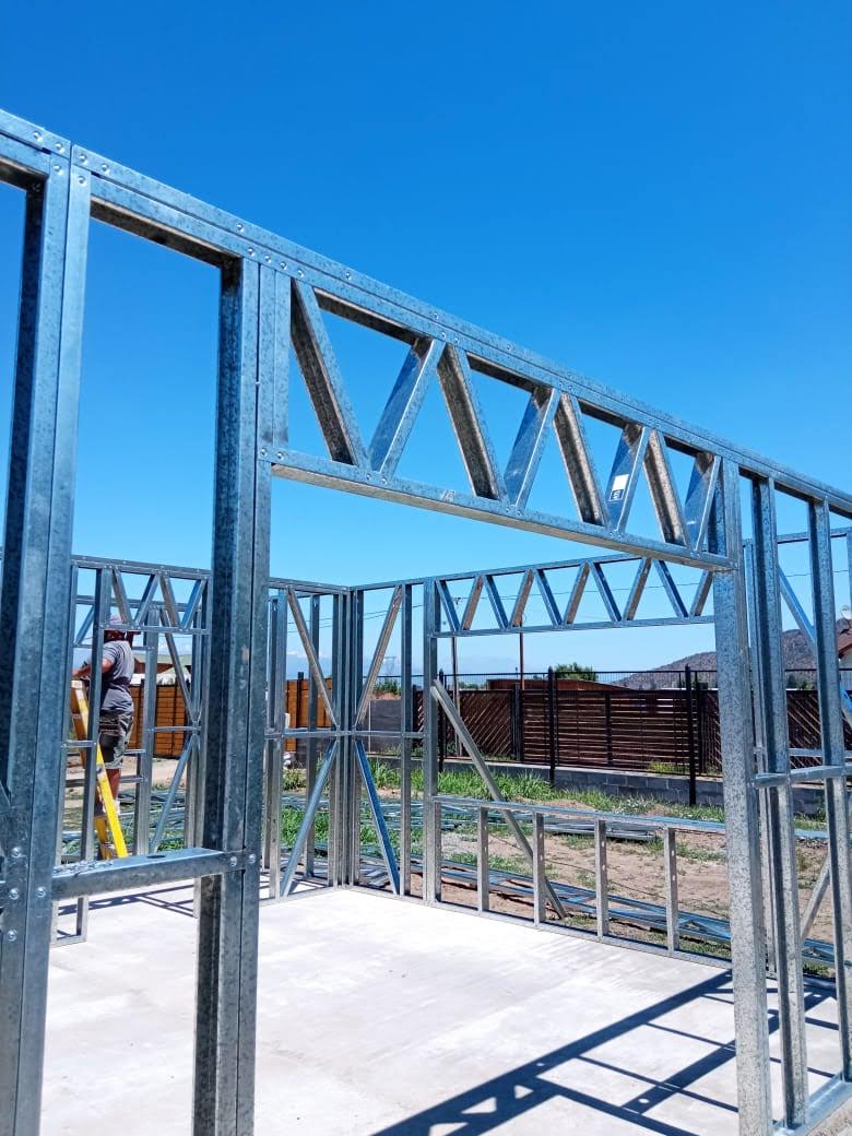 Está construida con perfiles de acero galvanizado tipo Steel Frame, una solución moderna, liviana y duradera, ideal para todo tipo de clima. La estructura ya se encuentra anclada sobre radier y cuenta con división de espacios claramente definidos, listos para recibir cerramientos y terminaciones. Este sistema permite una ejecución limpia, rápida y altamente precisa.