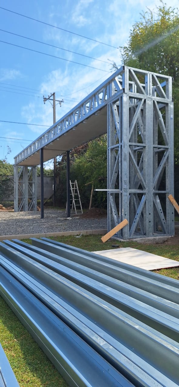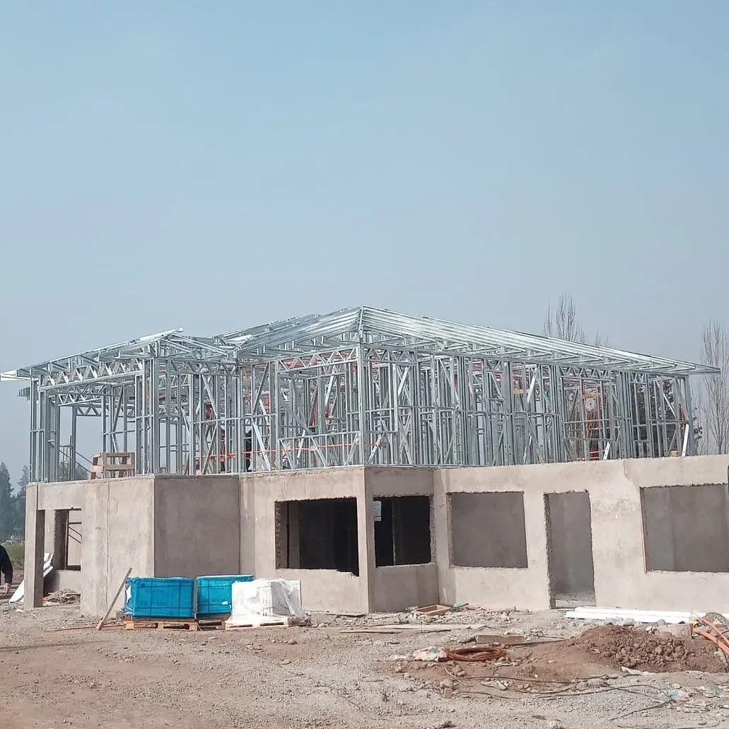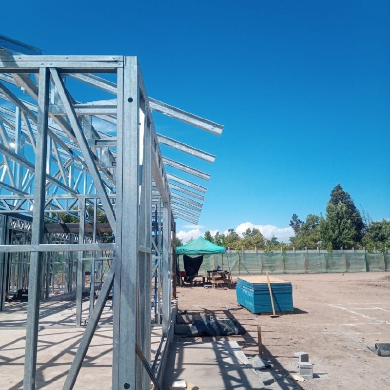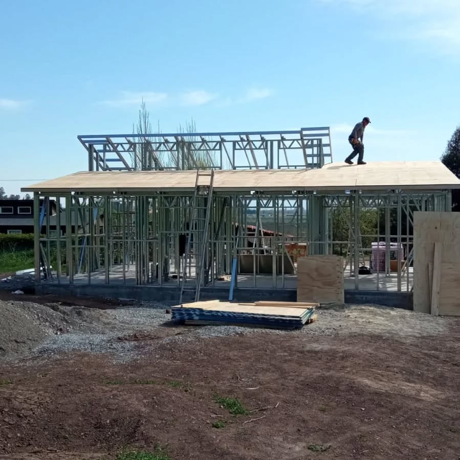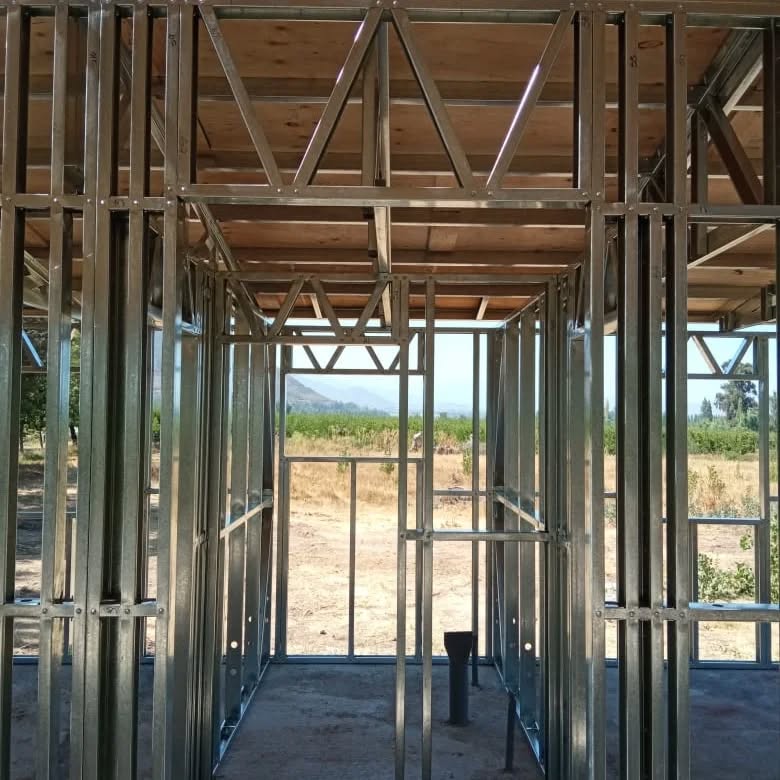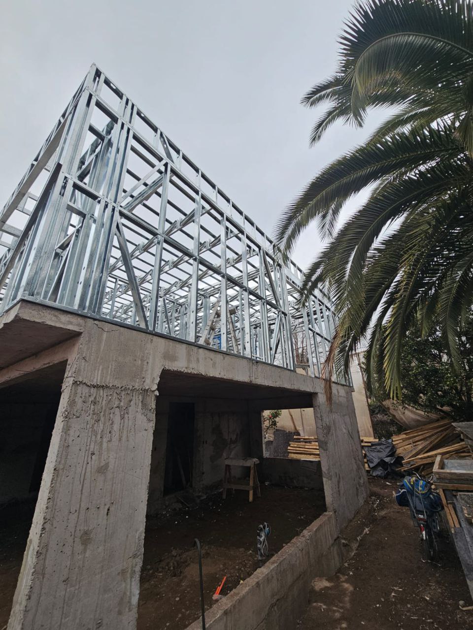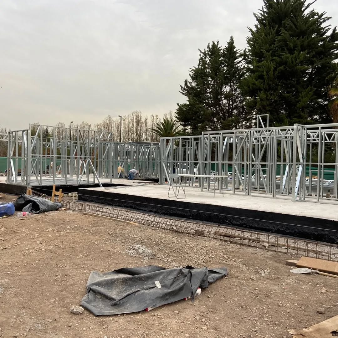 Está construida con perfiles de acero galvanizado tipo Steel Frame, una solución moderna, liviana y duradera, ideal para todo tipo de clima. La estructura ya se encuentra anclada sobre radier y cuenta con división de espacios claramente definidos, listos para recibir cerramientos y terminaciones. Este sistema permite una ejecución limpia, rápida y altamente precisa.