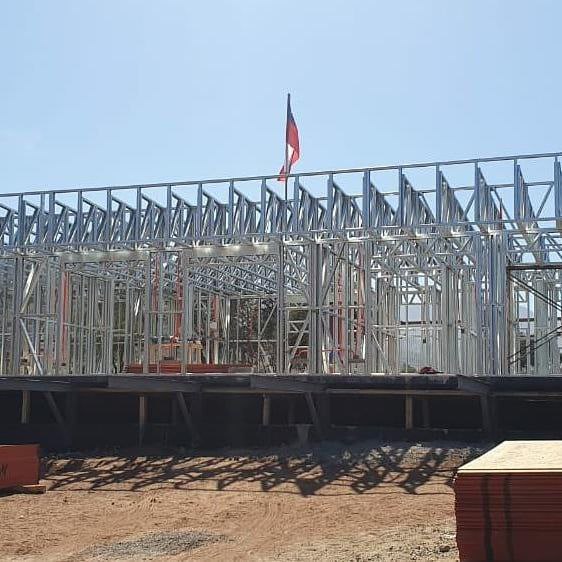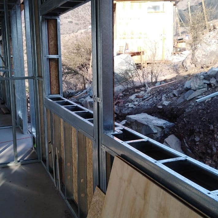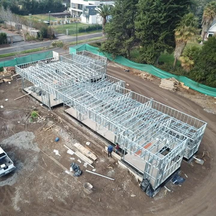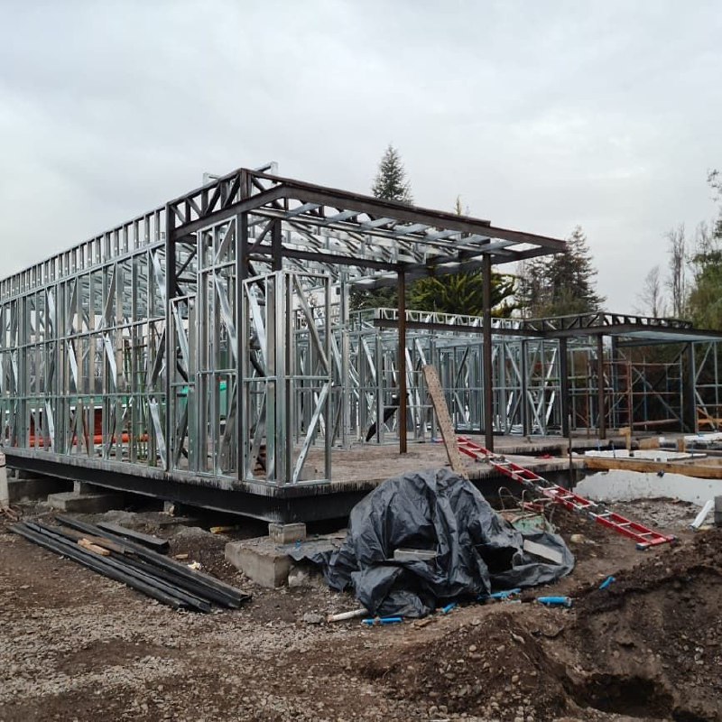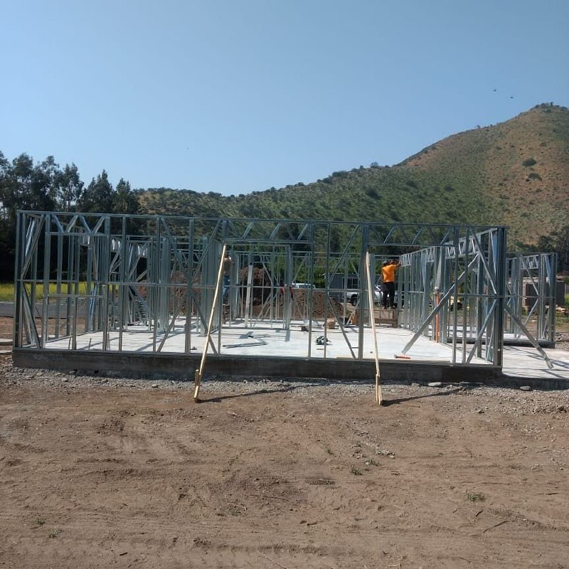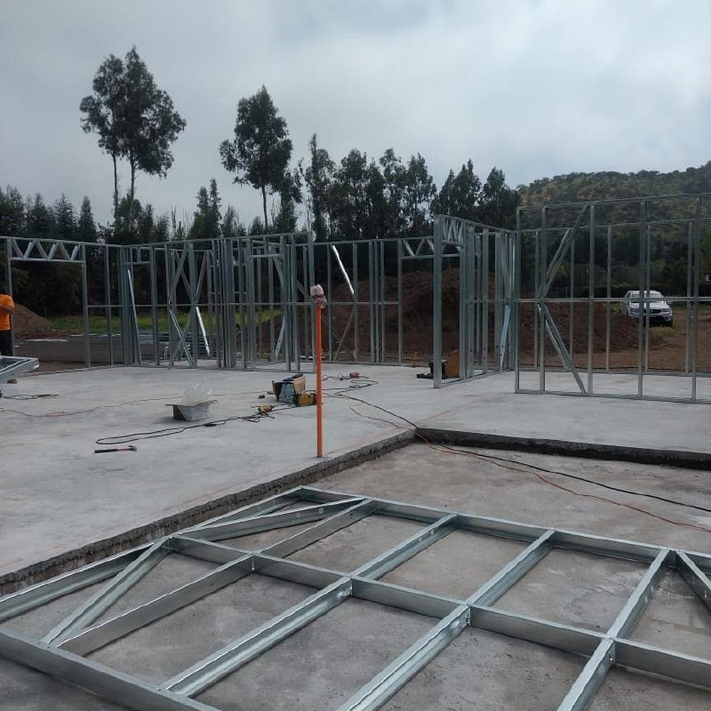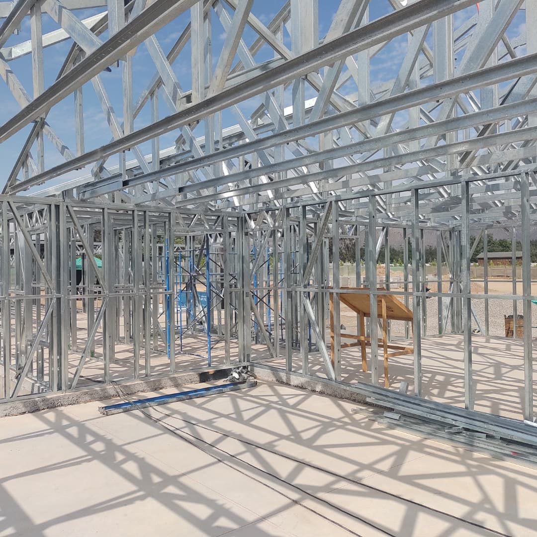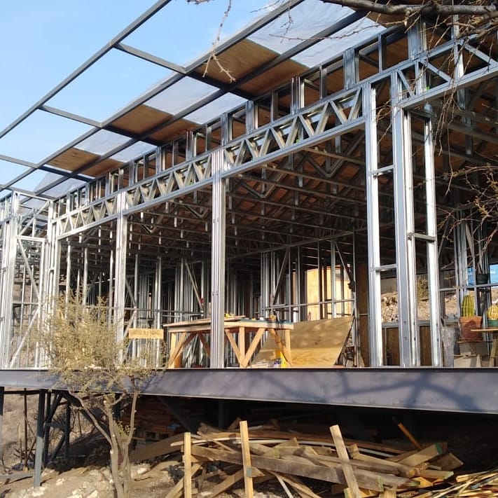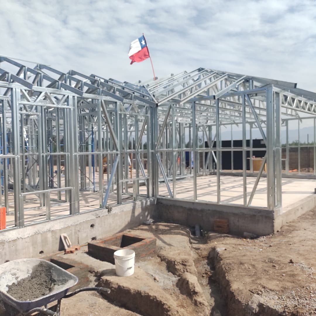 Está construida con perfiles de acero galvanizado tipo Steel Frame, una solución moderna, liviana y duradera, ideal para todo tipo de clima. La estructura ya se encuentra anclada sobre radier y cuenta con división de espacios claramente definidos, listos para recibir cerramientos y terminaciones. Este sistema permite una ejecución limpia, rápida y altamente precisa.