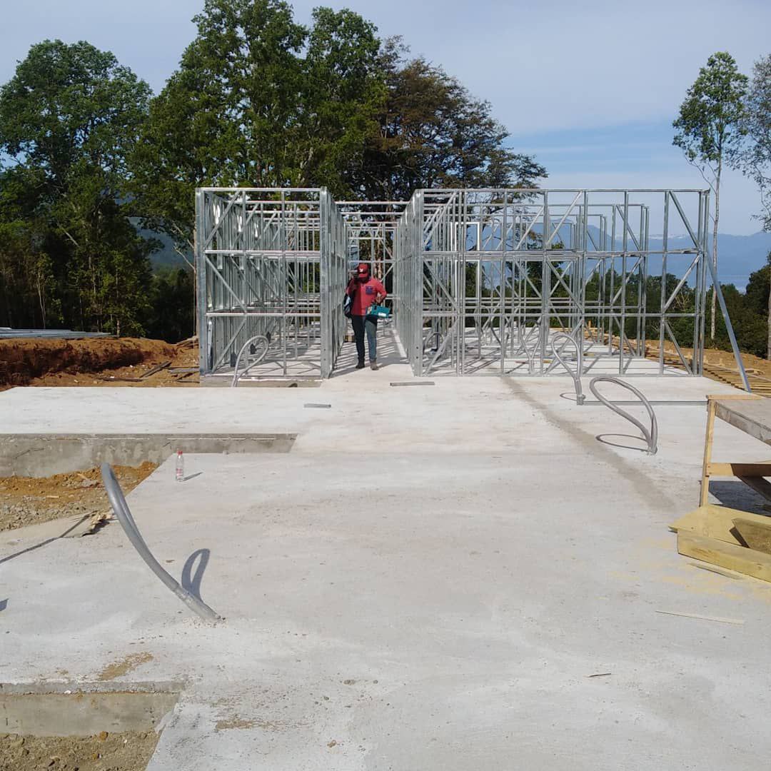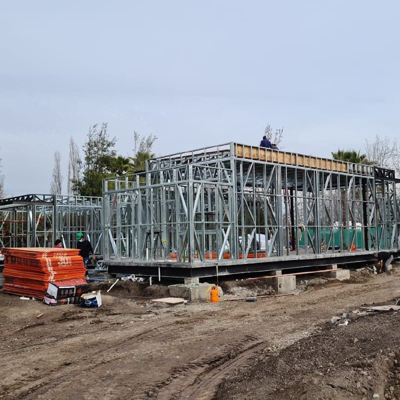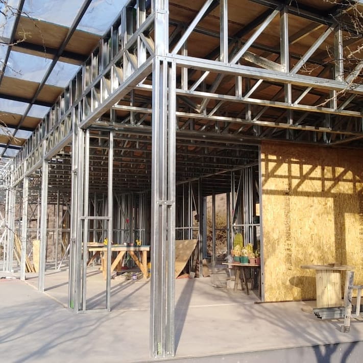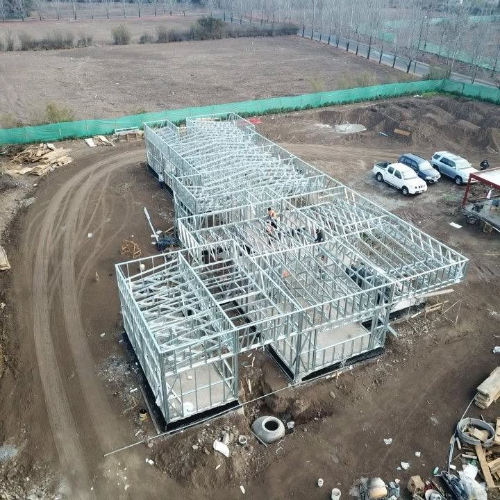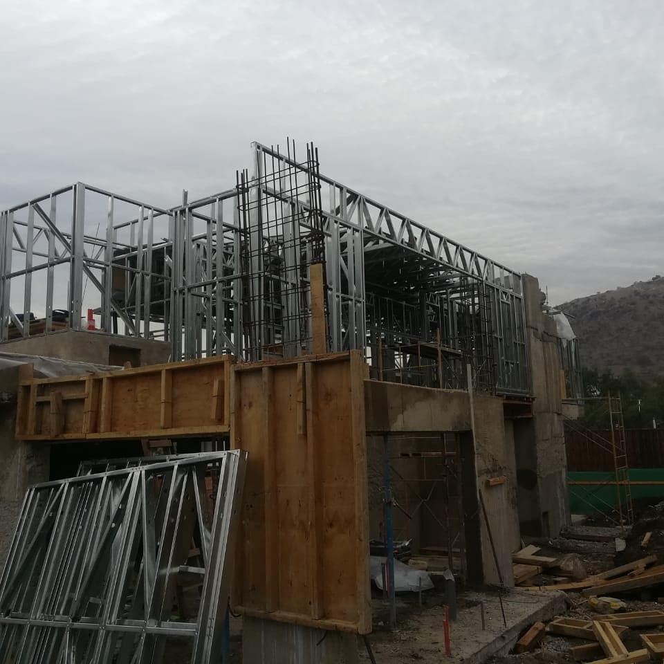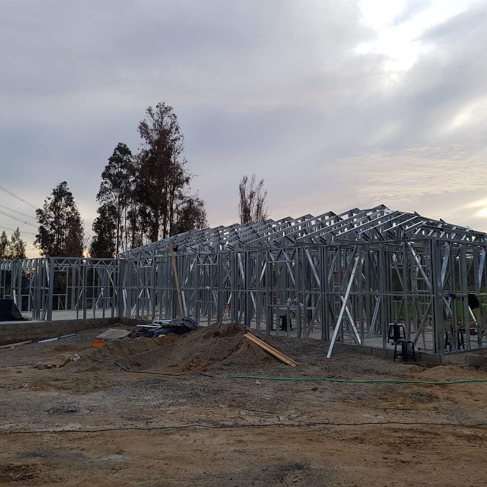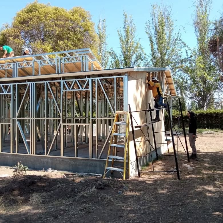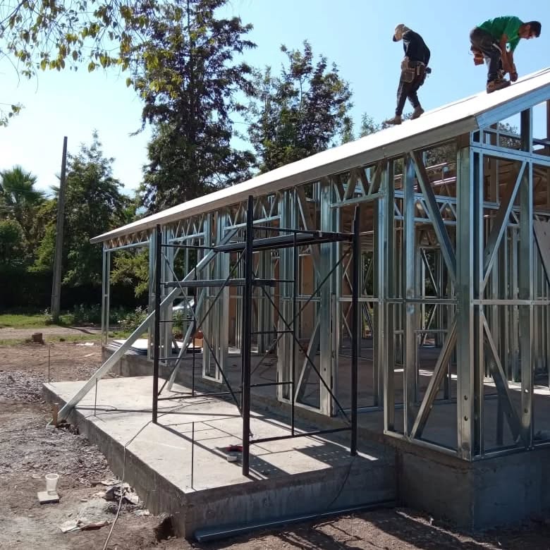 Está construida con perfiles de acero galvanizado tipo Steel Frame, una solución moderna, liviana y duradera, ideal para todo tipo de clima. La estructura ya se encuentra anclada sobre radier y cuenta con división de espacios claramente definidos, listos para recibir cerramientos y terminaciones. Este sistema permite una ejecución limpia, rápida y altamente precisa.