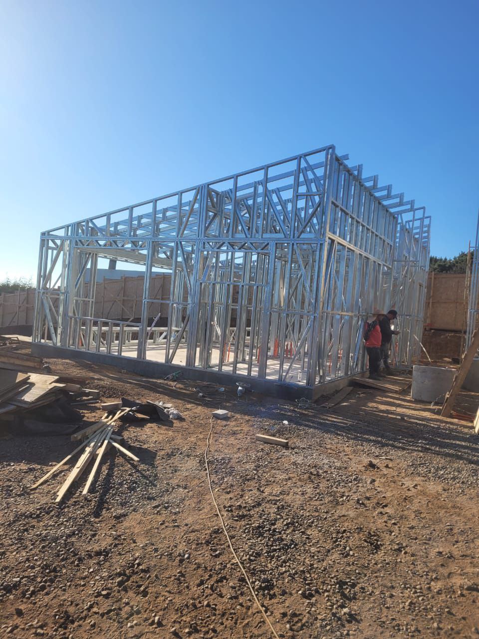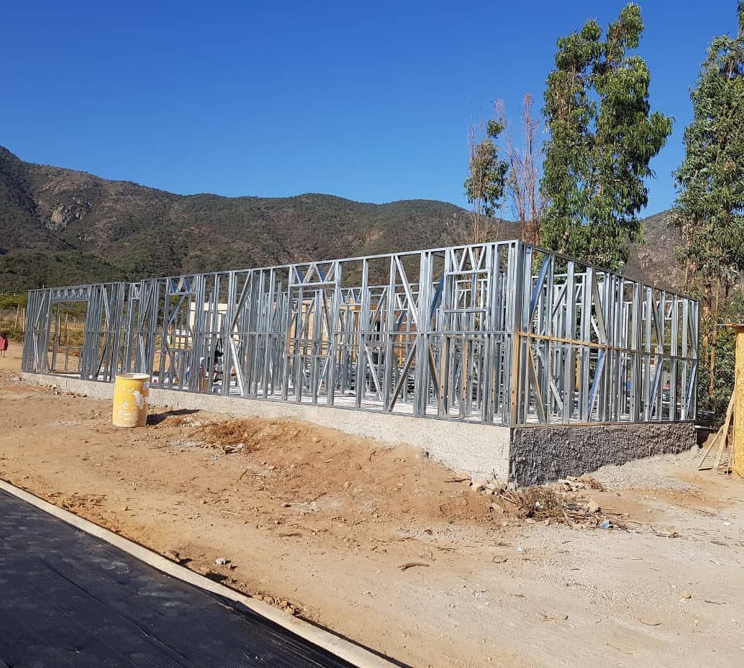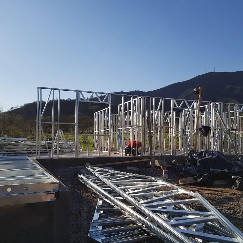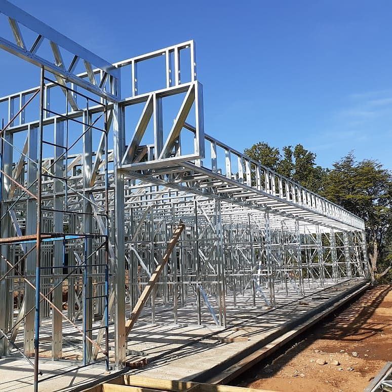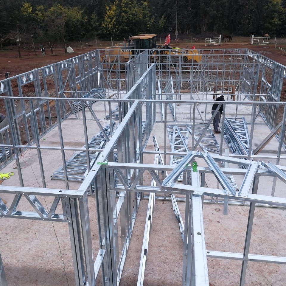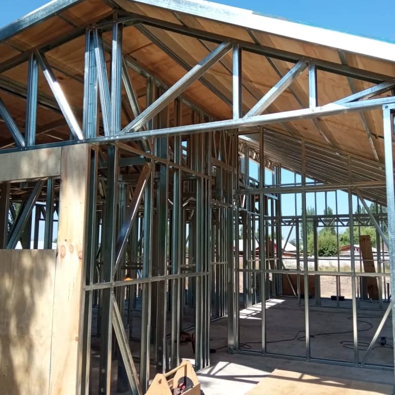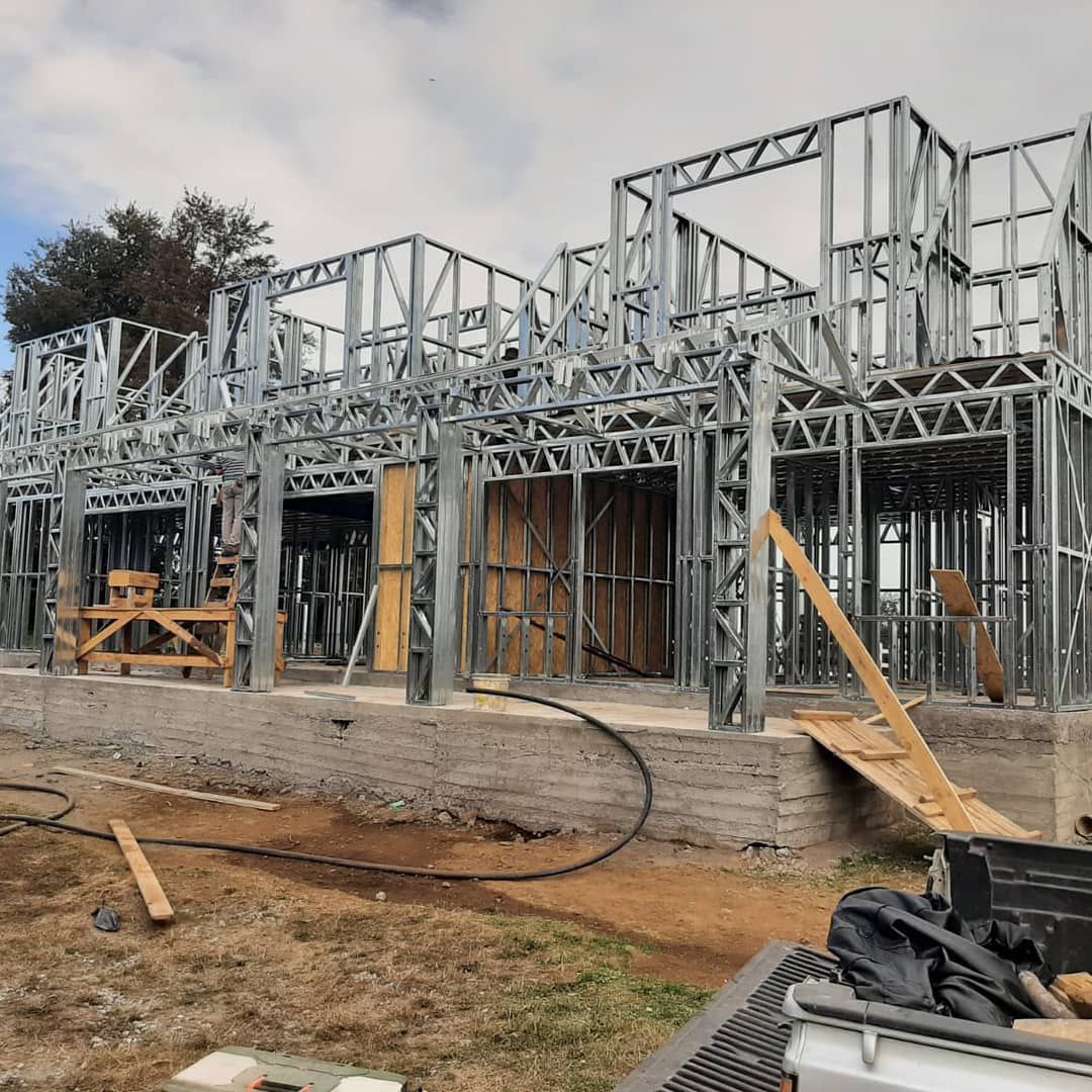 Está construida con perfiles de acero galvanizado tipo Steel Frame, una solución moderna, liviana y duradera, ideal para todo tipo de clima. La estructura ya se encuentra anclada sobre radier y cuenta con división de espacios claramente definidos, listos para recibir cerramientos y terminaciones. Este sistema permite una ejecución limpia, rápida y altamente precisa.