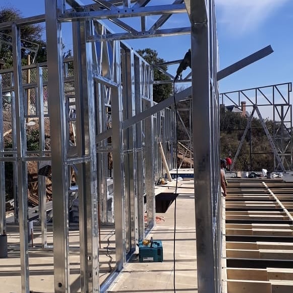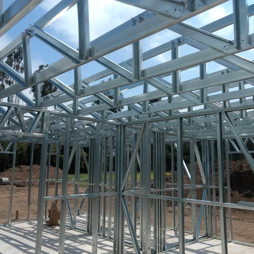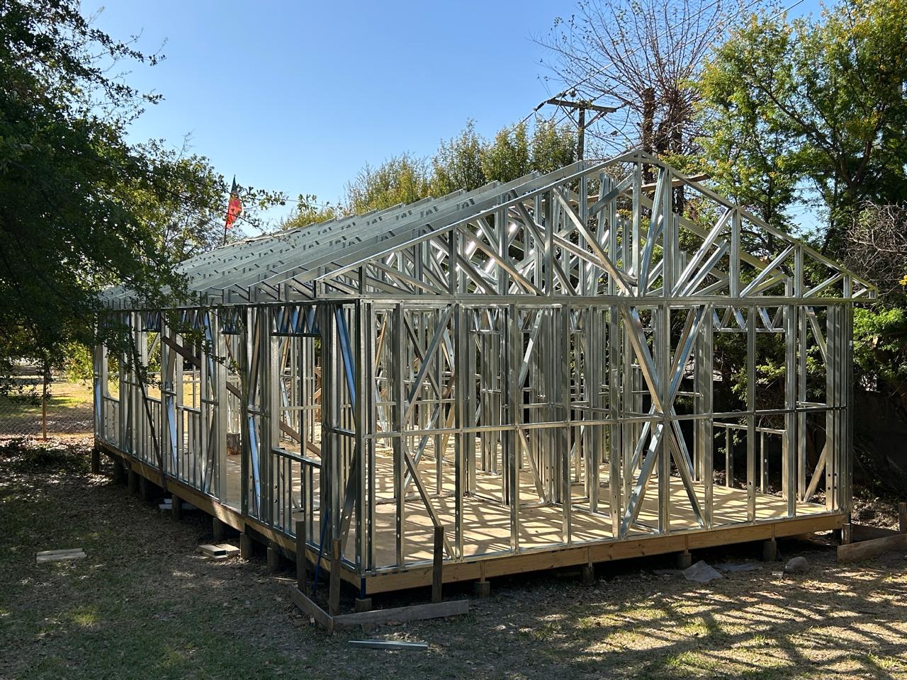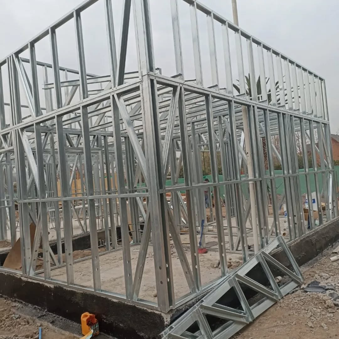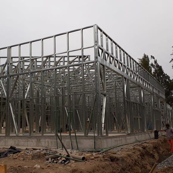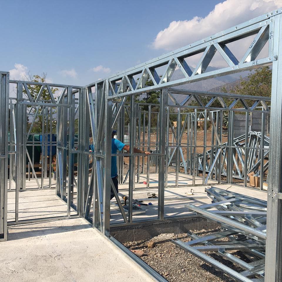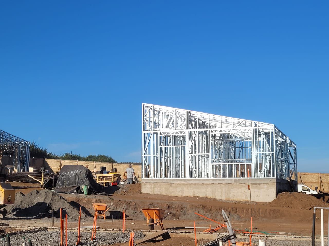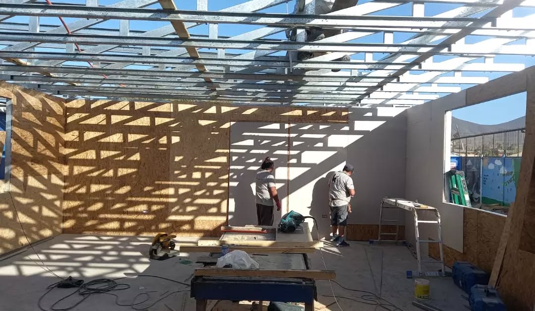 Está construida con perfiles de acero galvanizado tipo Steel Frame, una solución moderna, liviana y duradera, ideal para todo tipo de clima. La estructura ya se encuentra anclada sobre radier y cuenta con división de espacios claramente definidos, listos para recibir cerramientos y terminaciones. Este sistema permite una ejecución limpia, rápida y altamente precisa.