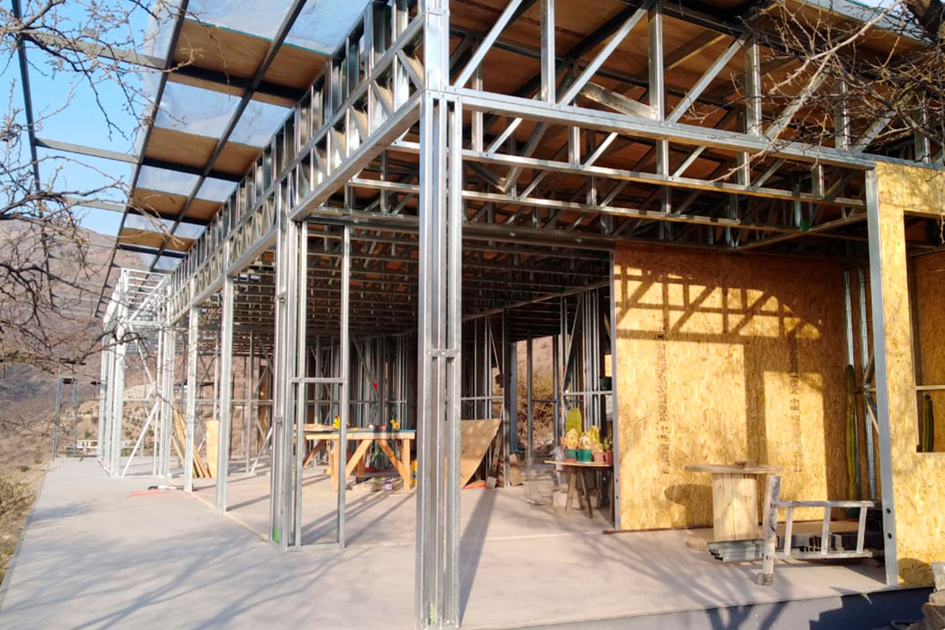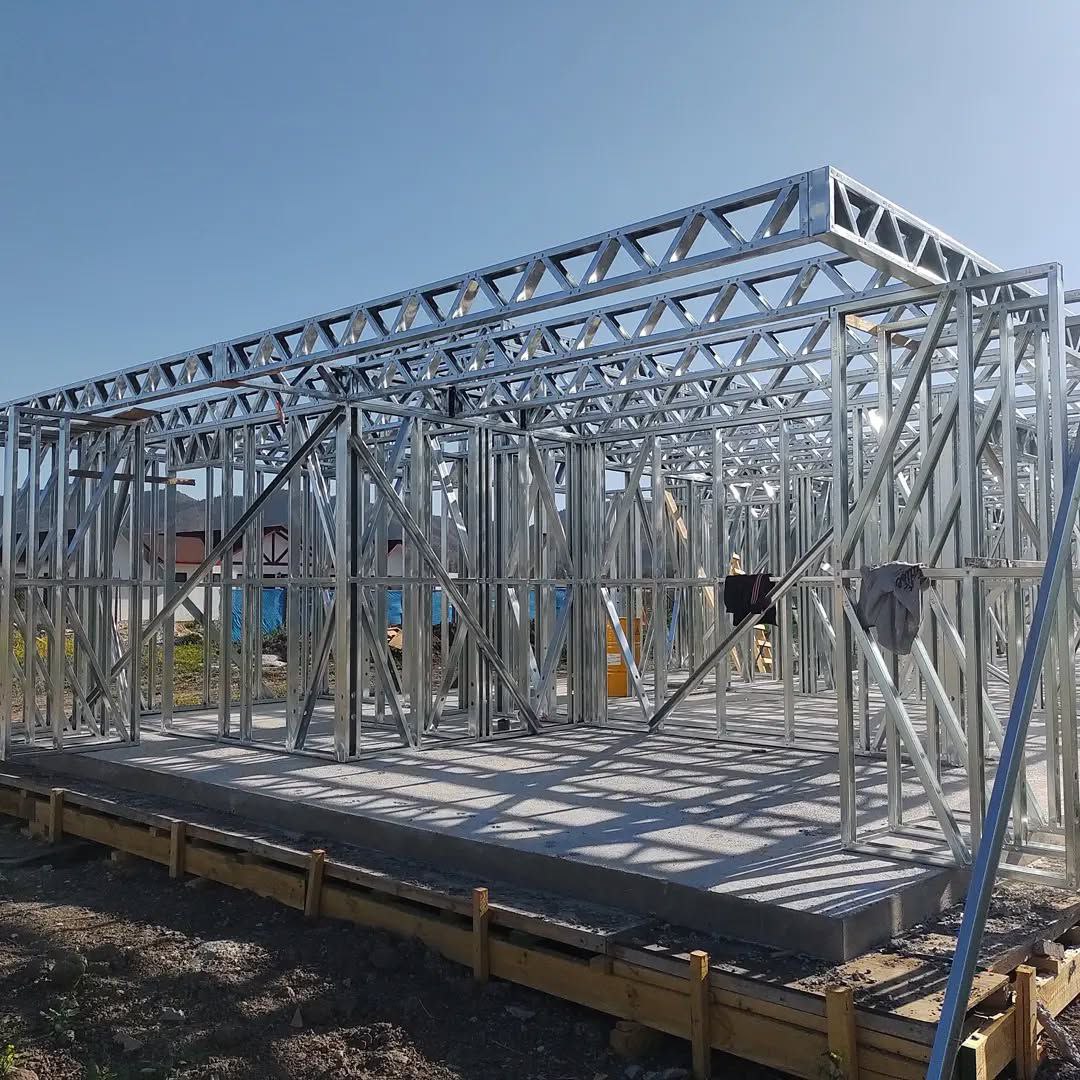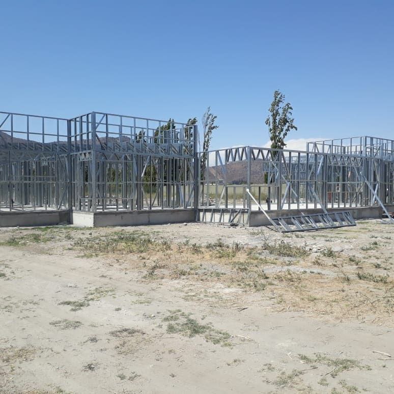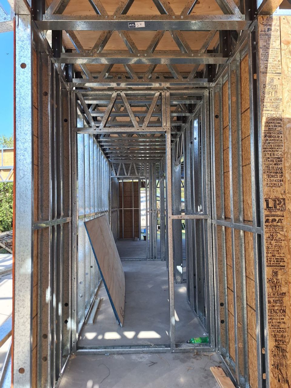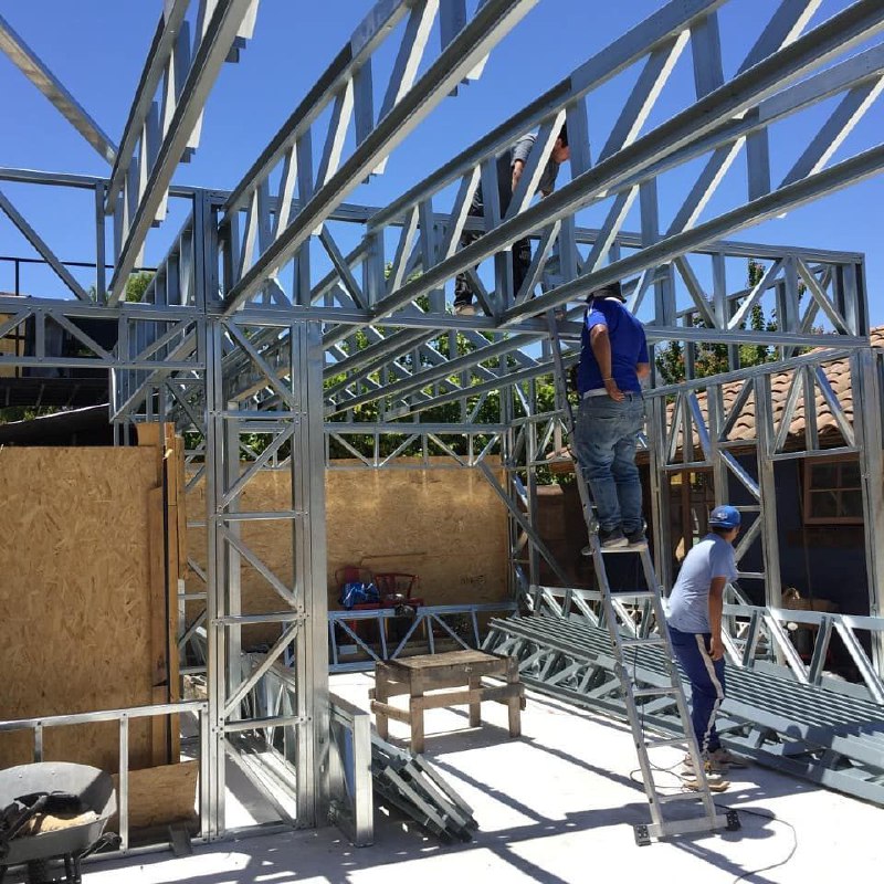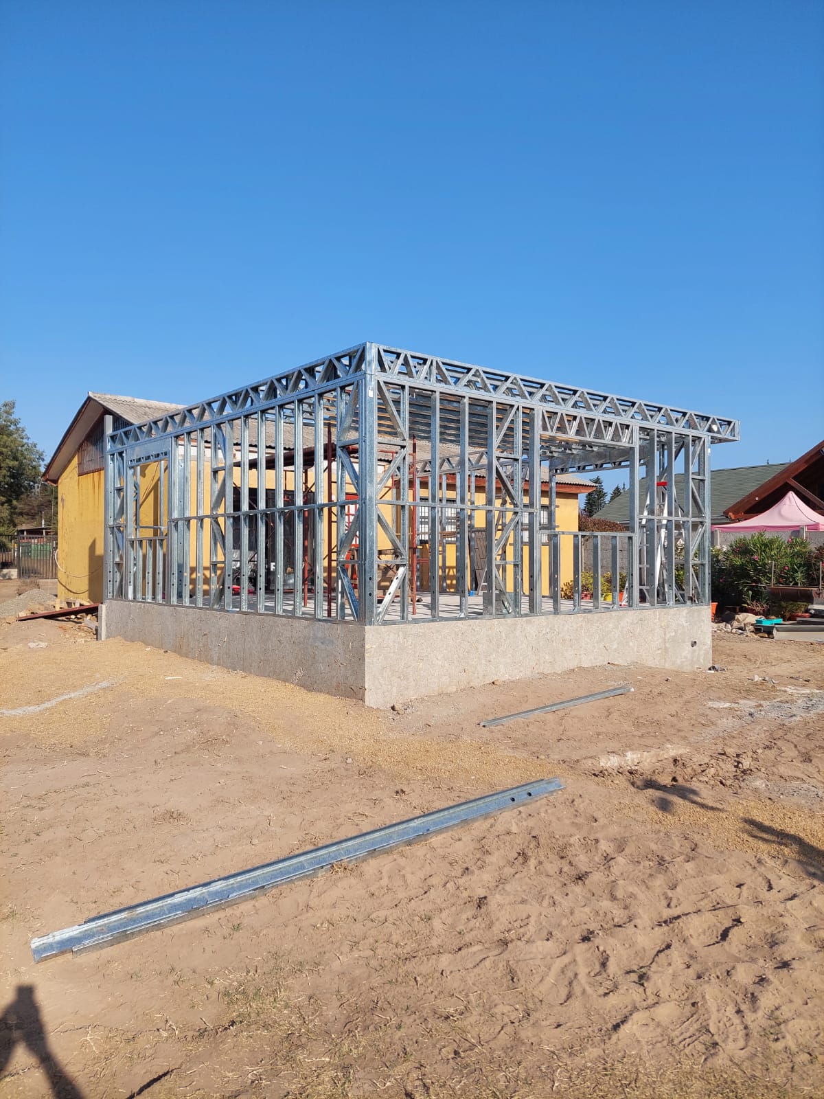 Está construida con perfiles de acero galvanizado tipo Steel Frame, una solución moderna, liviana y duradera, ideal para todo tipo de clima. La estructura ya se encuentra anclada sobre radier y cuenta con división de espacios claramente definidos, listos para recibir cerramientos y terminaciones. Este sistema permite una ejecución limpia, rápida y altamente precisa.