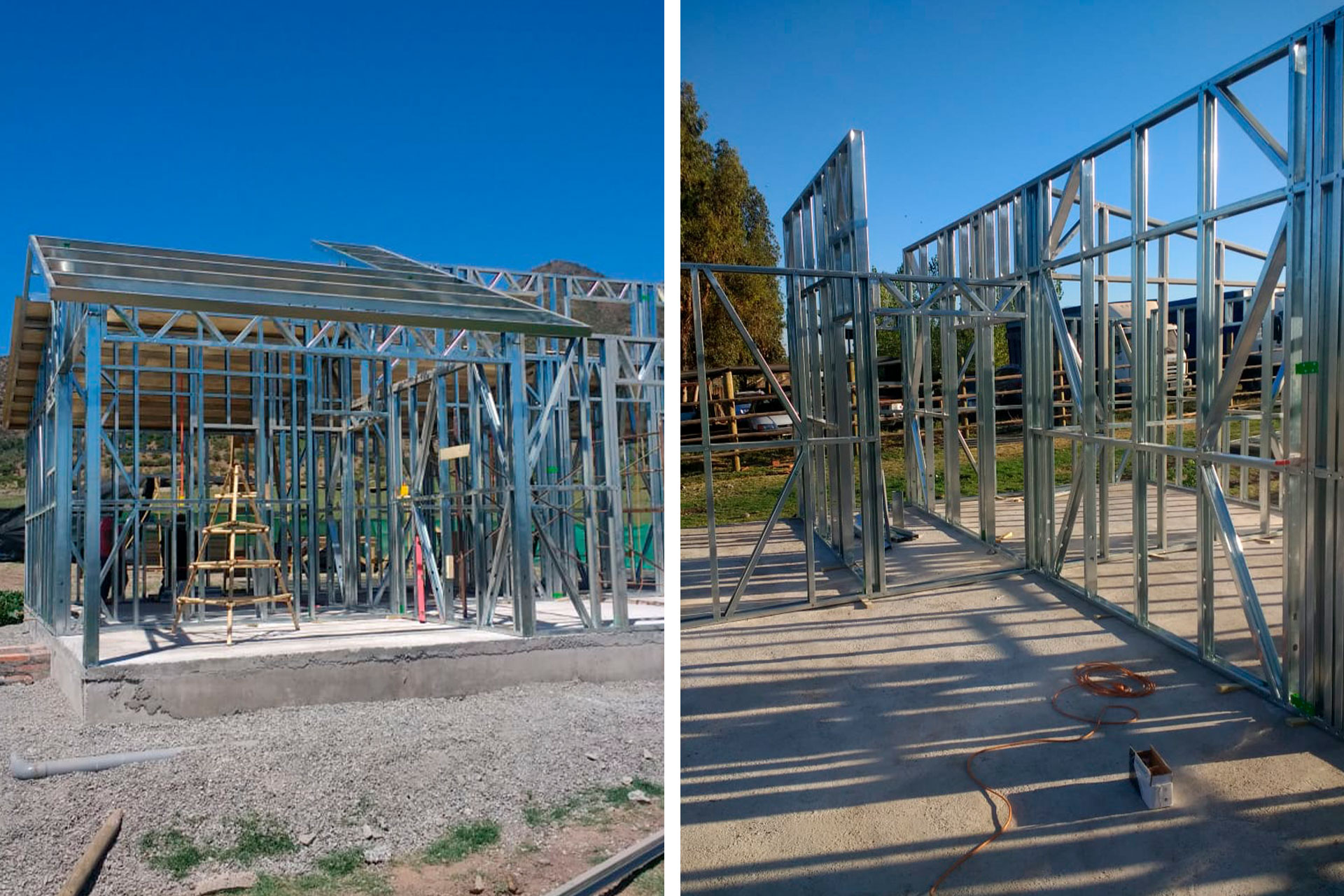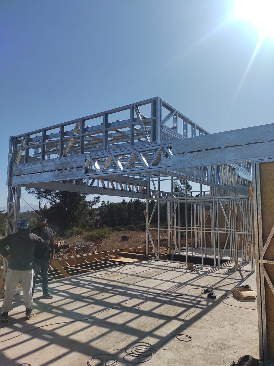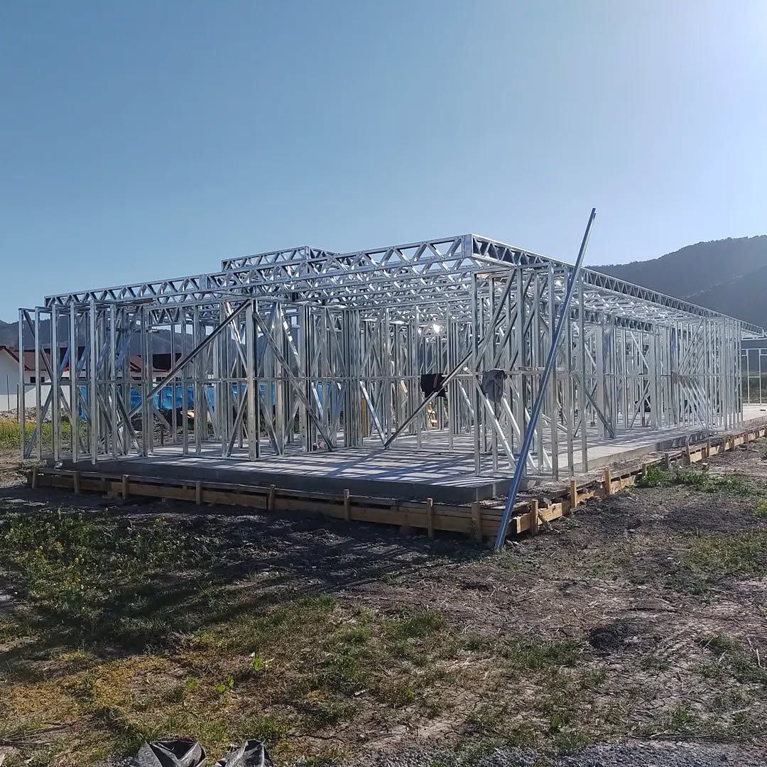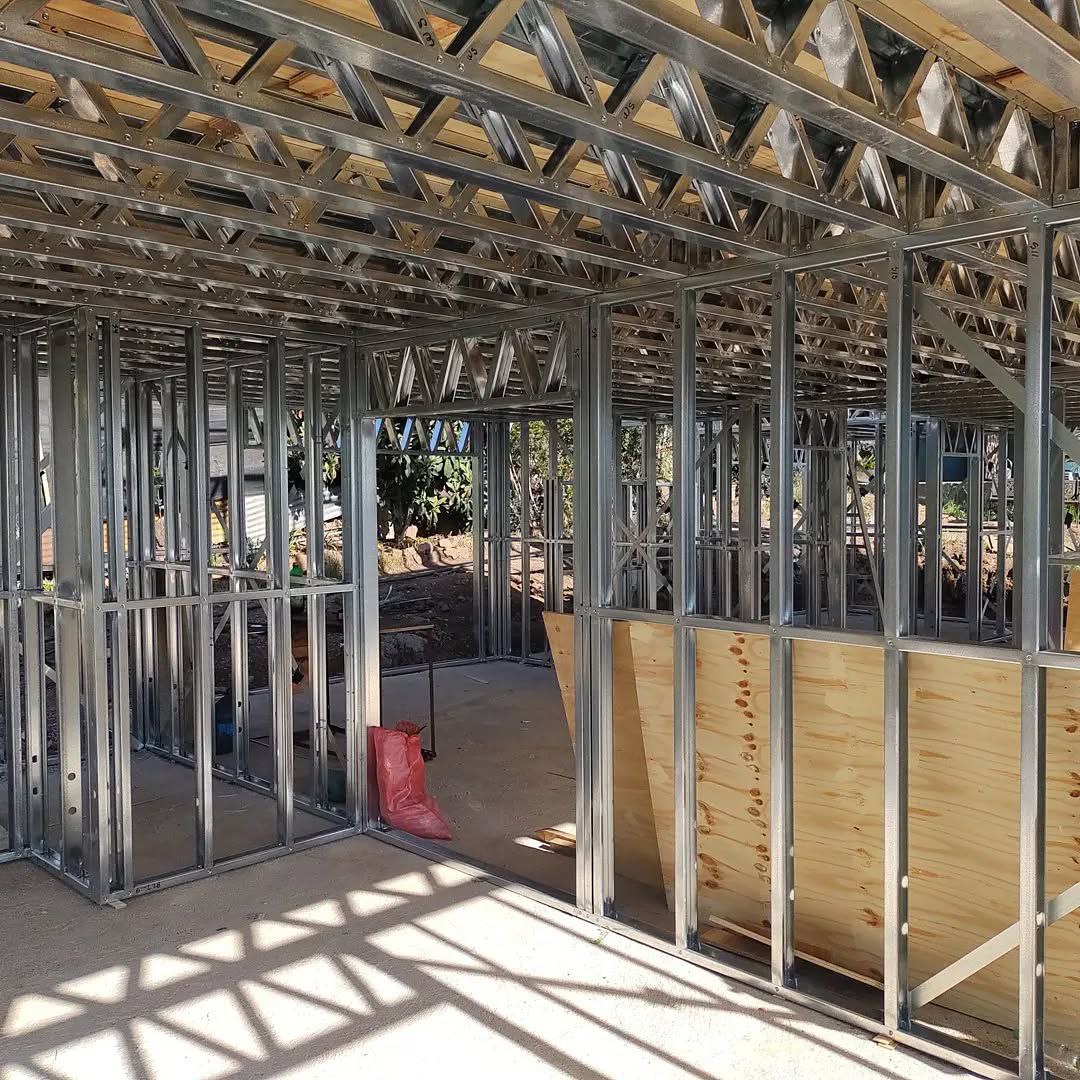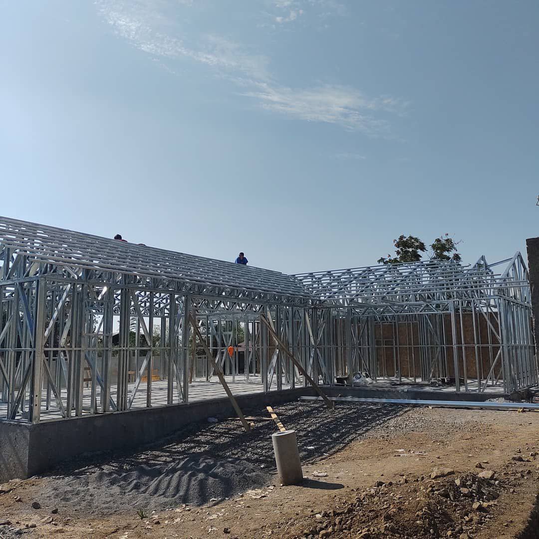 Está construida con perfiles de acero galvanizado tipo Steel Frame, una solución moderna, liviana y duradera, ideal para todo tipo de clima. La estructura ya se encuentra anclada sobre radier y cuenta con división de espacios claramente definidos, listos para recibir cerramientos y terminaciones. Este sistema permite una ejecución limpia, rápida y altamente precisa.