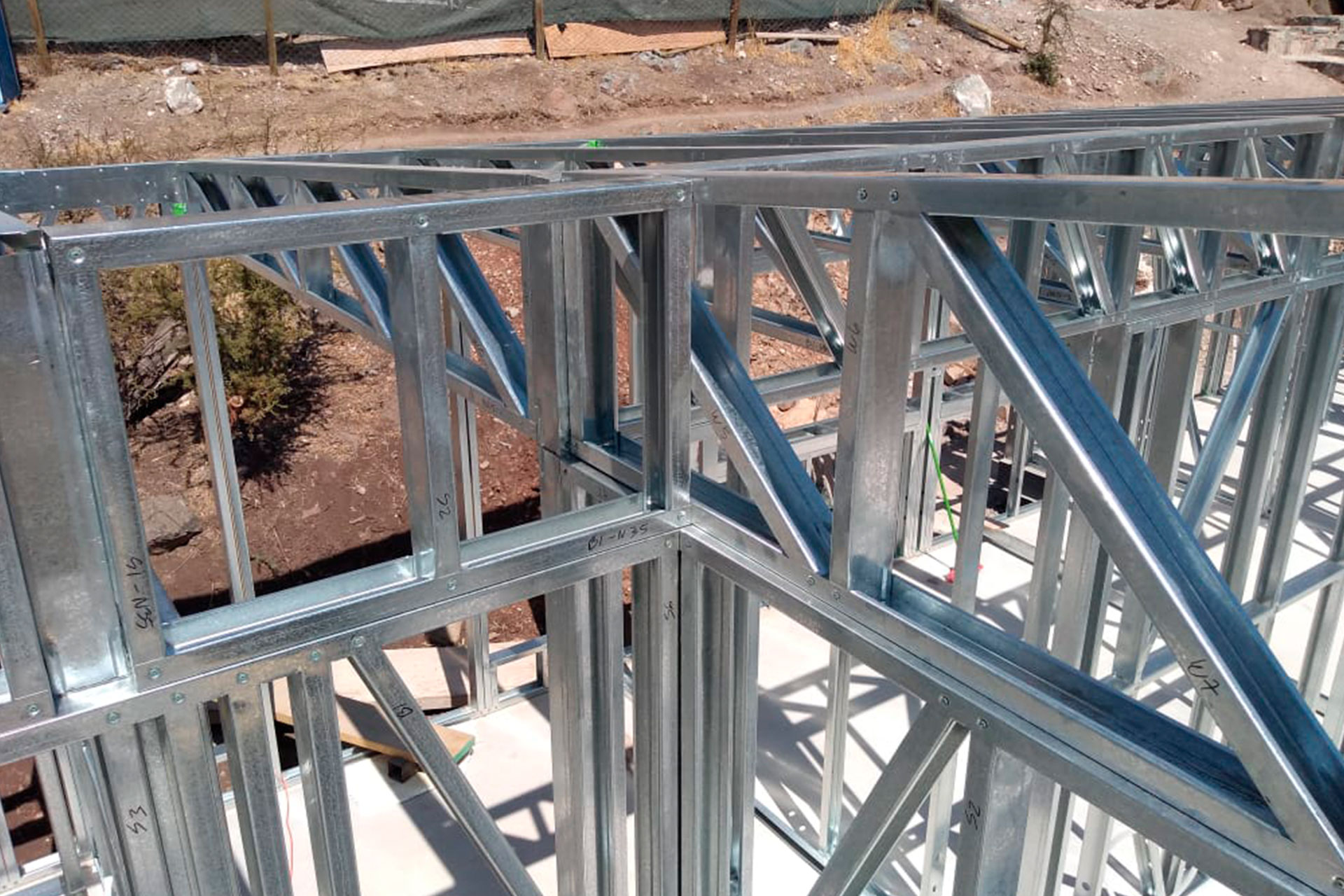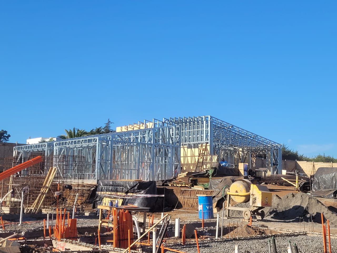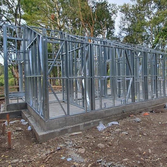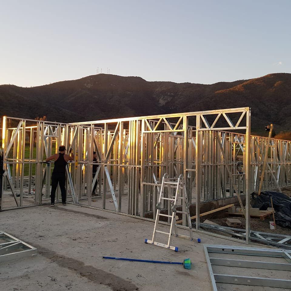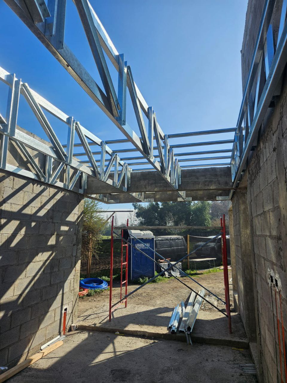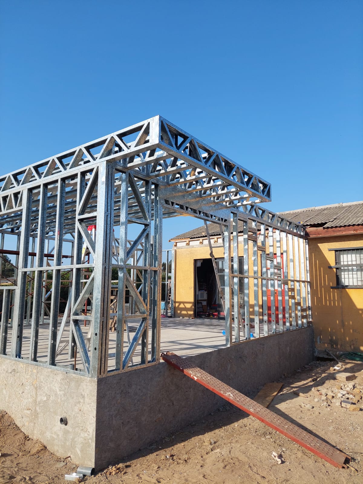 Está construida con perfiles de acero galvanizado tipo Steel Frame, una solución moderna, liviana y duradera, ideal para todo tipo de clima. La estructura ya se encuentra anclada sobre radier y cuenta con división de espacios claramente definidos, listos para recibir cerramientos y terminaciones. Este sistema permite una ejecución limpia, rápida y altamente precisa.