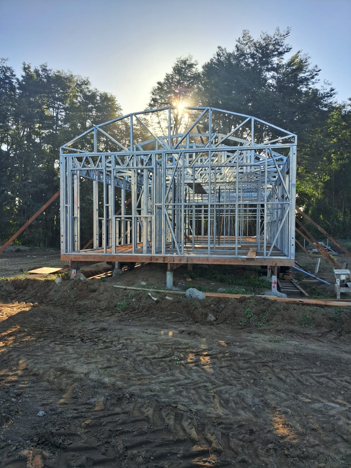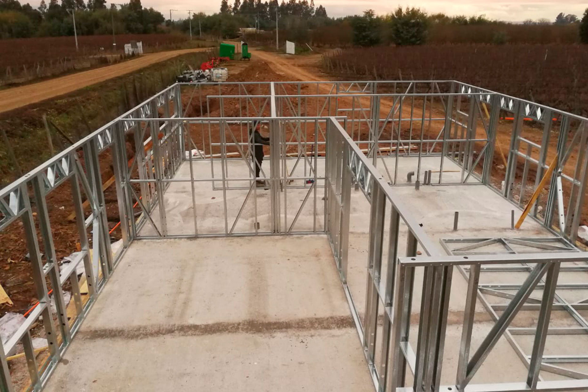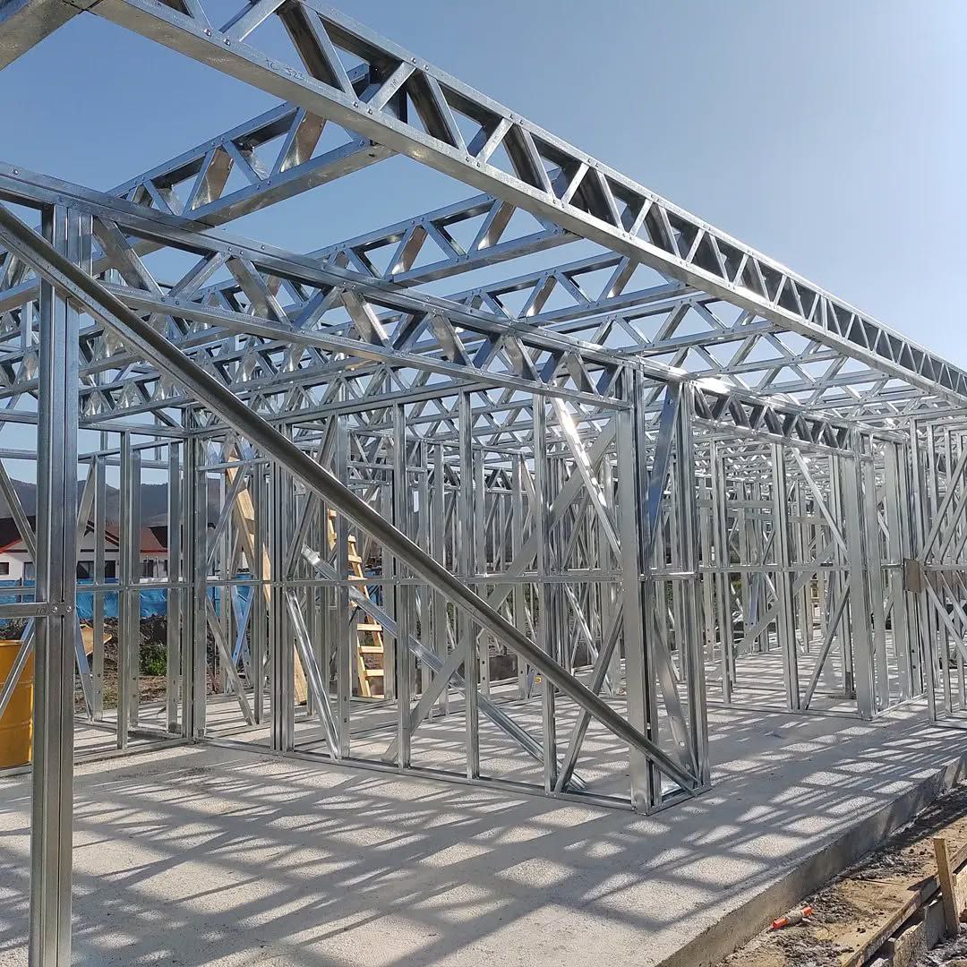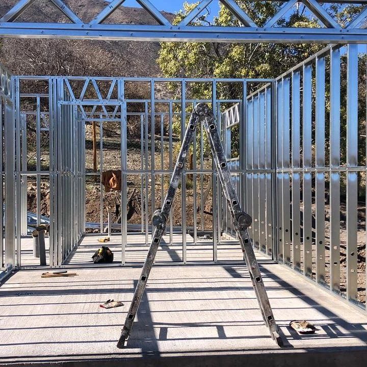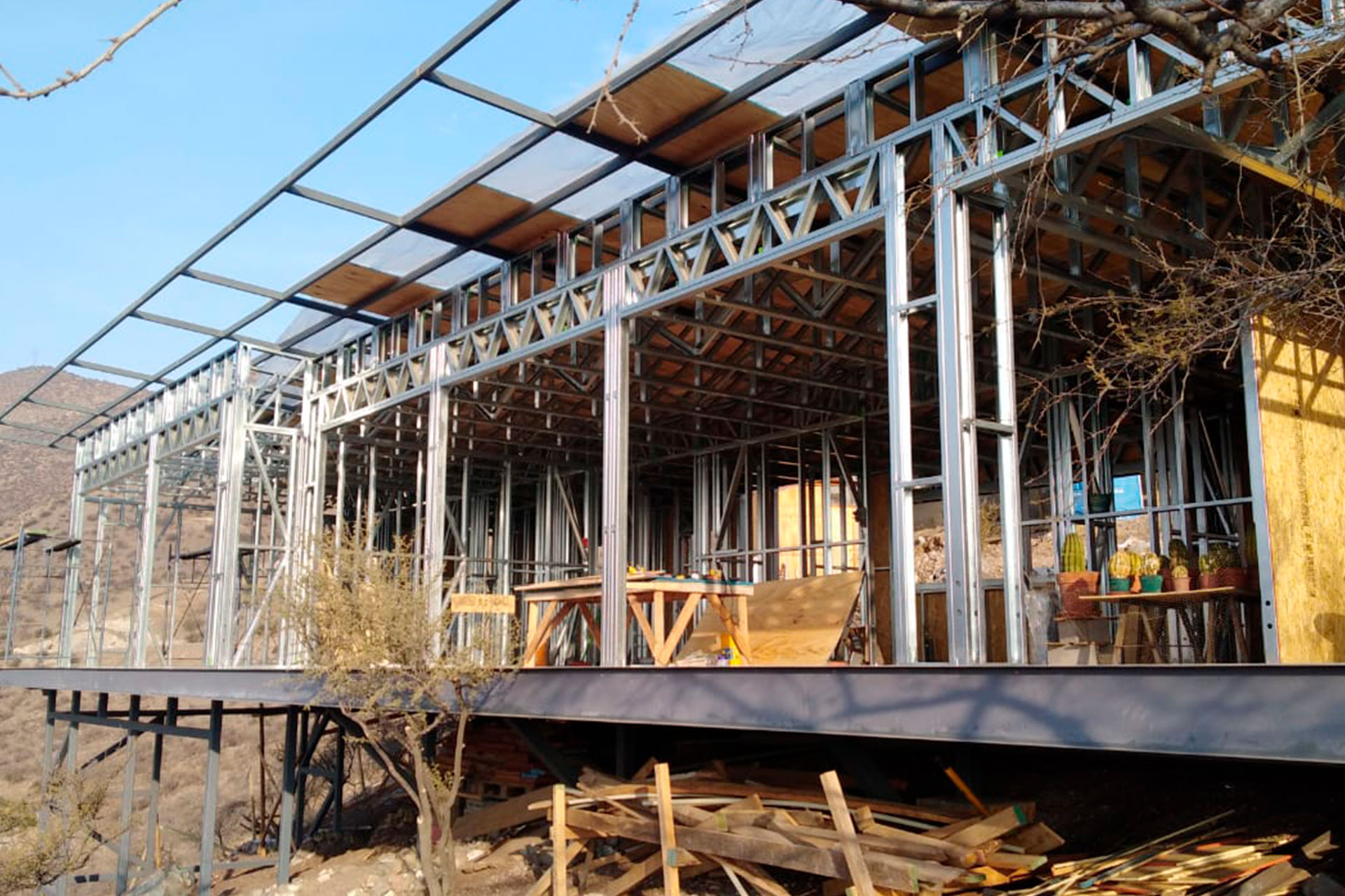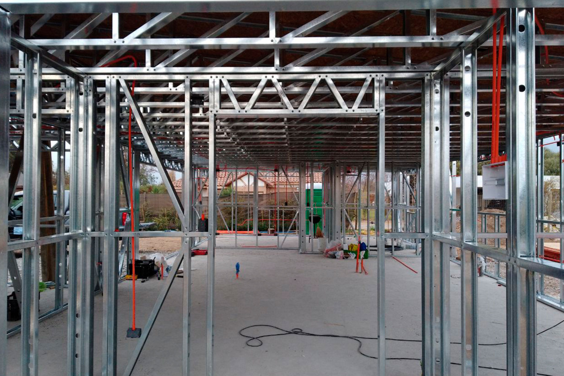 Está construida con perfiles de acero galvanizado tipo Steel Frame, una solución moderna, liviana y duradera, ideal para todo tipo de clima. La estructura ya se encuentra anclada sobre radier y cuenta con división de espacios claramente definidos, listos para recibir cerramientos y terminaciones. Este sistema permite una ejecución limpia, rápida y altamente precisa.