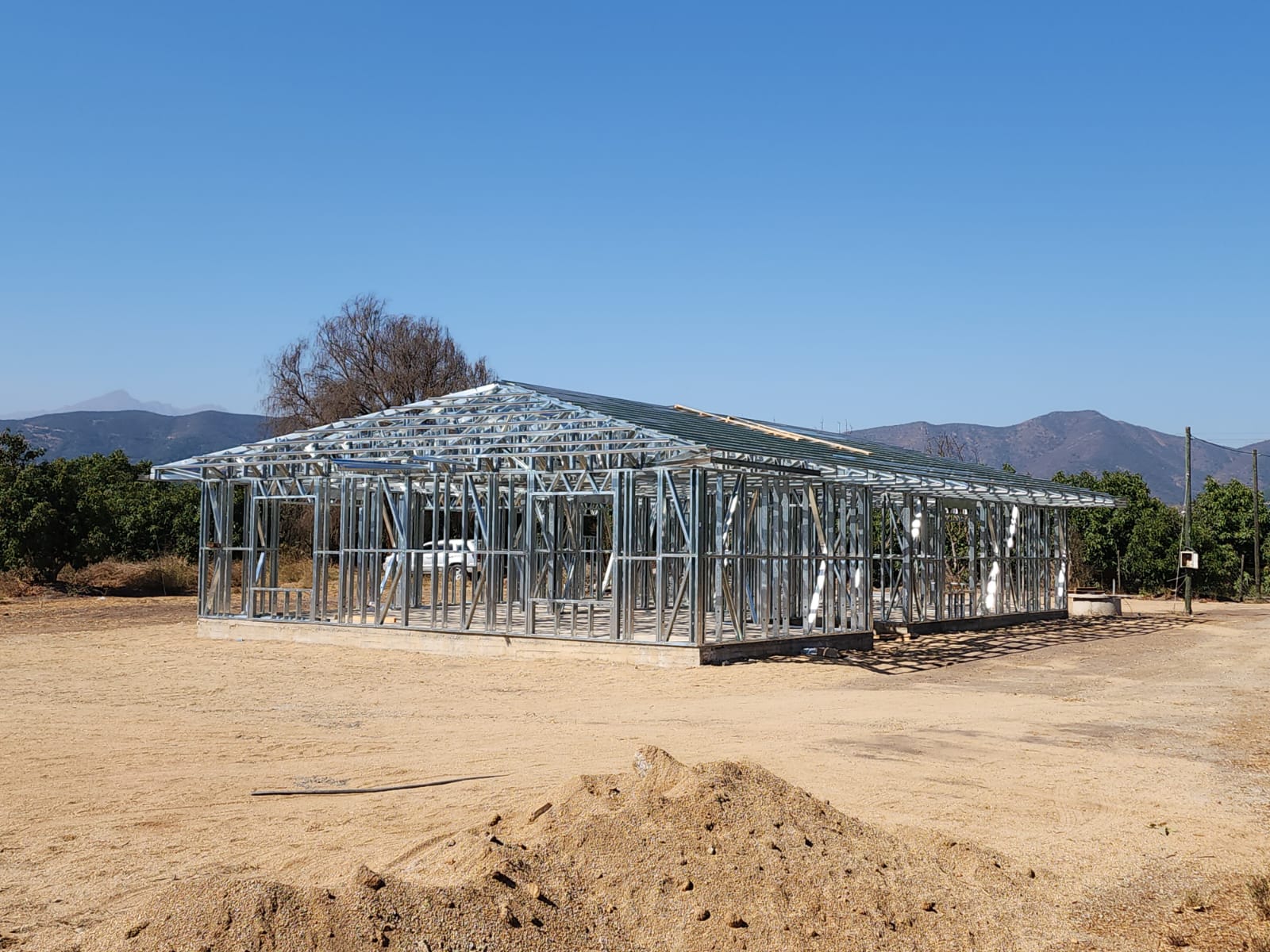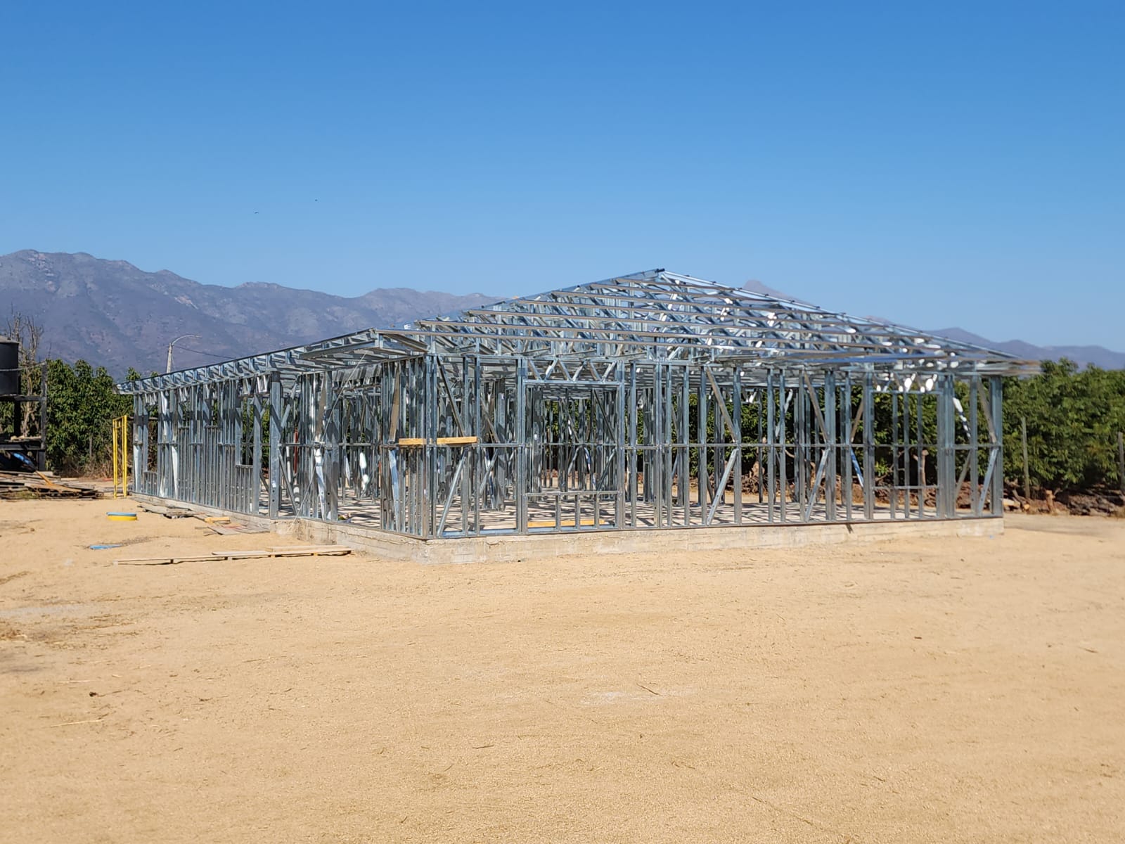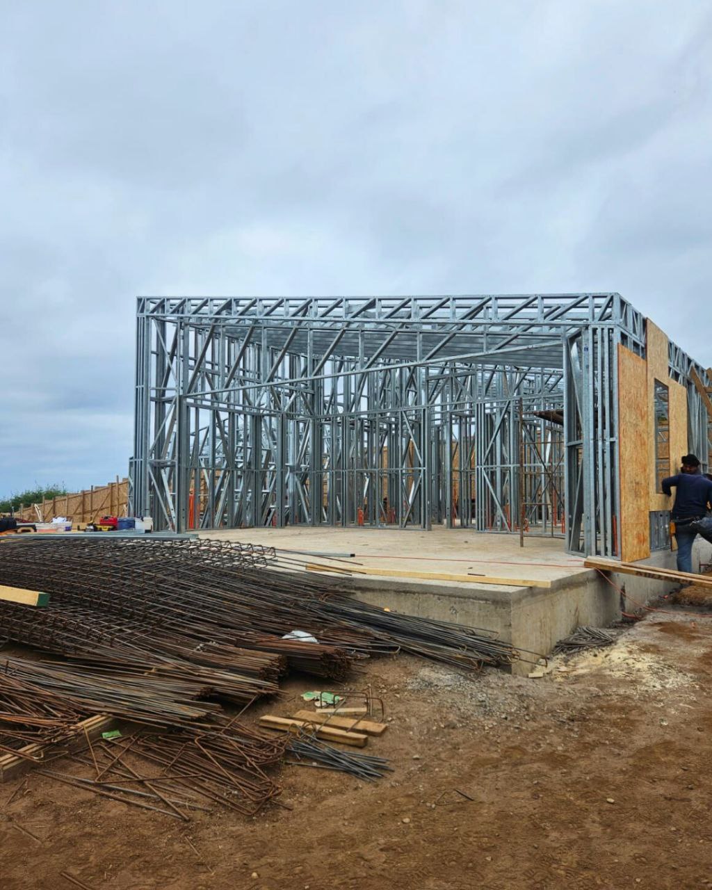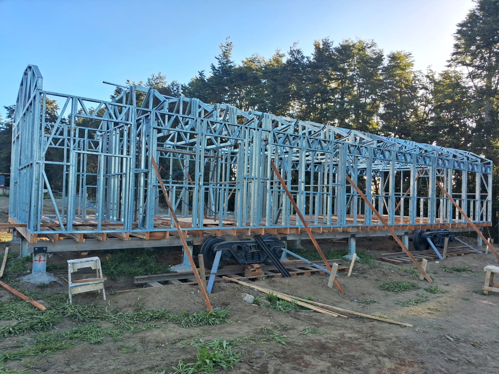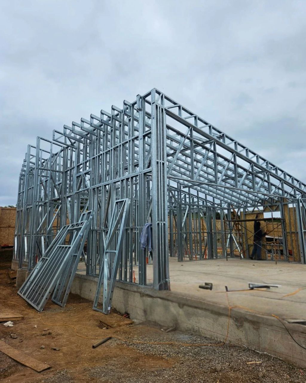 Está construida con perfiles de acero galvanizado tipo Steel Frame, una solución moderna, liviana y duradera, ideal para todo tipo de clima. La estructura ya se encuentra anclada sobre radier y cuenta con división de espacios claramente definidos, listos para recibir cerramientos y terminaciones. Este sistema permite una ejecución limpia, rápida y altamente precisa.