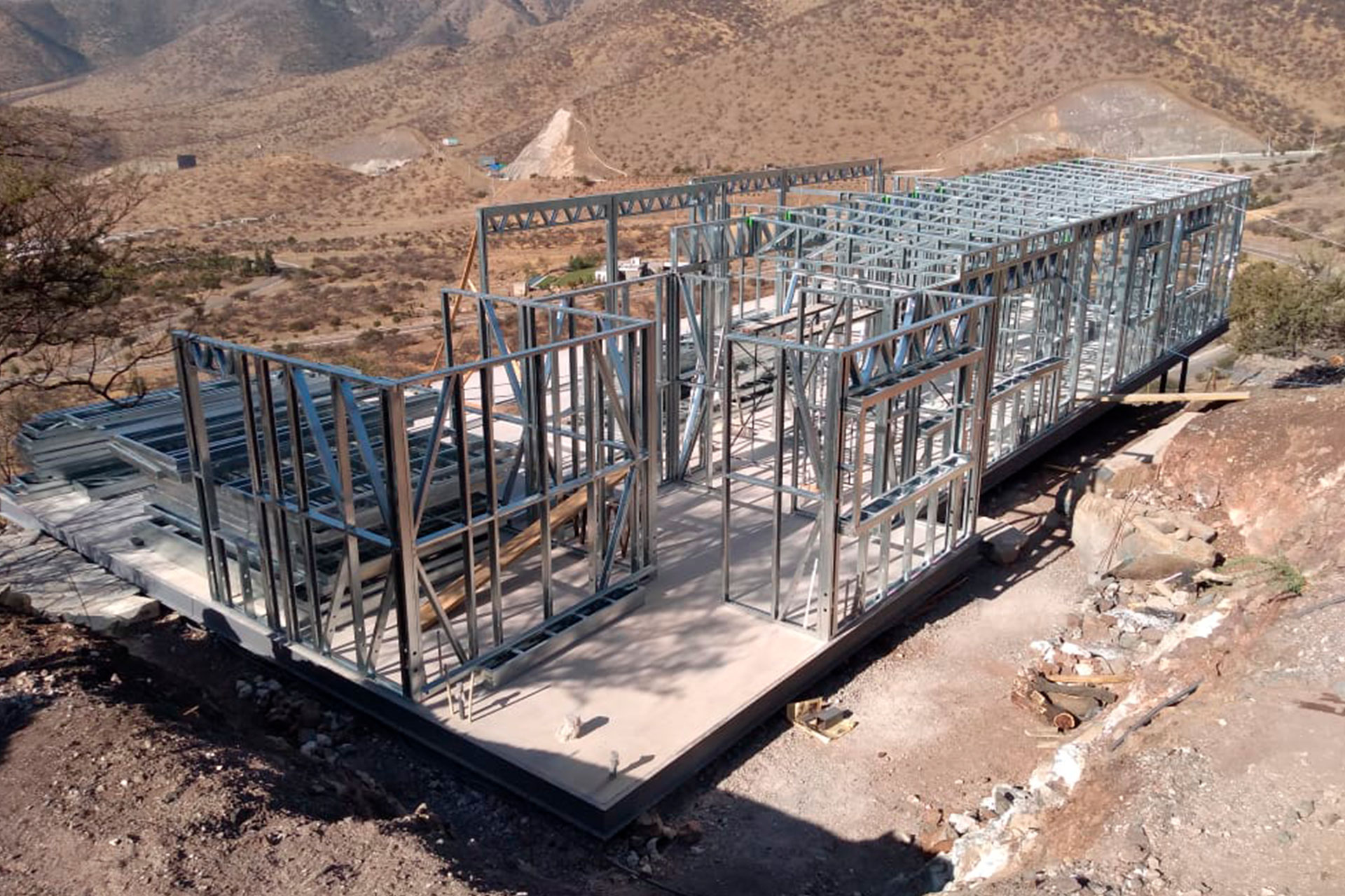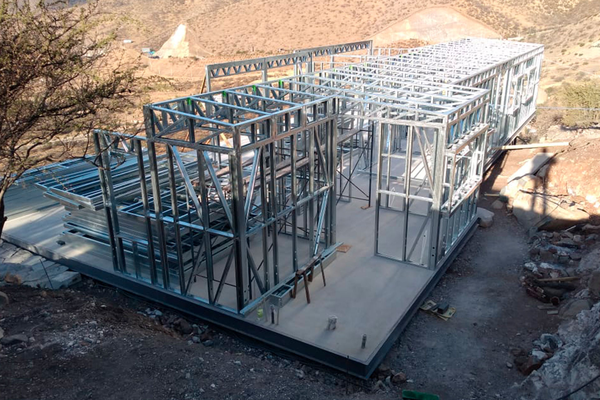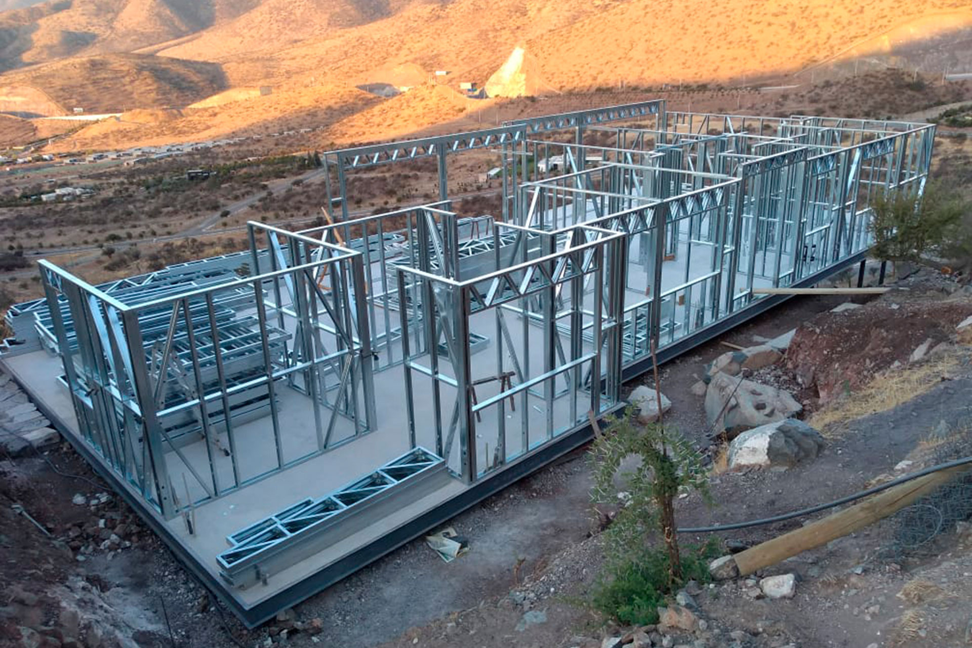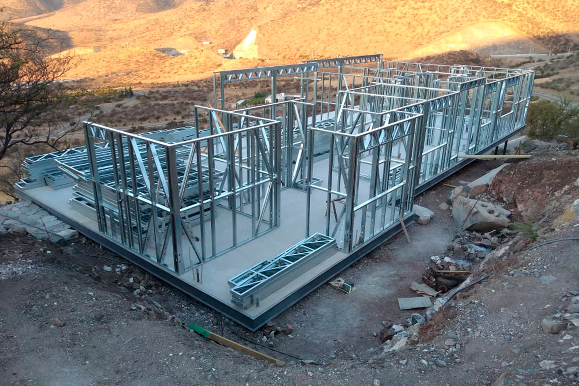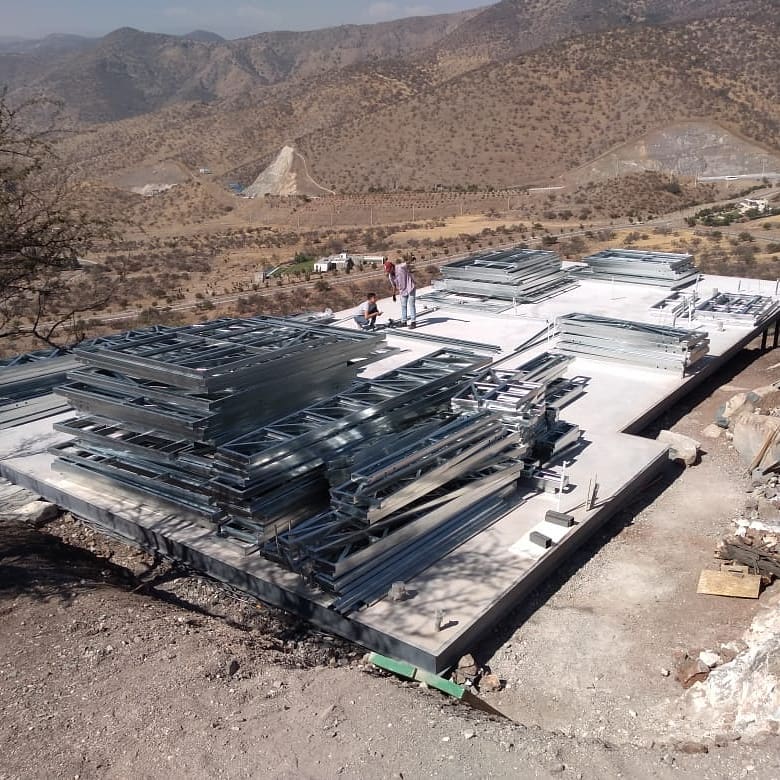 Estructura prefabricada de acero liviano sobre radier en desnivel.