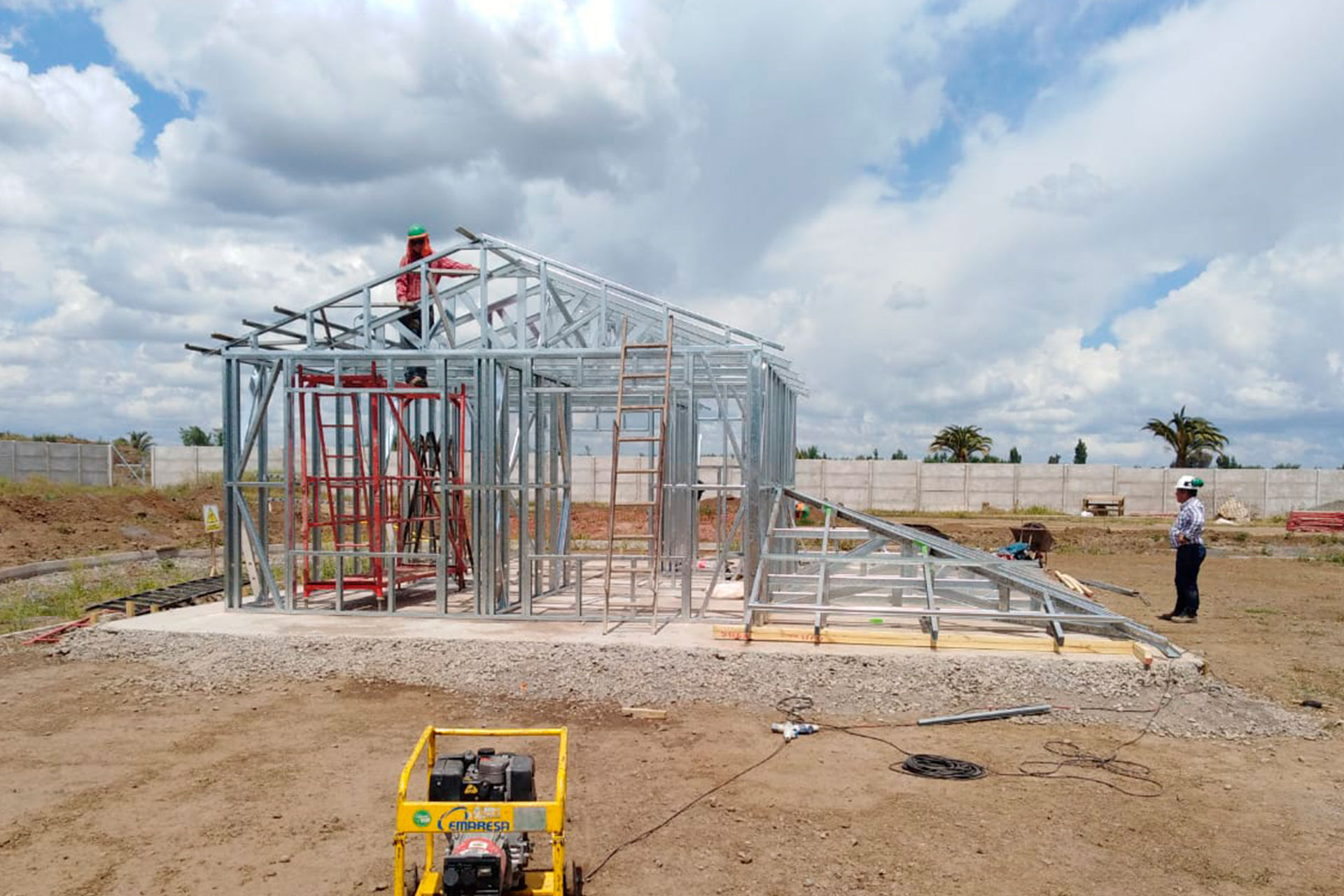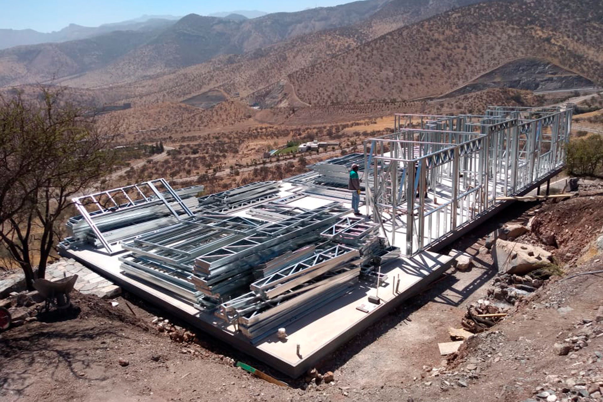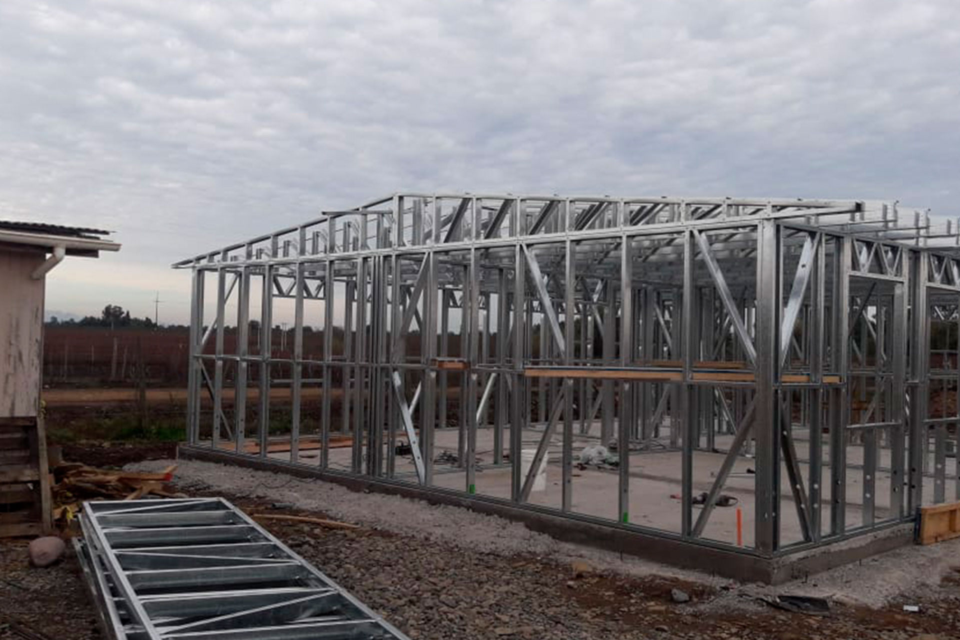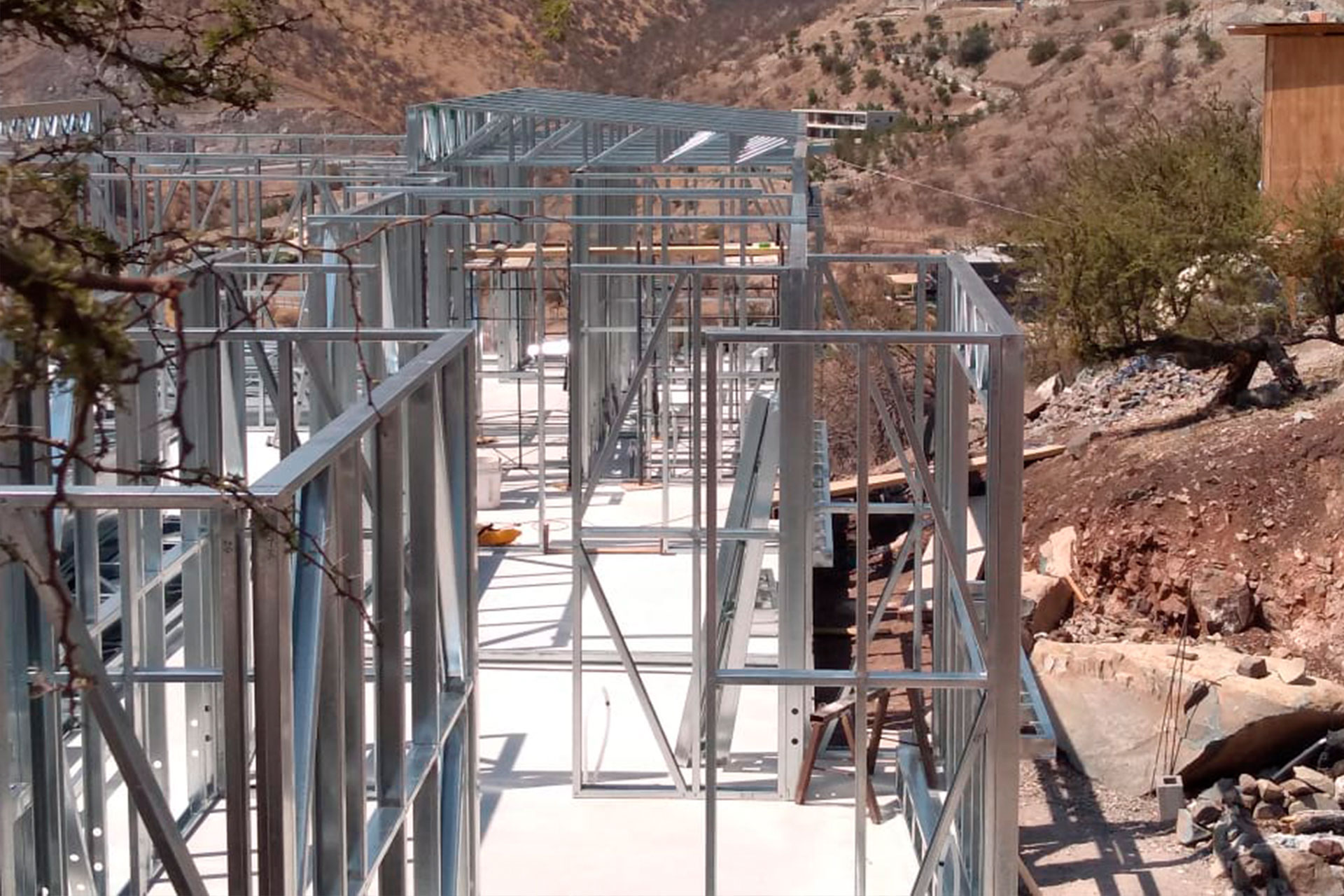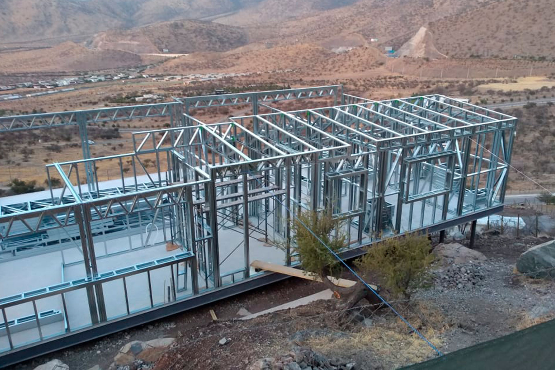 Estructura prefabricada de acero liviano sobre radier en desnivel.