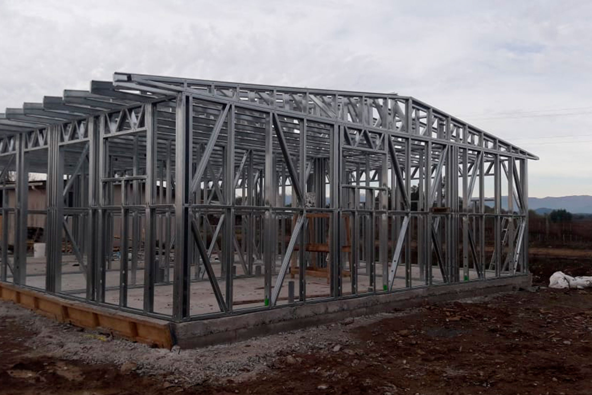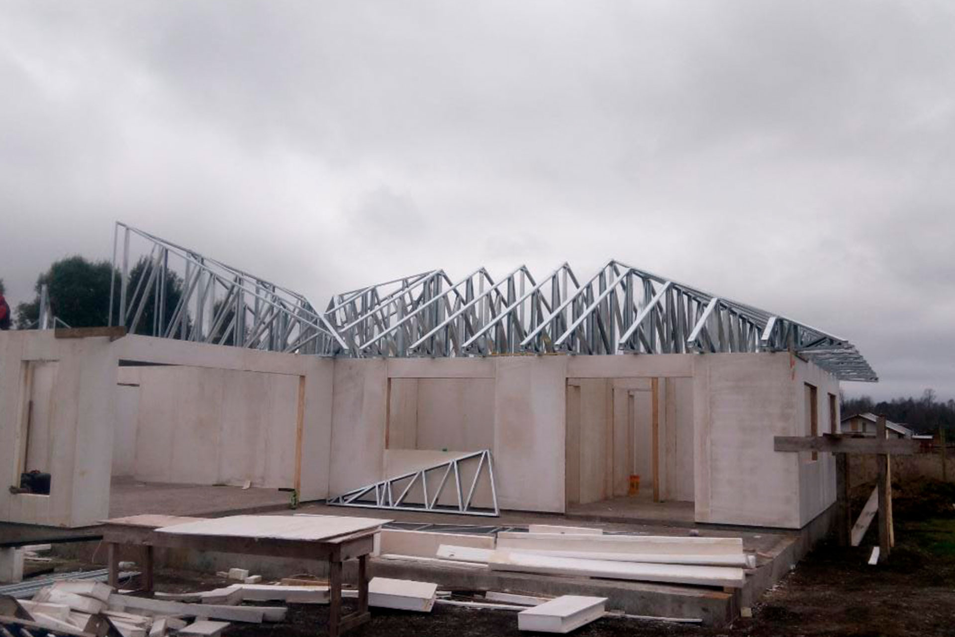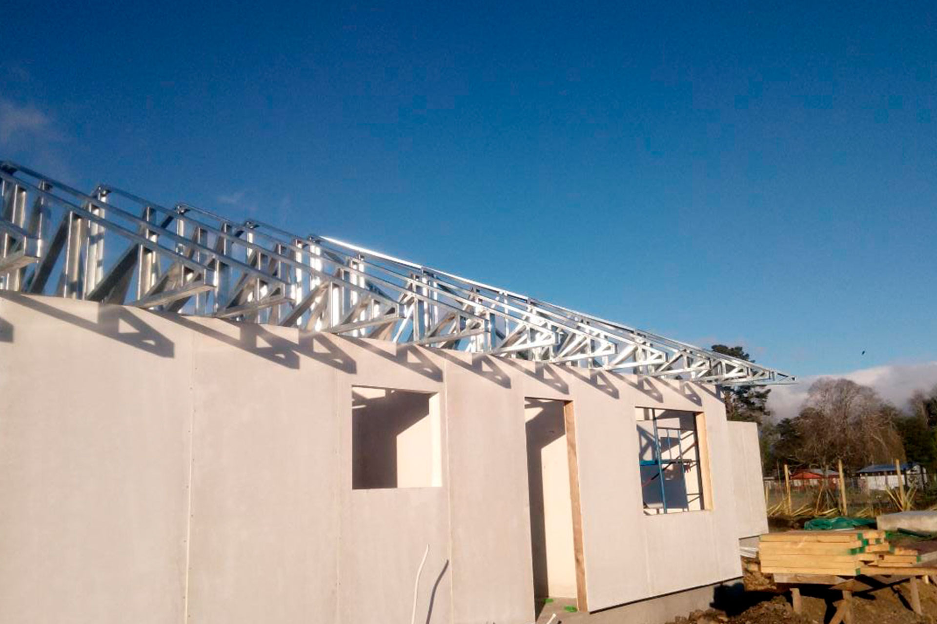 Proyecto desarrollado con estructura de acero liviano diseñada para una vivienda con techo inclinado. Dada la distancia de más de 10 horas entre la obra y nuestra fábrica, se realizó una revisión minuciosa de planos y medidas del radier antes de la fabricación. El cliente realizó el armado e instalación en terreno, lo que demuestra la precisión y facilidad de montaje de nuestro sistema constructivo.