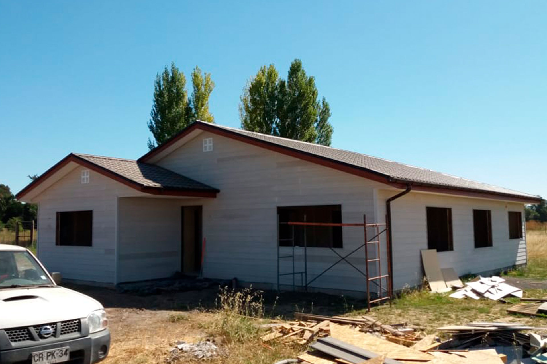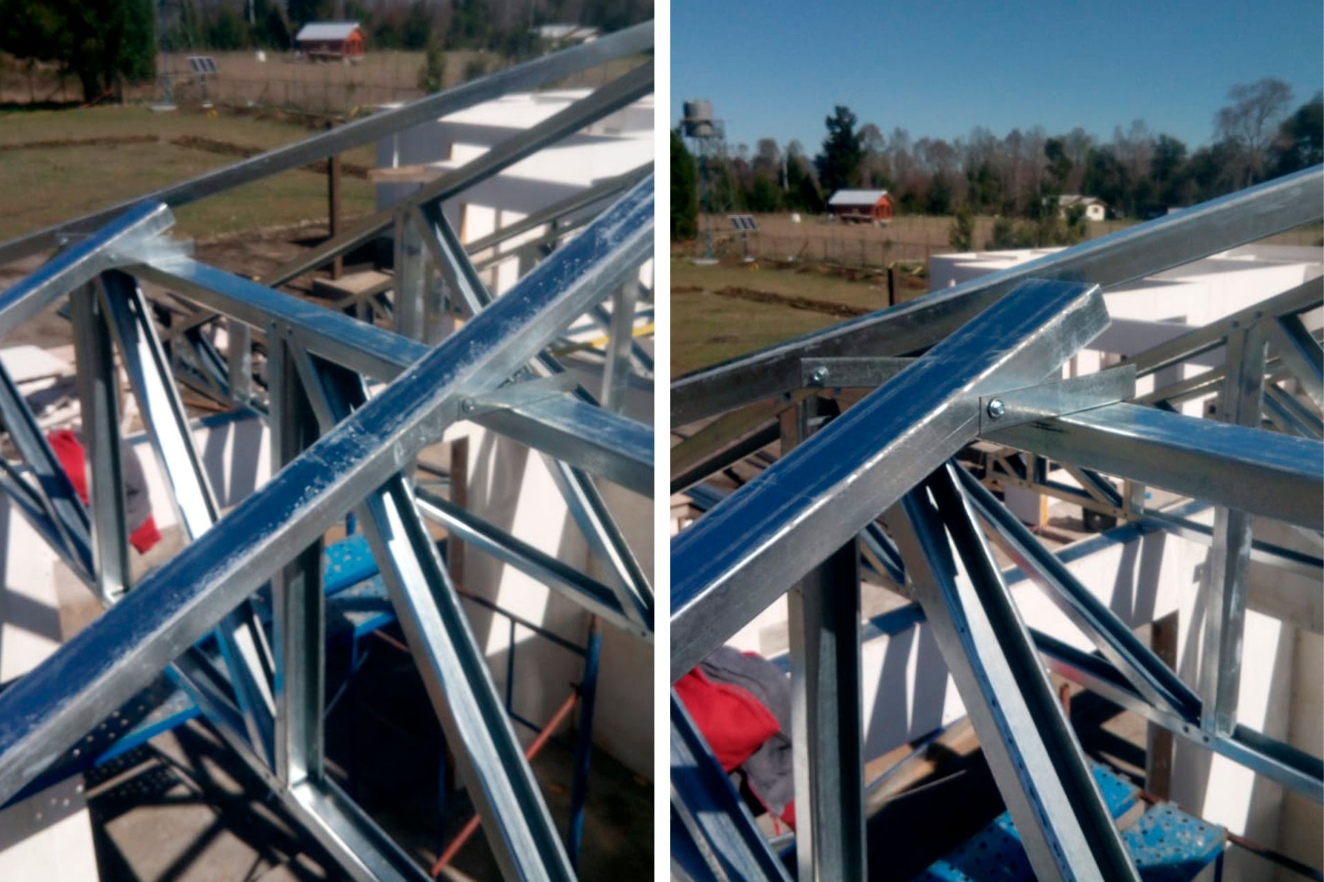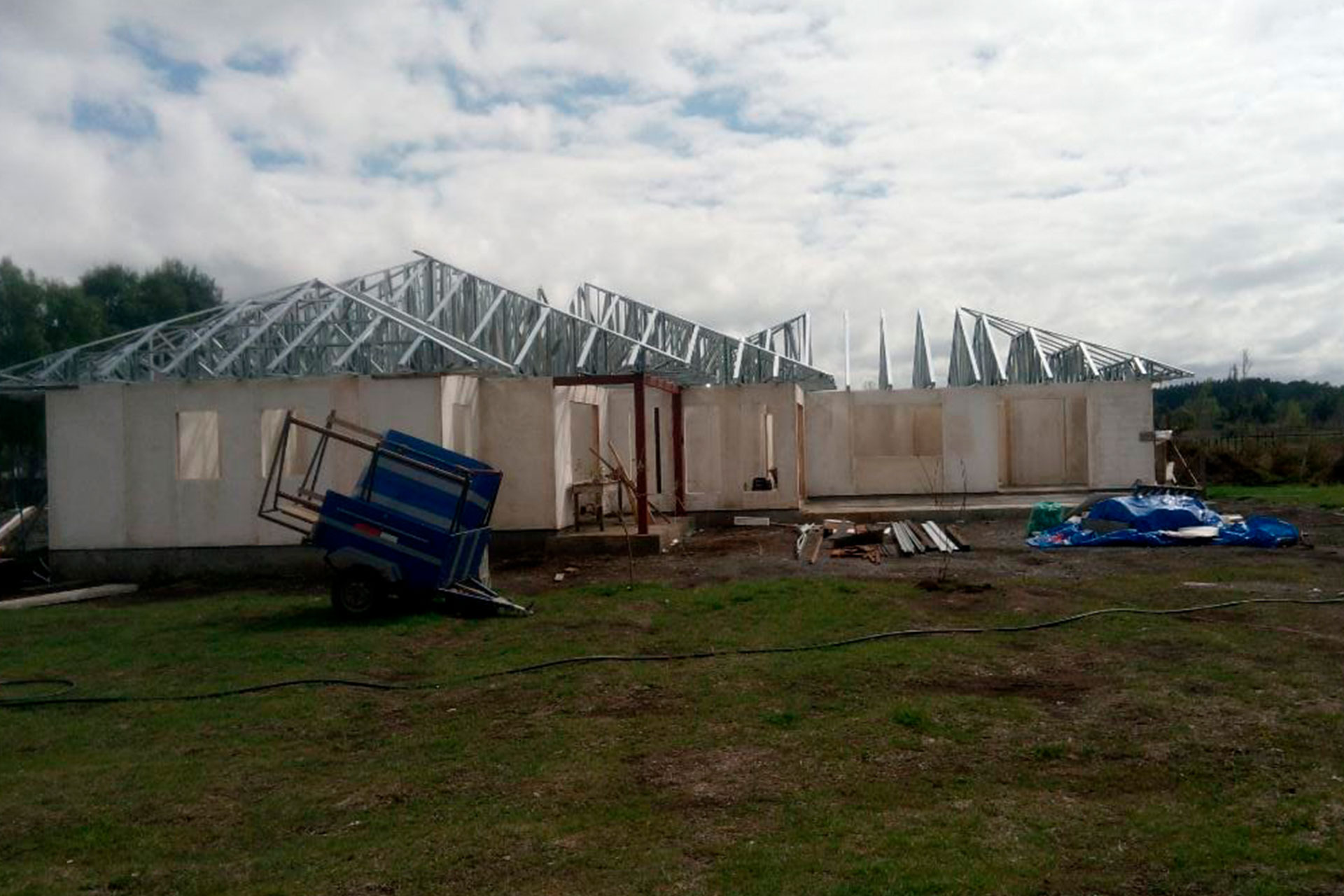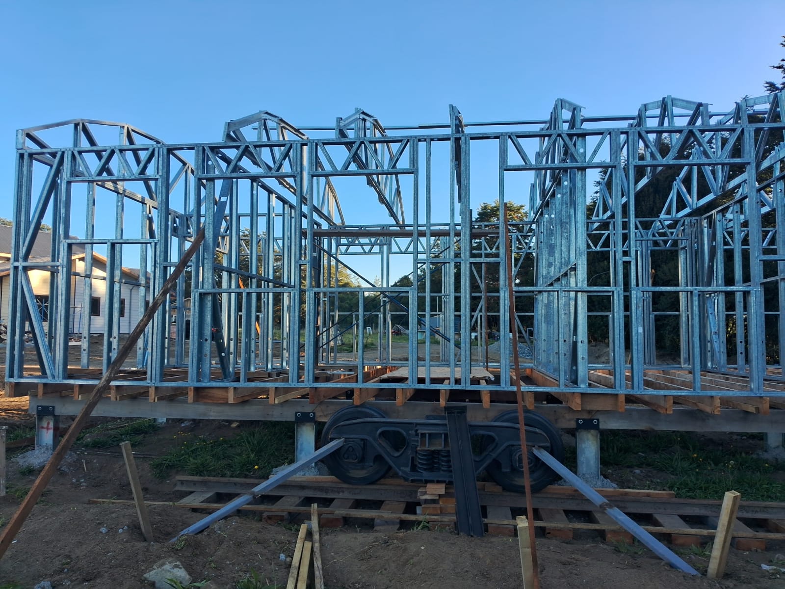 Proyecto desarrollado con estructura de acero liviano diseñada para una vivienda con techo inclinado. Dada la distancia de más de 10 horas entre la obra y nuestra fábrica, se realizó una revisión minuciosa de planos y medidas del radier antes de la fabricación. El cliente realizó el armado e instalación en terreno, lo que demuestra la precisión y facilidad de montaje de nuestro sistema constructivo.