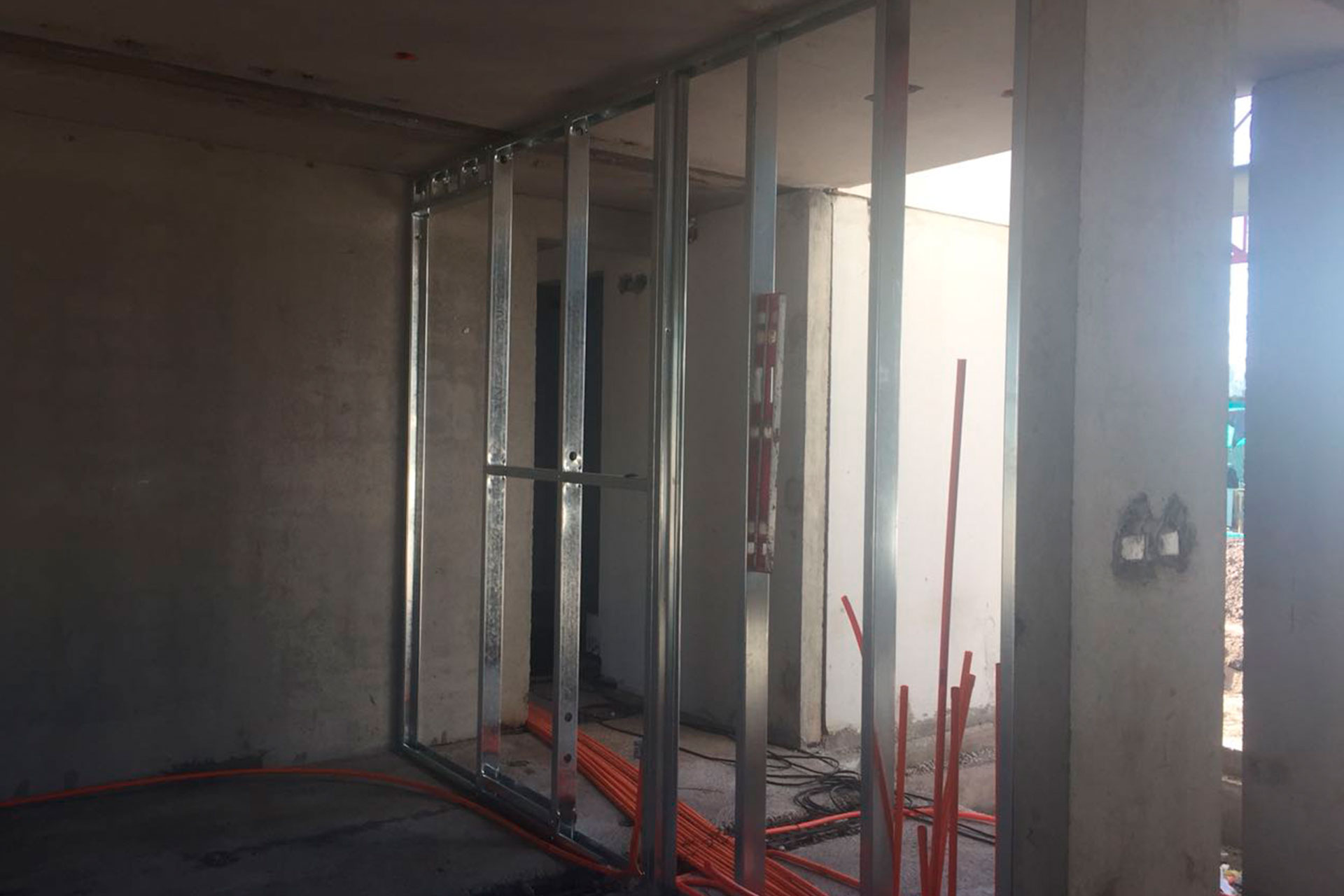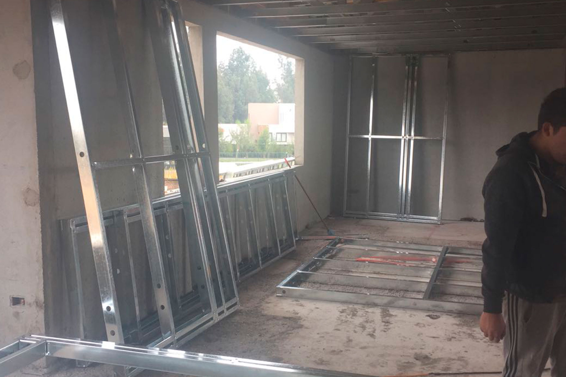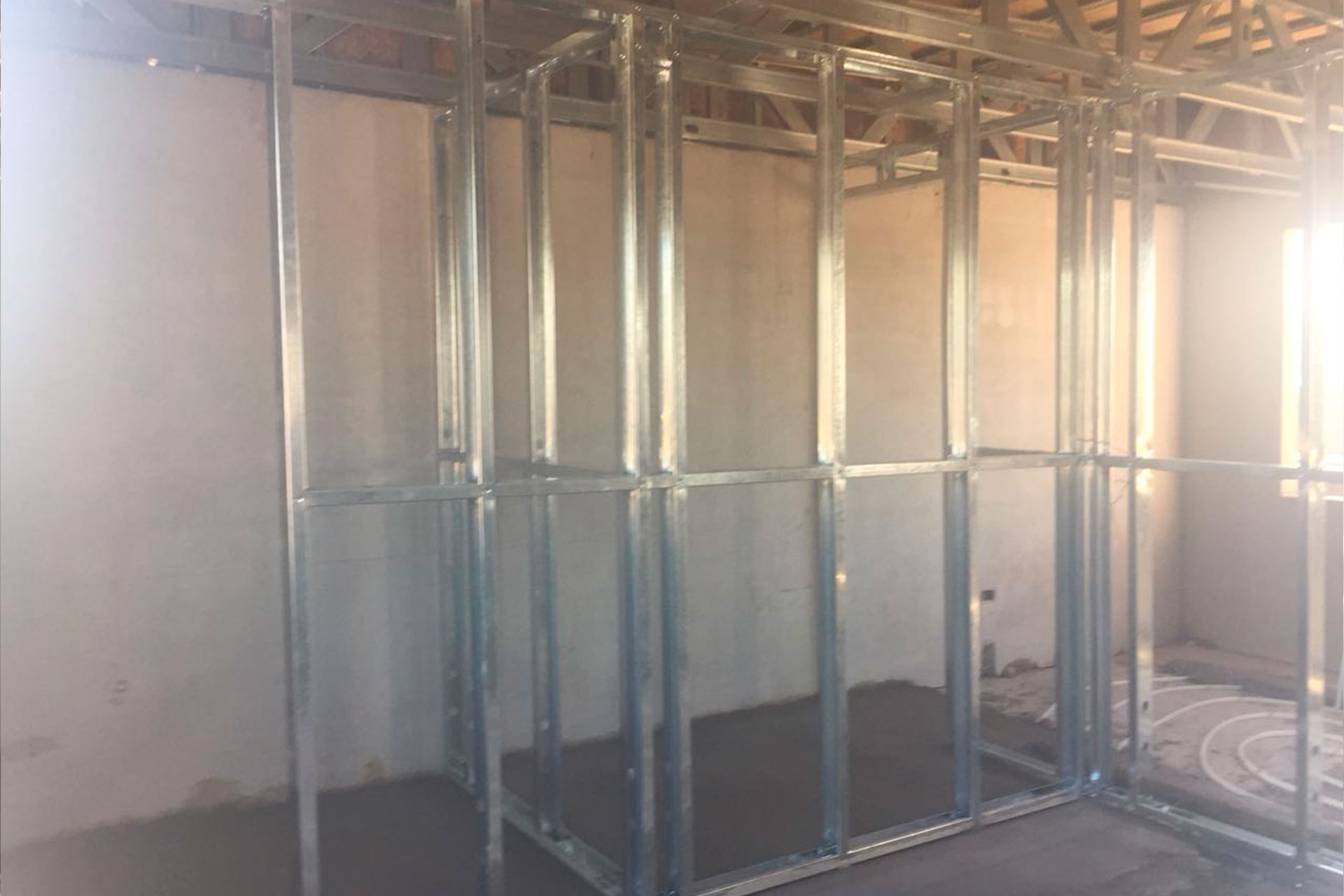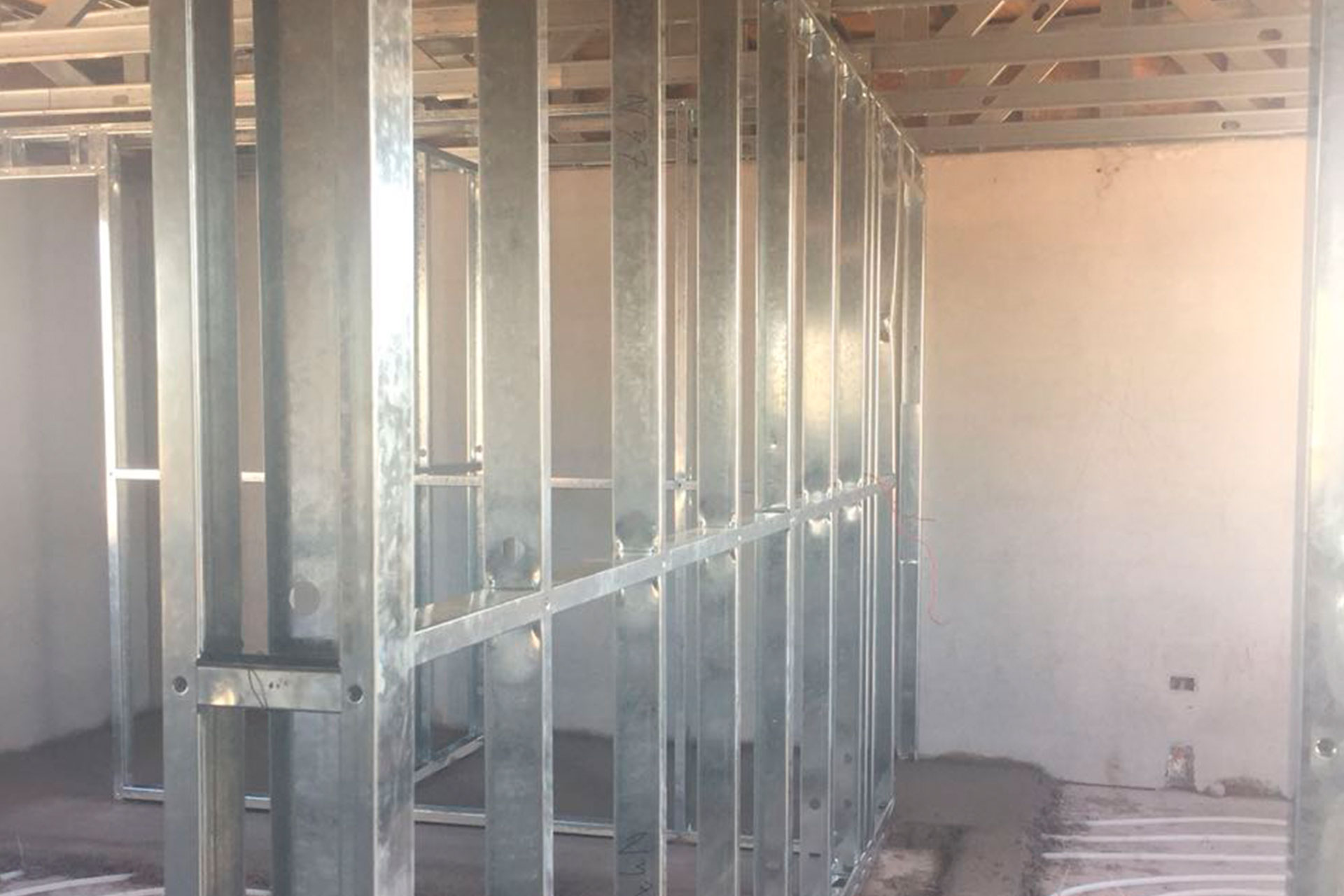 Instalación de tabiques interiores con estructura de acero liviano tipo Steel Frame. Solución rápida, precisa y adaptable.