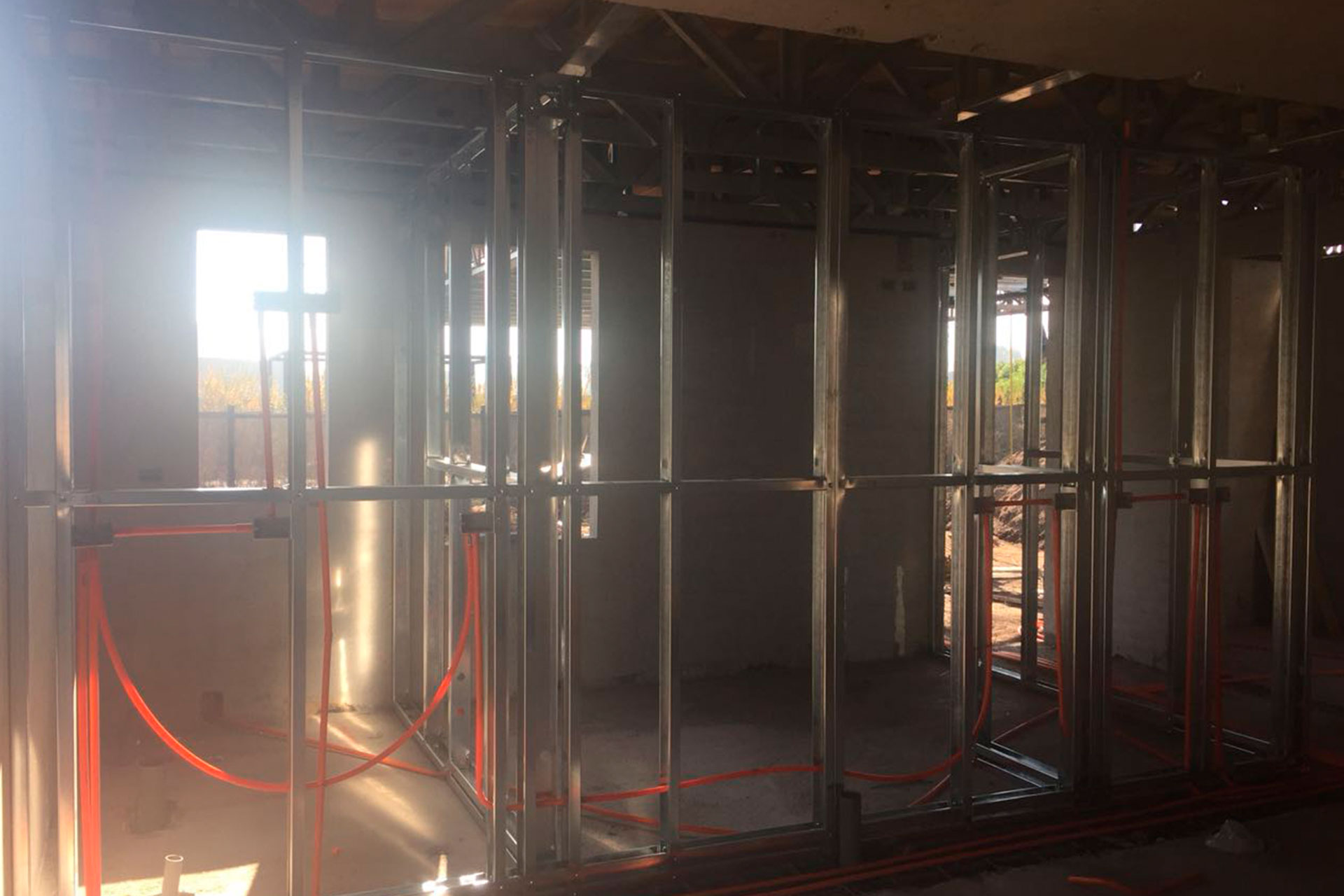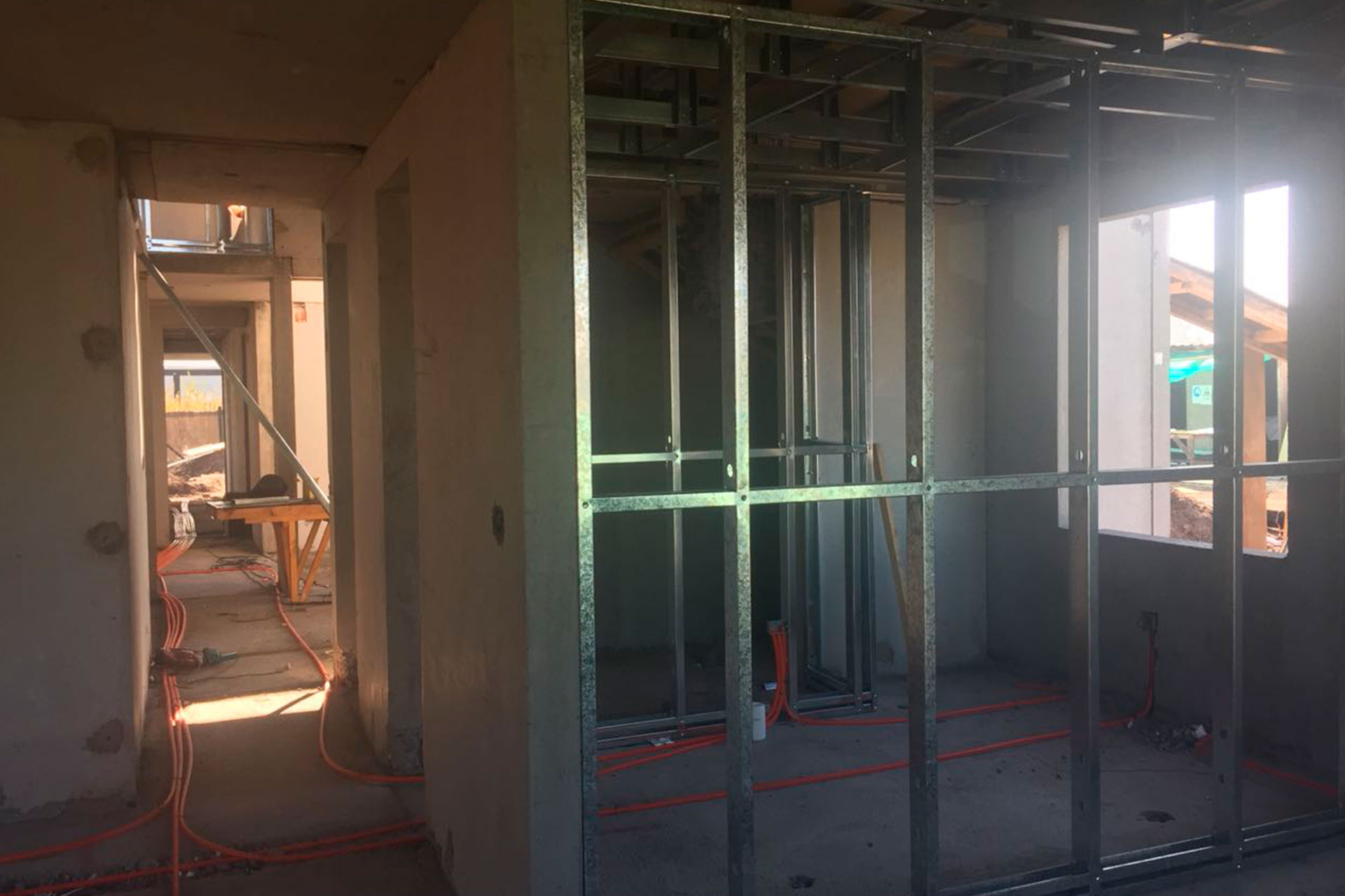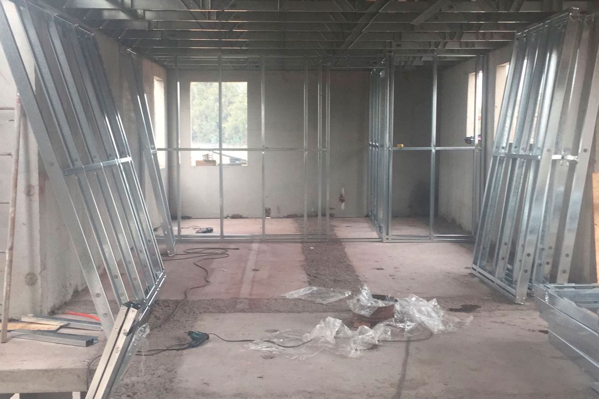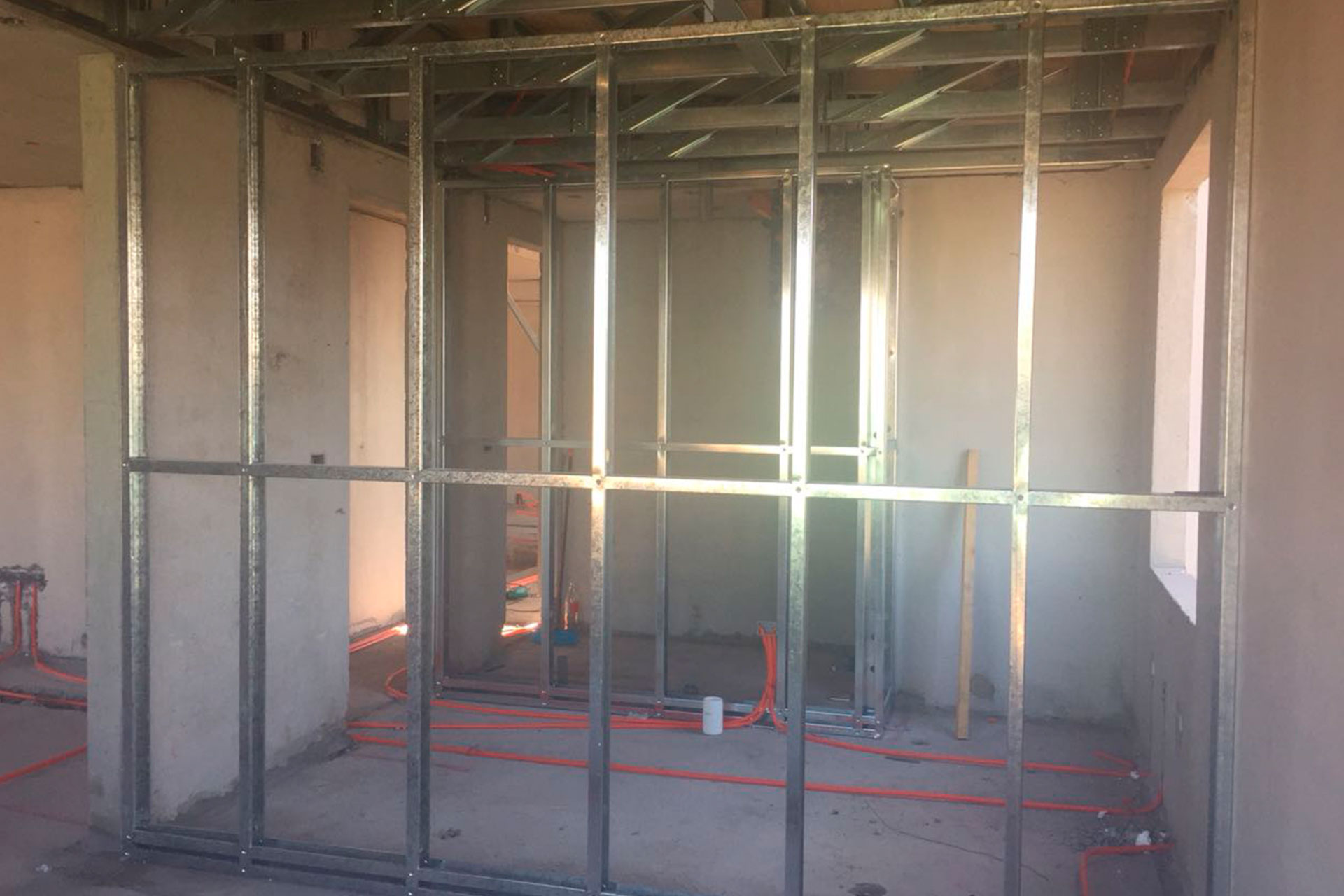 Instalación de tabiques interiores con estructura de acero liviano tipo Steel Frame. Solución rápida, precisa y adaptable.
