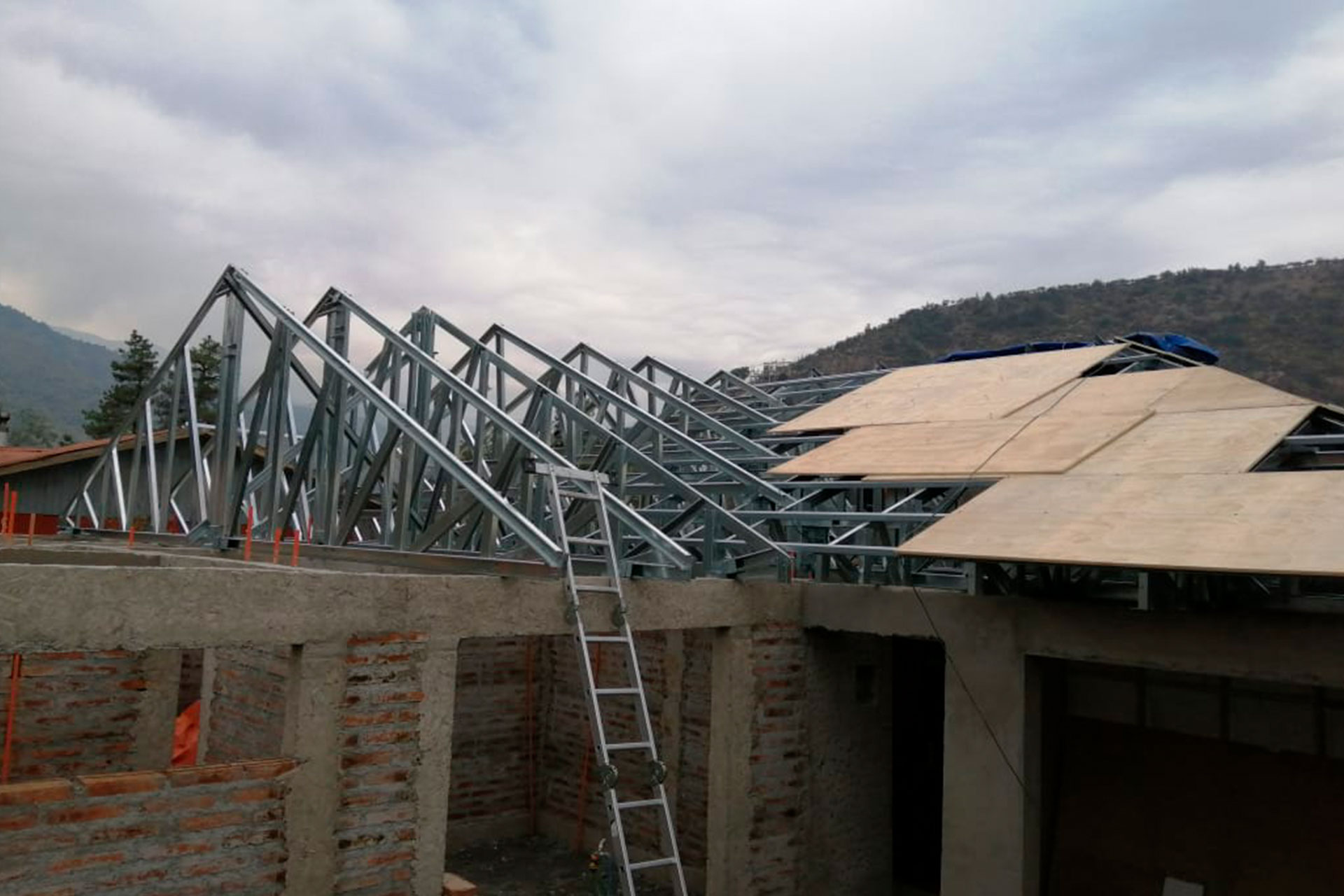 La estructura fue fijada sobre muros de albañilería con anclajes metálicos, y sobre ella se montó un entablado de terciado estructural como soporte de la cubierta final. Este tipo de cerchas permite reducir el peso total de la techumbre en comparación con estructuras tradicionales, facilita la instalación de aislación térmica y conductos eléctricos, y ofrece mayor durabilidad en entornos expuestos.