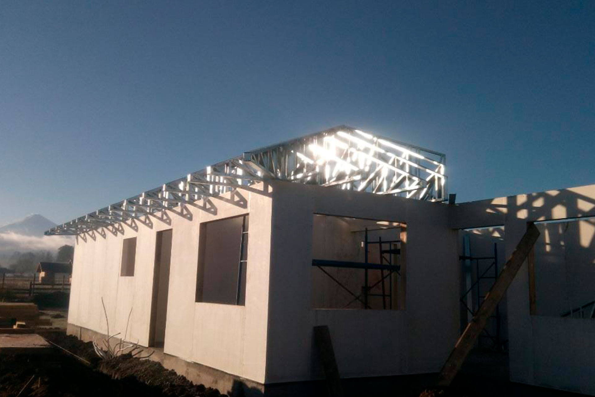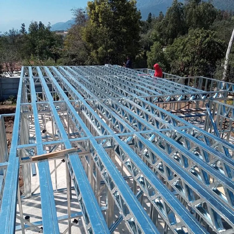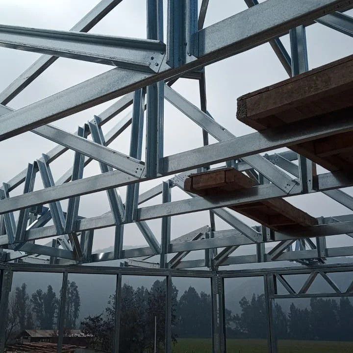 casa con techo a dos aguas, montada en solo 4 días utilizando estructuras de acero liviano. Lo más destacable es que el equipo encargado nunca había trabajado con nuestro sistema. Solo bastó interpretar correctamente los planos de instalación para lograr un resultado eficiente, preciso y sólido.
