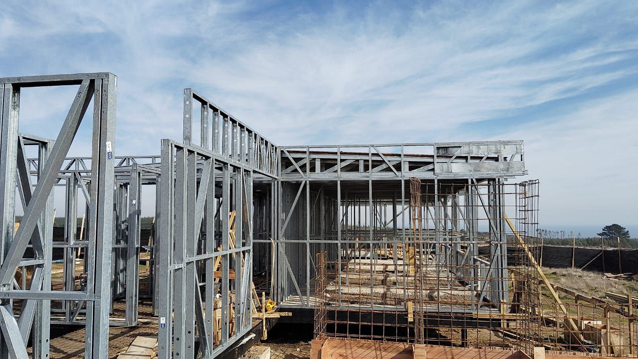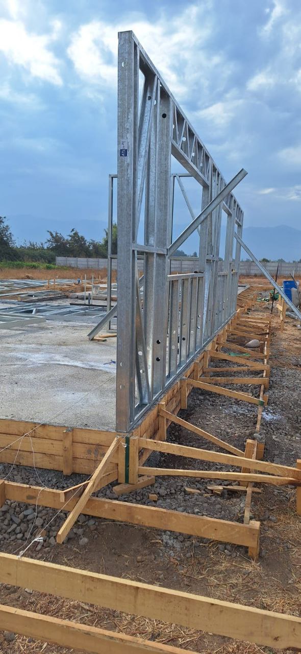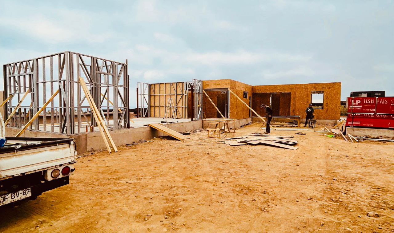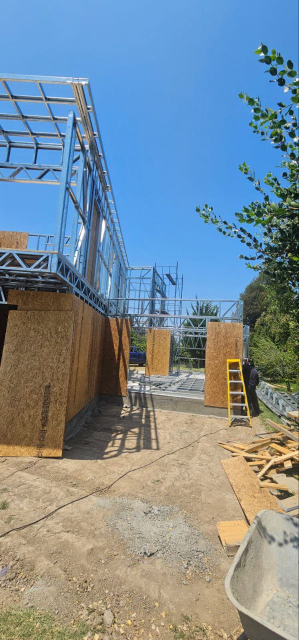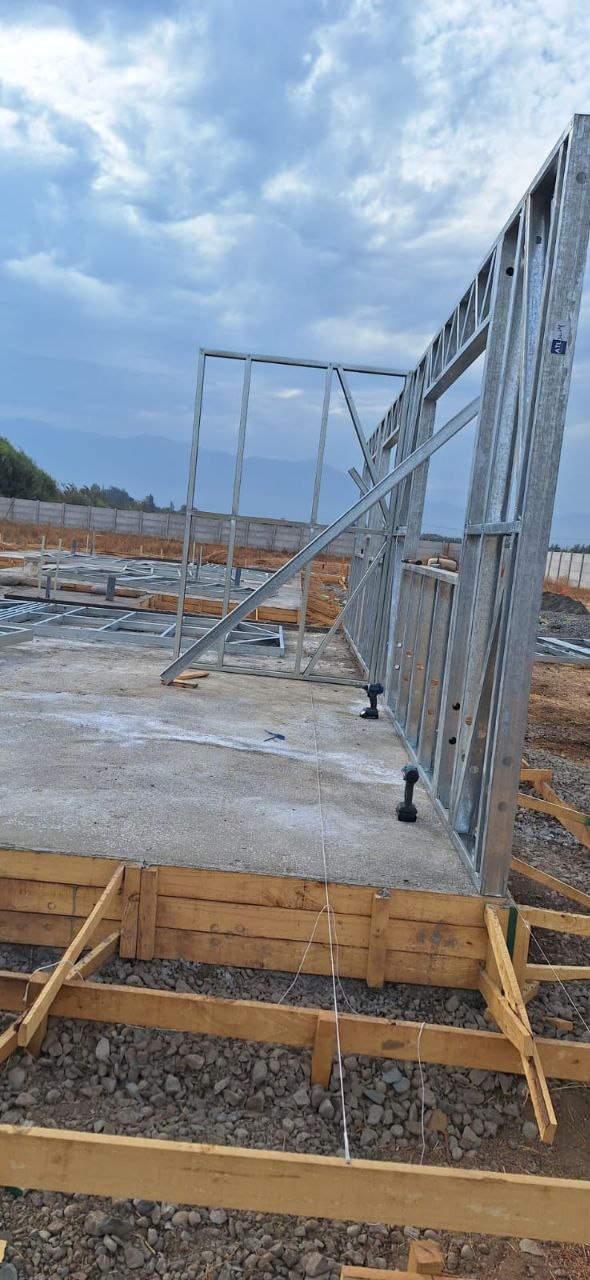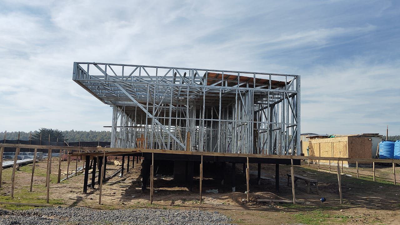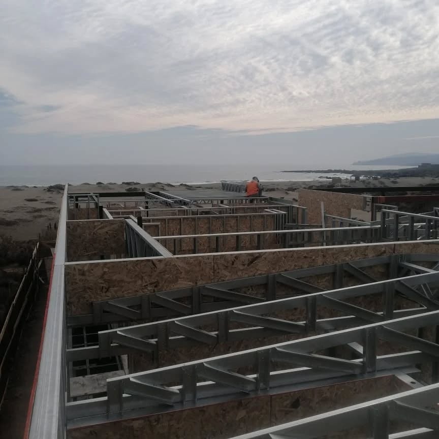 Este proyecto en Bucalemu corresponde a la primera etapa de una vivienda estructurada completamente en acero galvanizado tipo Steel Frame. La obra ya cuenta con la instalación de paneles exteriores con OSB y una cimentación elevada para protección contra humedad. Este tipo de construcción ofrece alta resistencia, menor tiempo de ejecución y eficiencia térmica y estructural, ideal para zonas costeras como Bucalemu. La estructura ya está lista para continuar con el proceso de cerramientos e instalaciones.