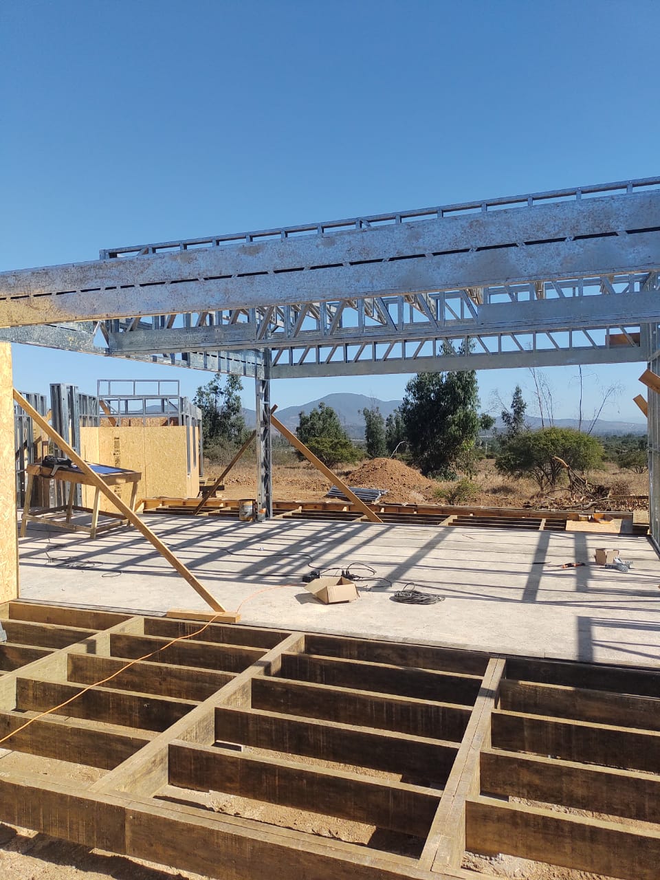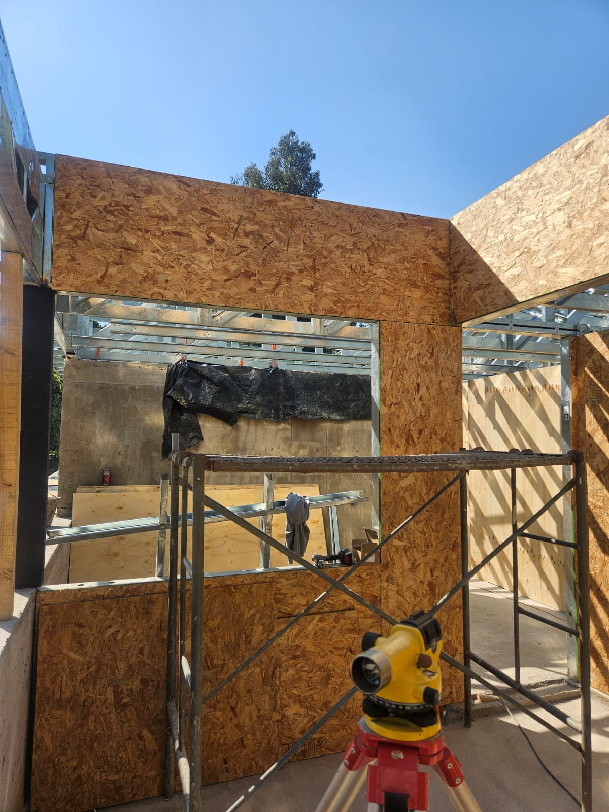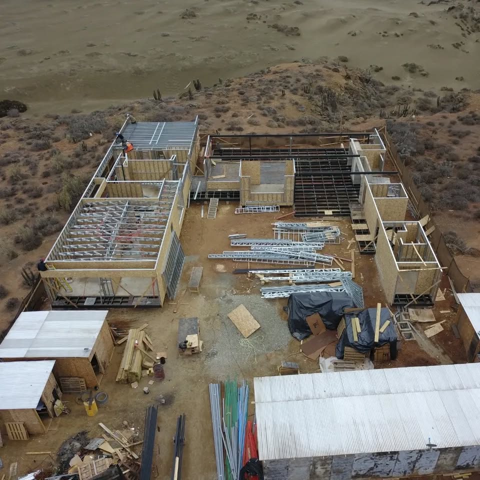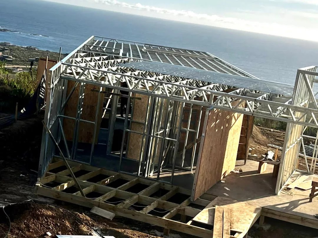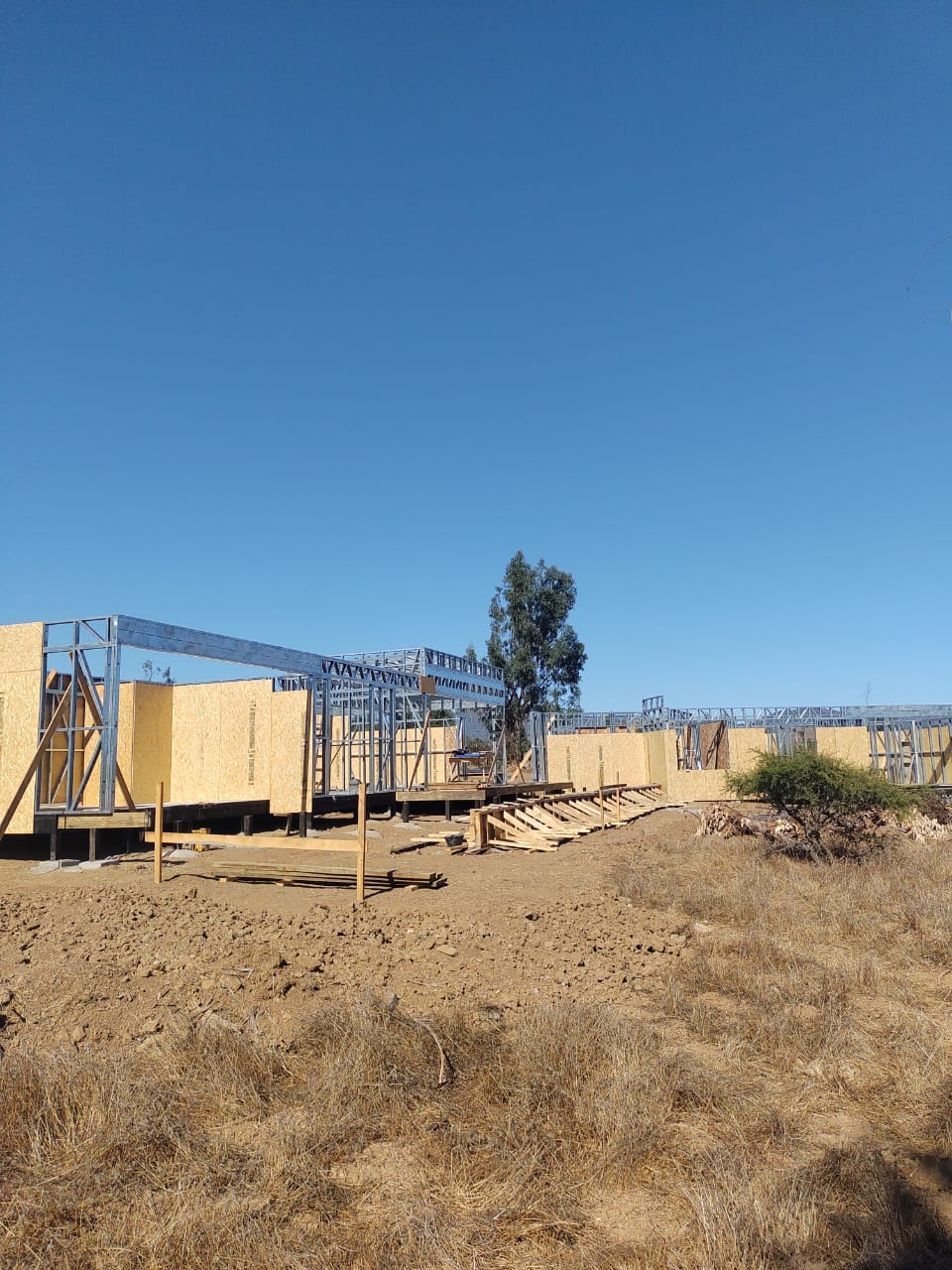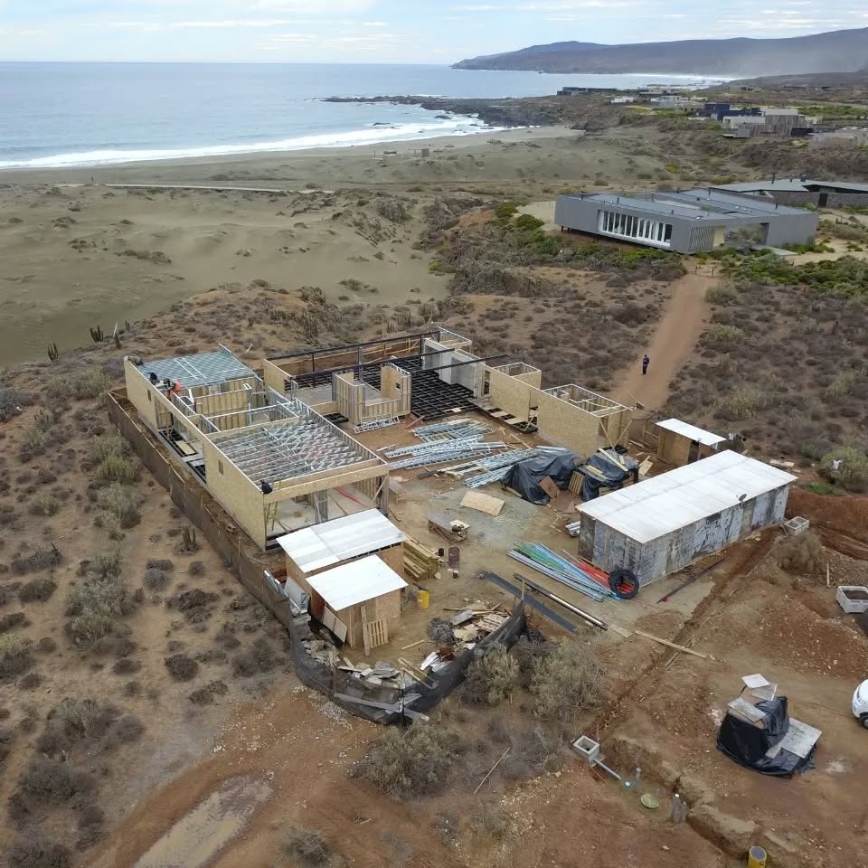 Este proyecto en Bucalemu corresponde a la primera etapa de una vivienda estructurada completamente en acero galvanizado tipo Steel Frame. La obra ya cuenta con la instalación de paneles exteriores con OSB y una cimentación elevada para protección contra humedad. Este tipo de construcción ofrece alta resistencia, menor tiempo de ejecución y eficiencia térmica y estructural, ideal para zonas costeras como Bucalemu. La estructura ya está lista para continuar con el proceso de cerramientos e instalaciones.