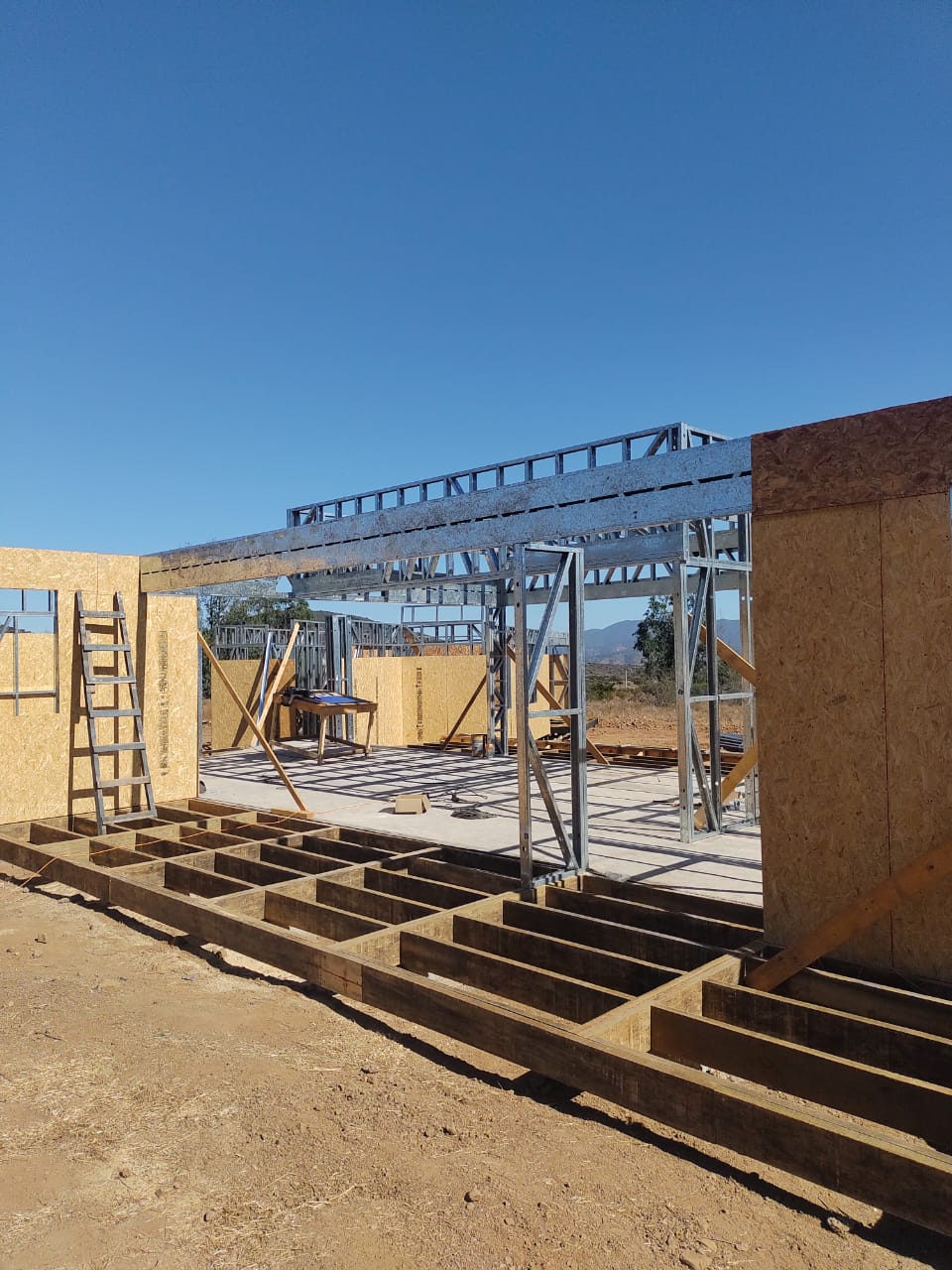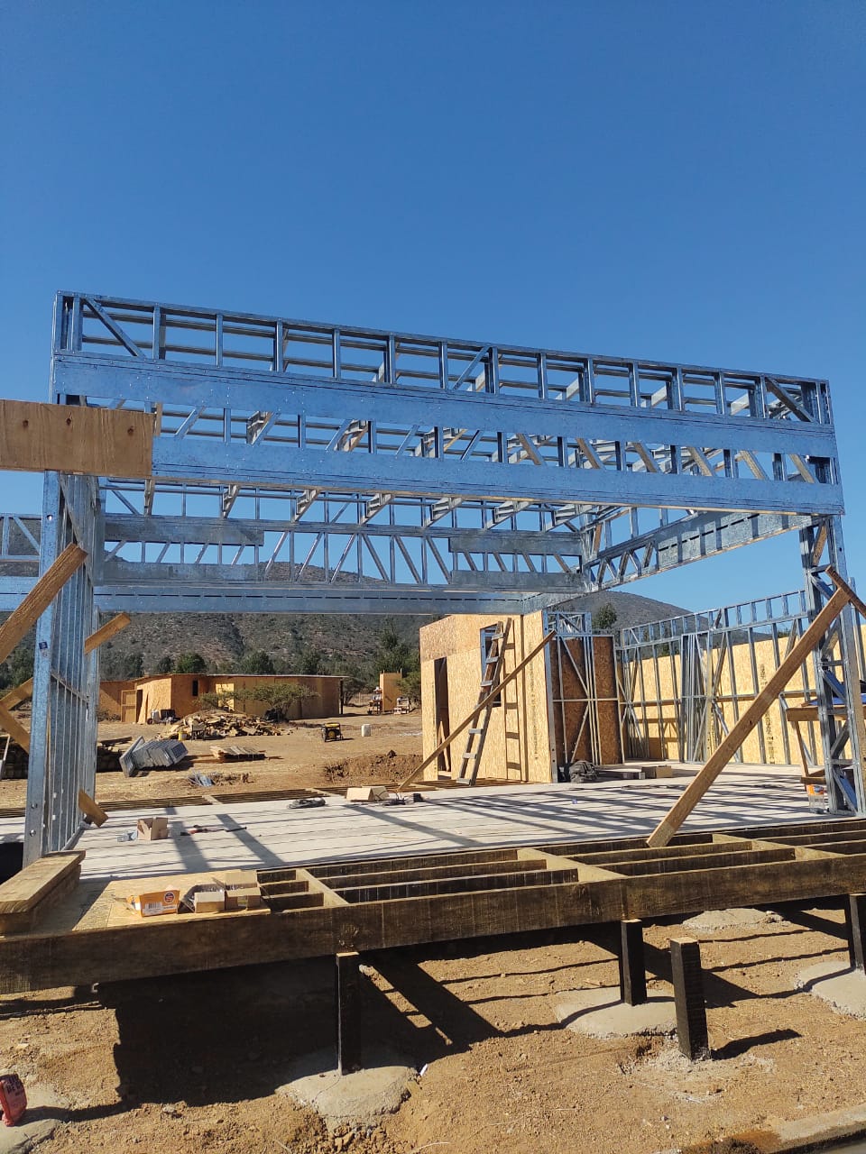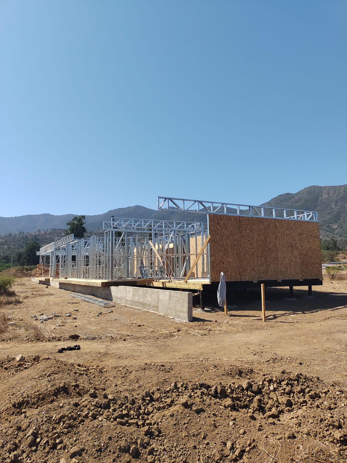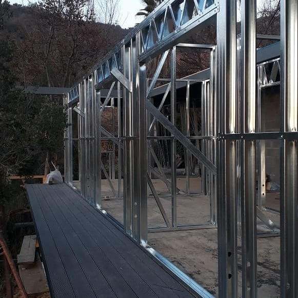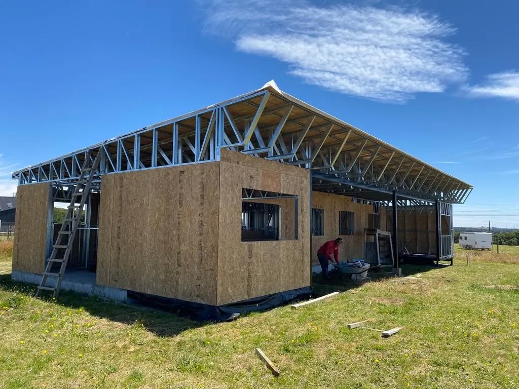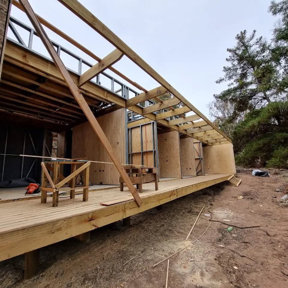 Este proyecto en Bucalemu corresponde a la primera etapa de una vivienda estructurada completamente en acero galvanizado tipo Steel Frame. La obra ya cuenta con la instalación de paneles exteriores con OSB y una cimentación elevada para protección contra humedad. Este tipo de construcción ofrece alta resistencia, menor tiempo de ejecución y eficiencia térmica y estructural, ideal para zonas costeras como Bucalemu. La estructura ya está lista para continuar con el proceso de cerramientos e instalaciones.