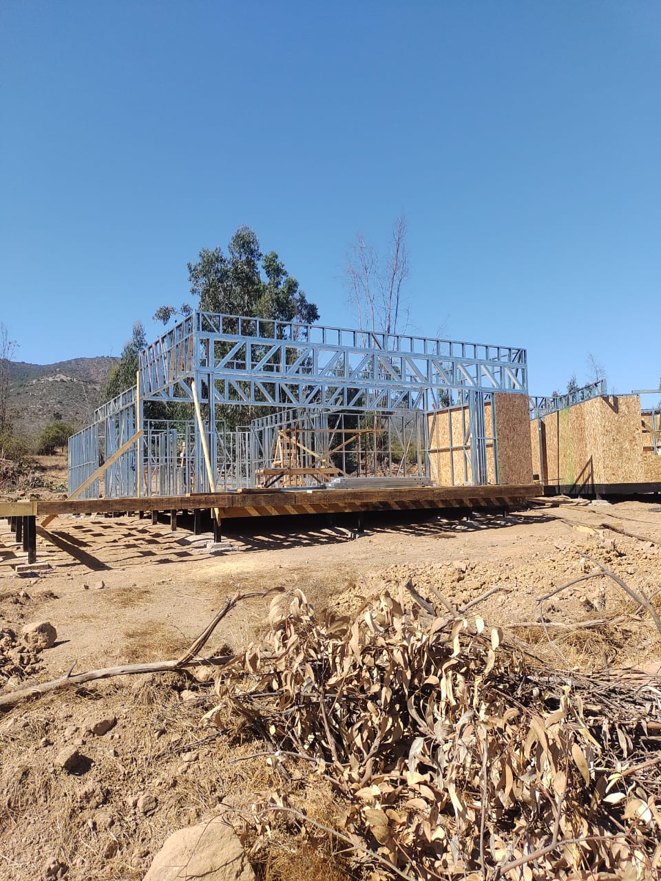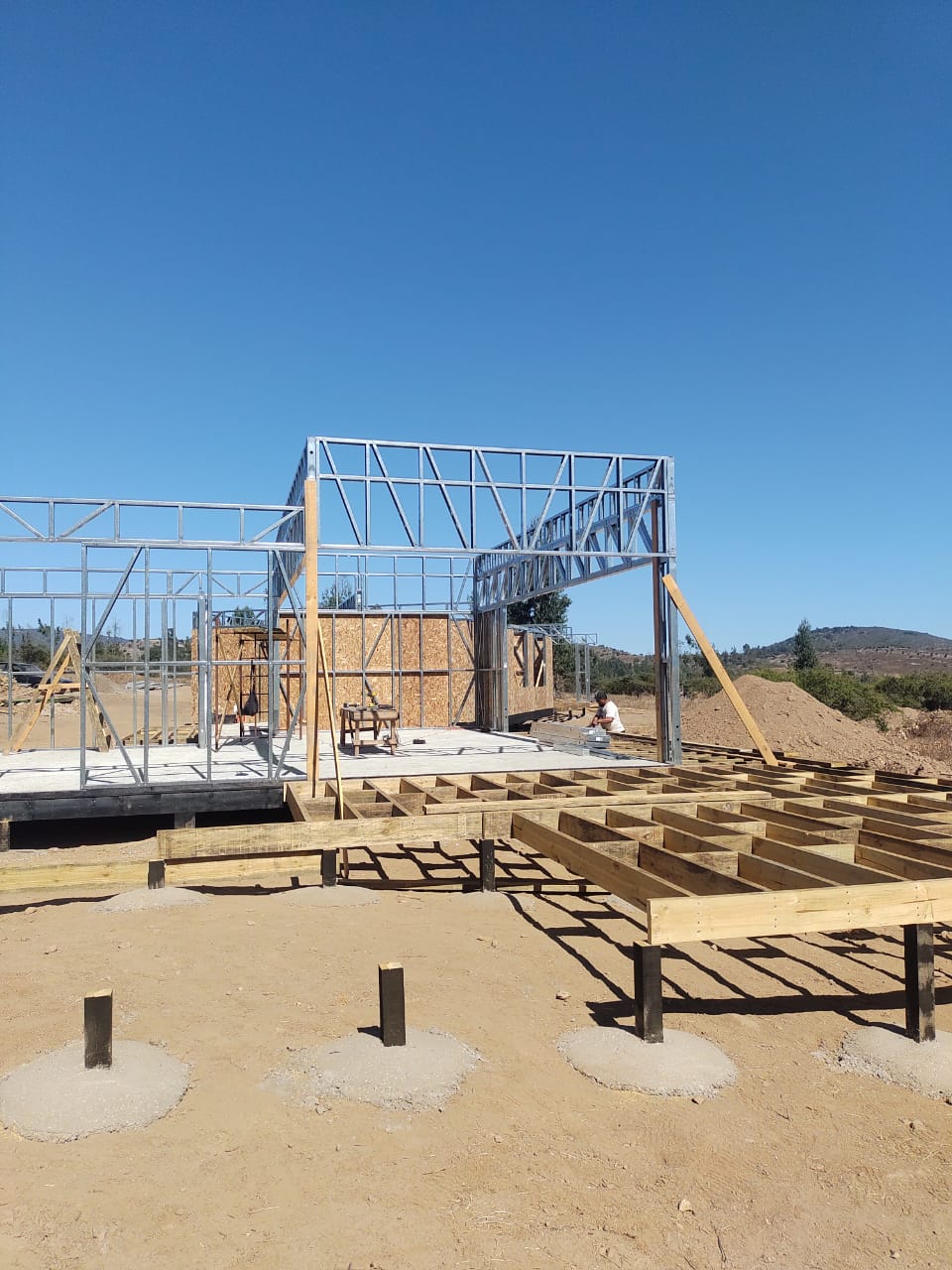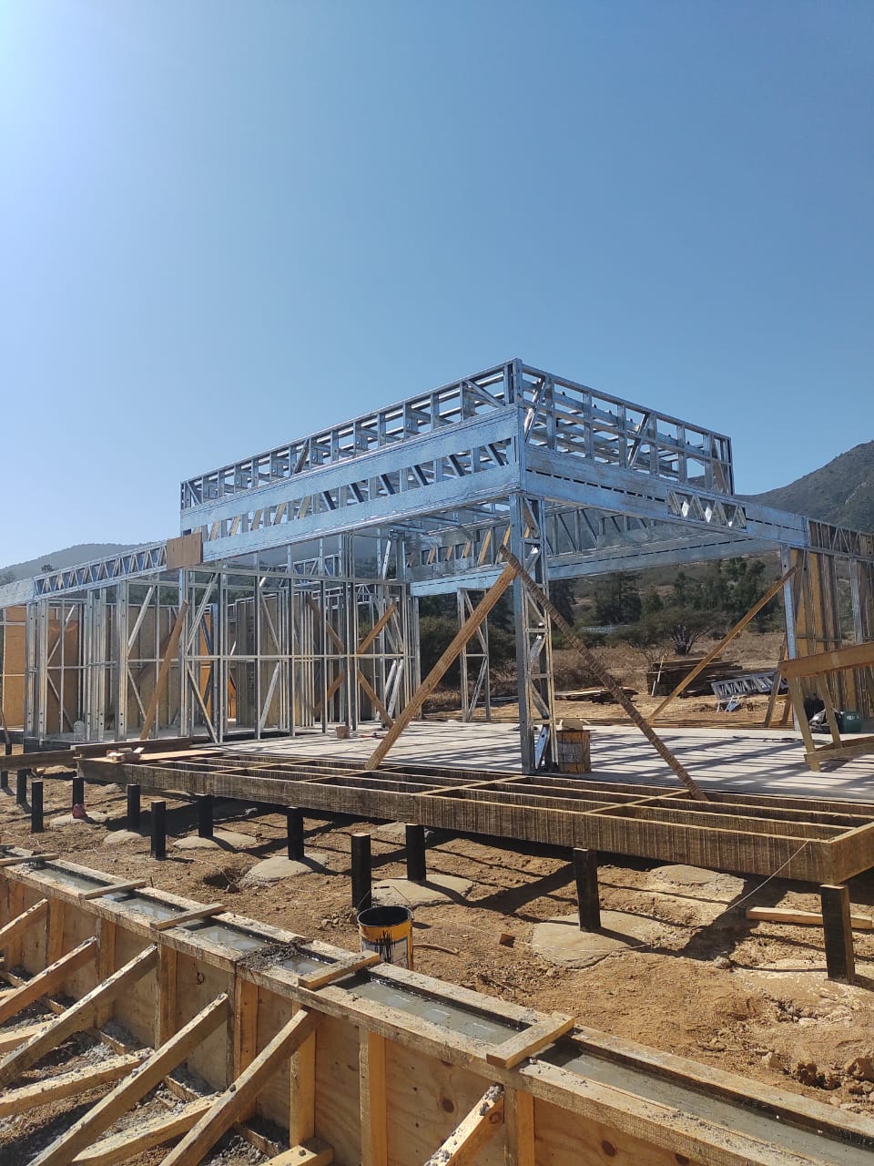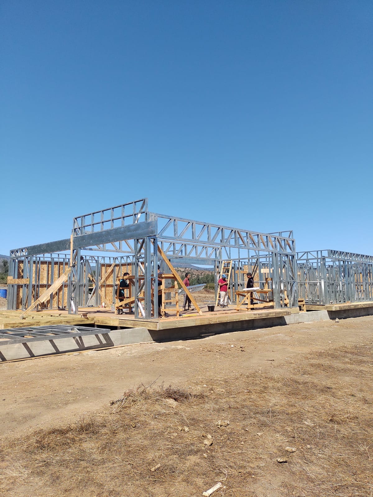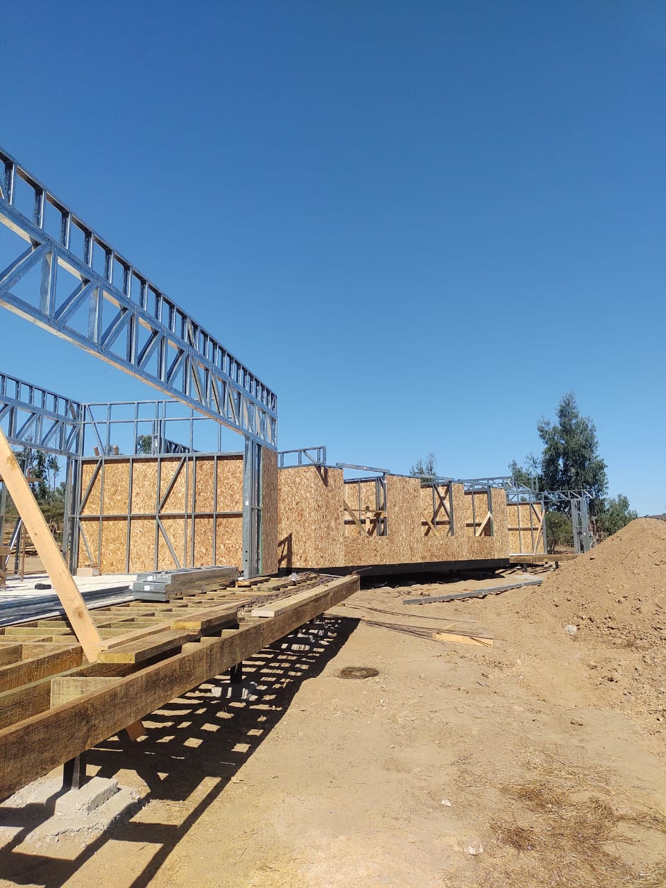 Este proyecto en Bucalemu corresponde a la primera etapa de una vivienda estructurada completamente en acero galvanizado tipo Steel Frame. La obra ya cuenta con la instalación de paneles exteriores con OSB y una cimentación elevada para protección contra humedad. Este tipo de construcción ofrece alta resistencia, menor tiempo de ejecución y eficiencia térmica y estructural, ideal para zonas costeras como Bucalemu. La estructura ya está lista para continuar con el proceso de cerramientos e instalaciones.