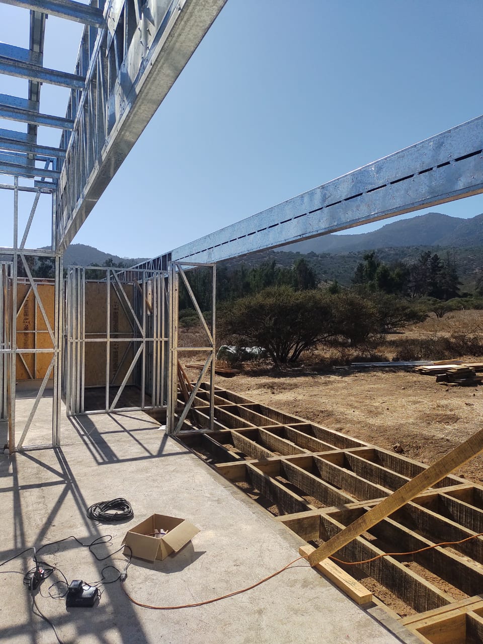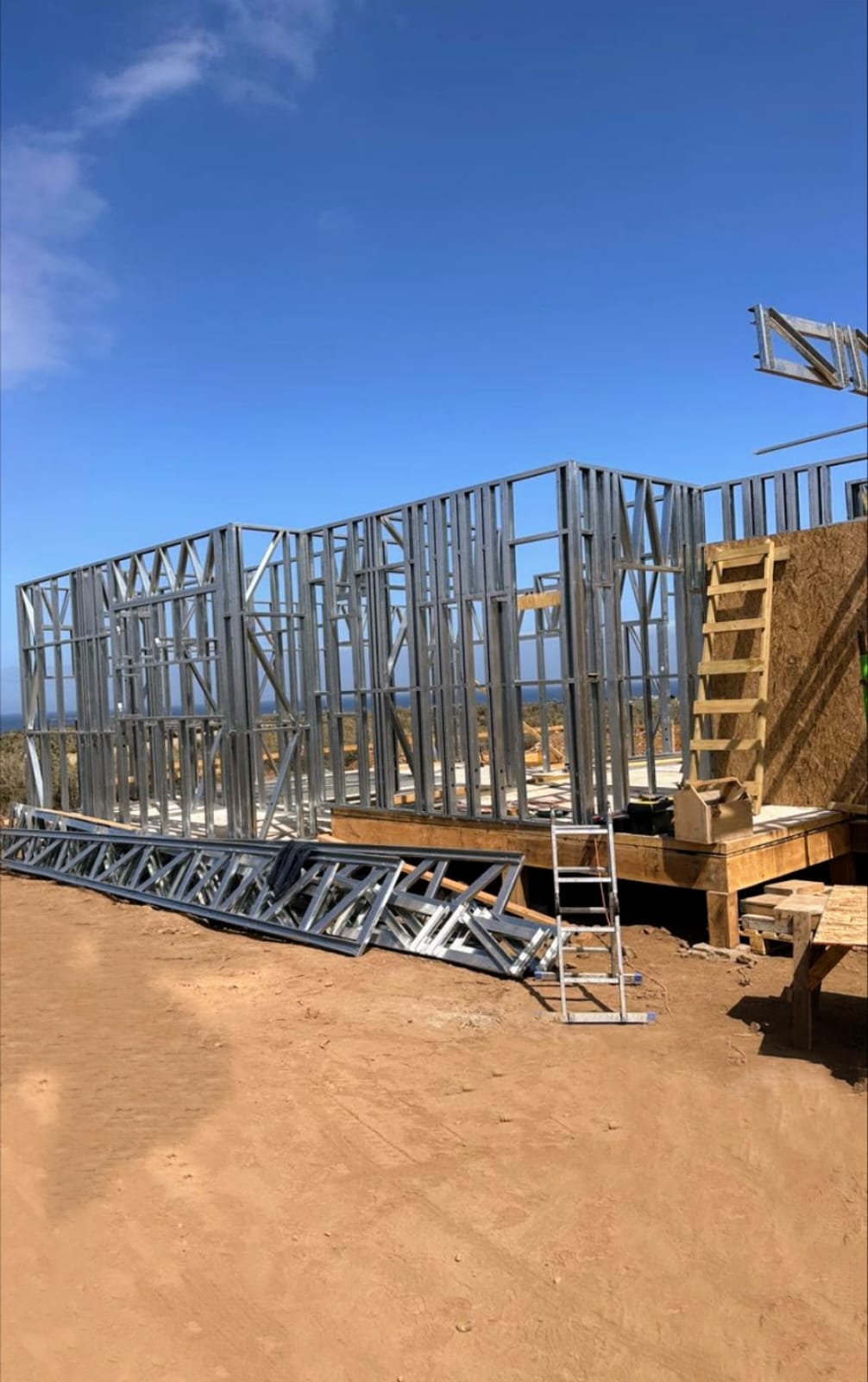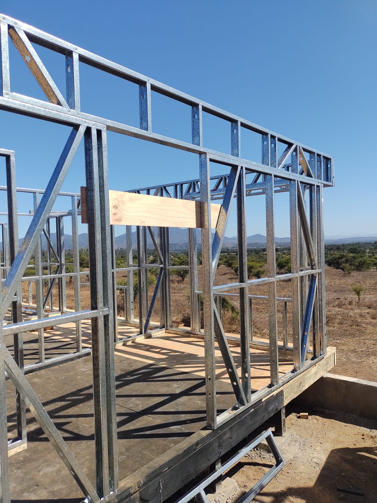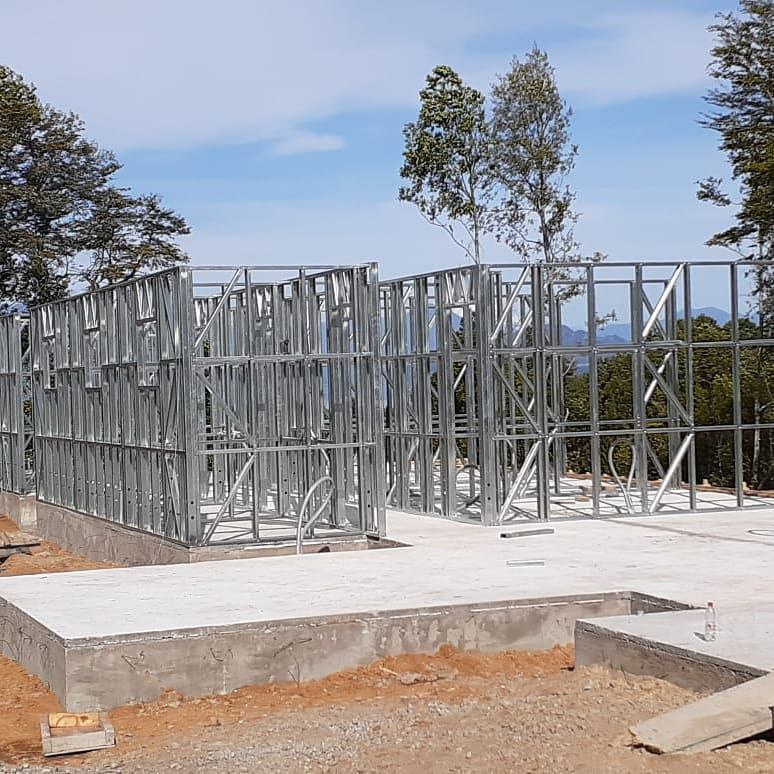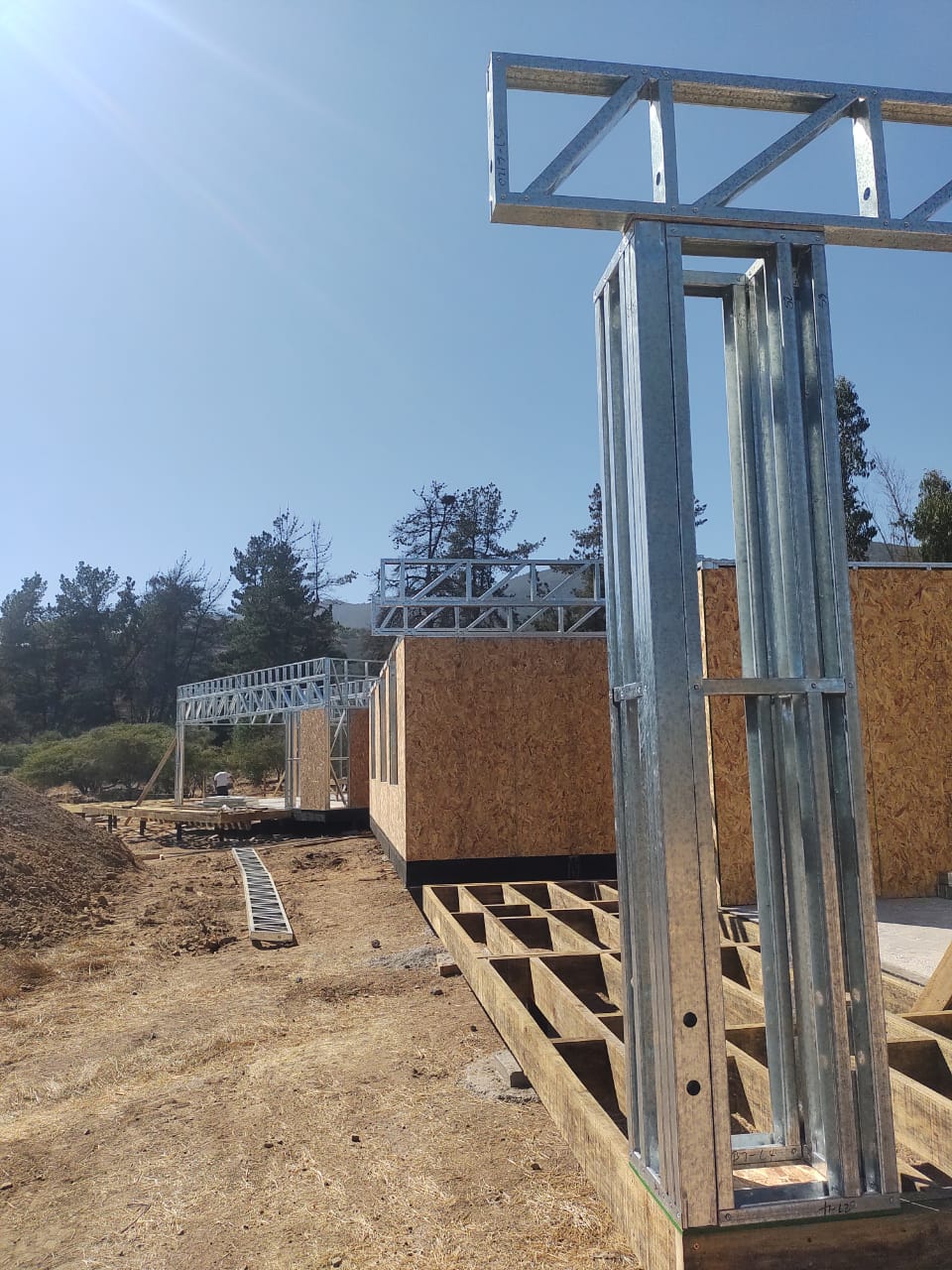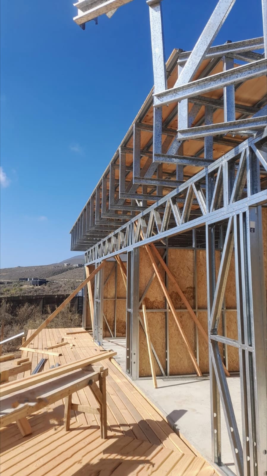 Este proyecto en Bucalemu corresponde a la primera etapa de una vivienda estructurada completamente en acero galvanizado tipo Steel Frame. La obra ya cuenta con la instalación de paneles exteriores con OSB y una cimentación elevada para protección contra humedad. Este tipo de construcción ofrece alta resistencia, menor tiempo de ejecución y eficiencia térmica y estructural, ideal para zonas costeras como Bucalemu. La estructura ya está lista para continuar con el proceso de cerramientos e instalaciones.