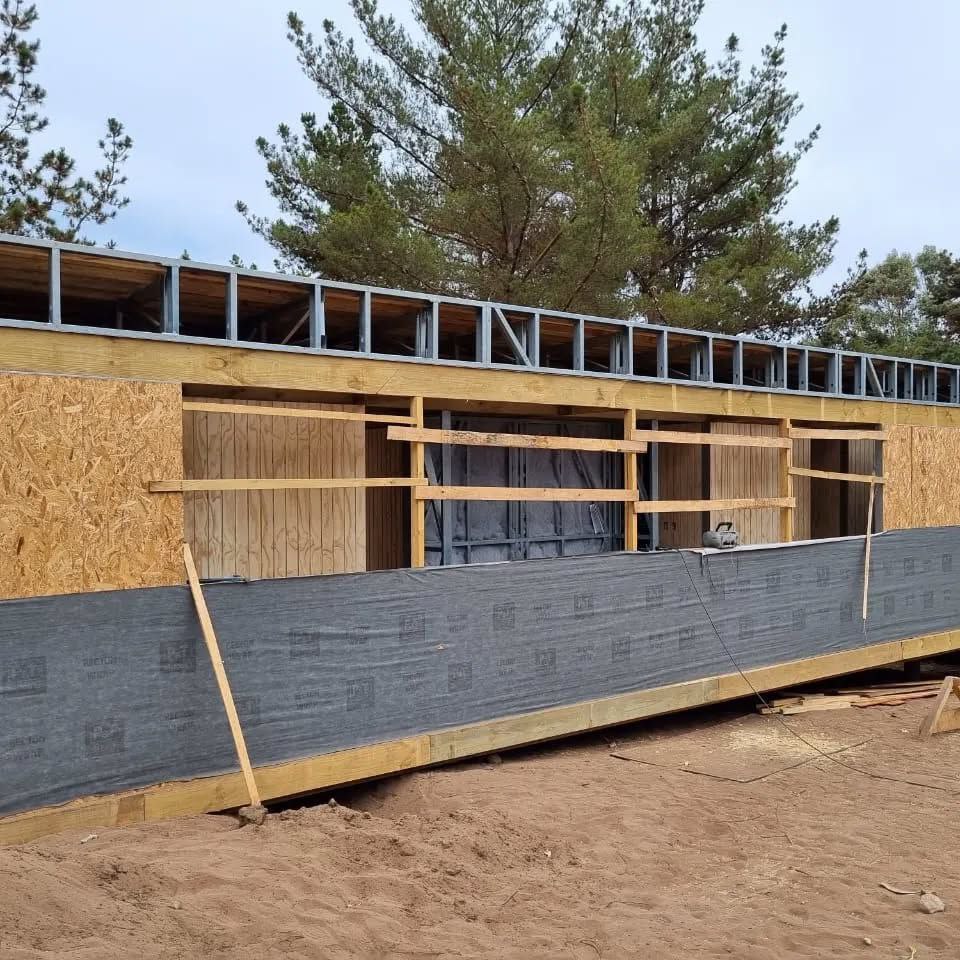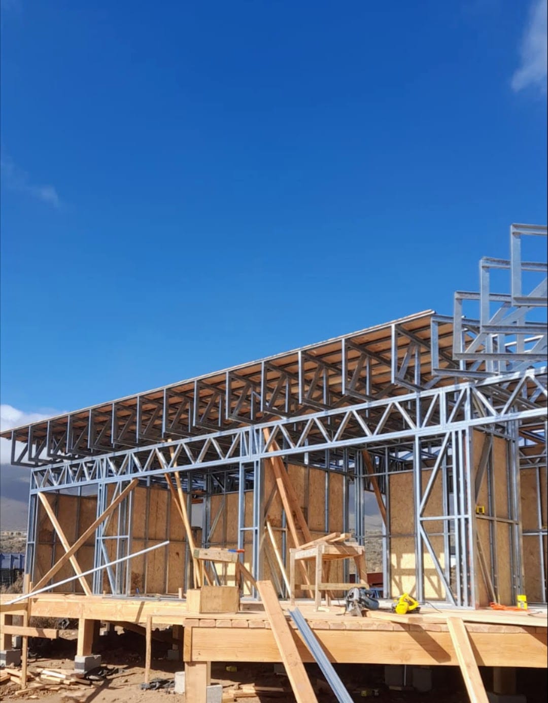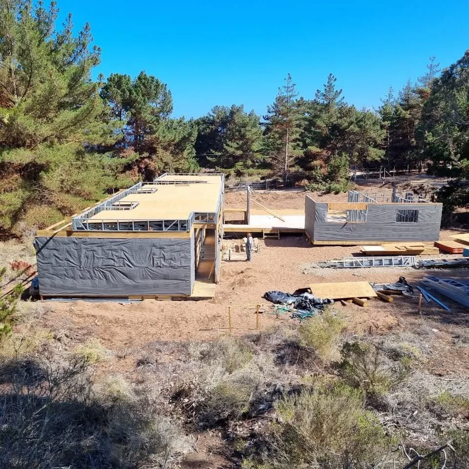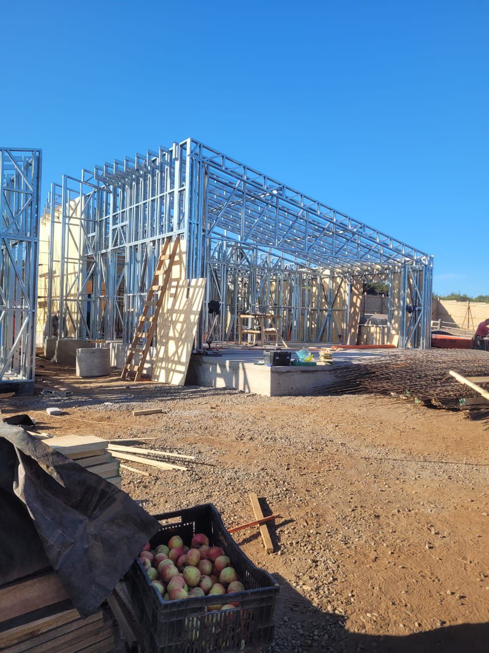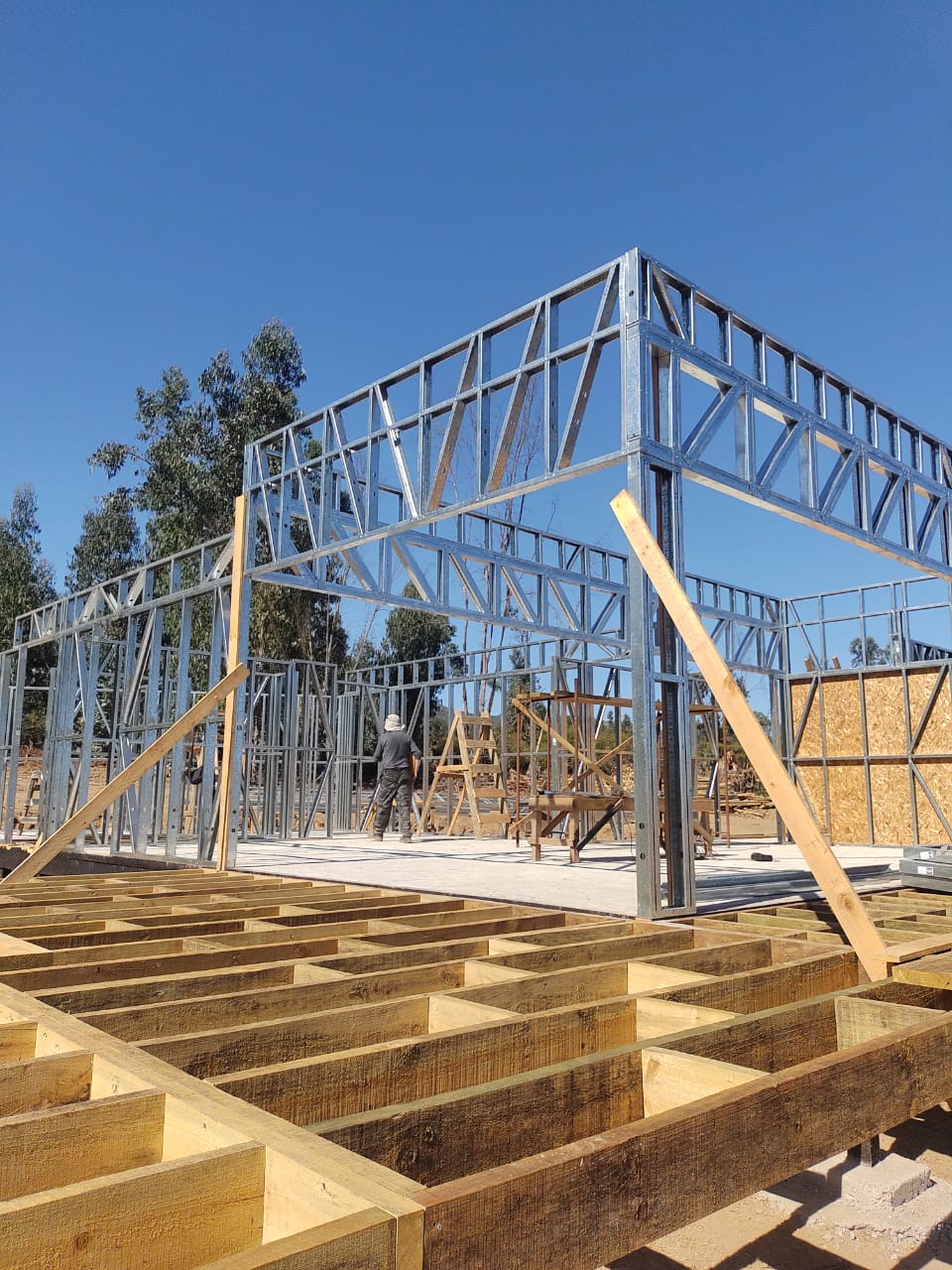 Este proyecto en Bucalemu corresponde a la primera etapa de una vivienda estructurada completamente en acero galvanizado tipo Steel Frame. La obra ya cuenta con la instalación de paneles exteriores con OSB y una cimentación elevada para protección contra humedad. Este tipo de construcción ofrece alta resistencia, menor tiempo de ejecución y eficiencia térmica y estructural, ideal para zonas costeras como Bucalemu. La estructura ya está lista para continuar con el proceso de cerramientos e instalaciones.