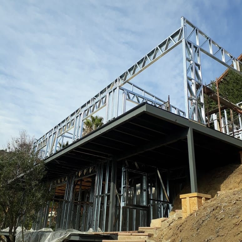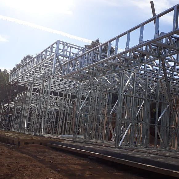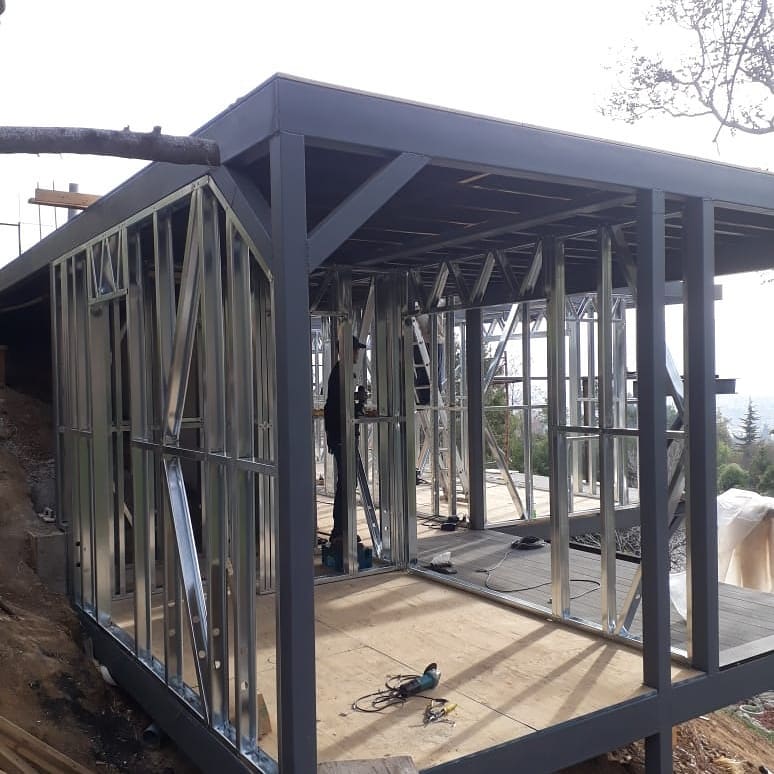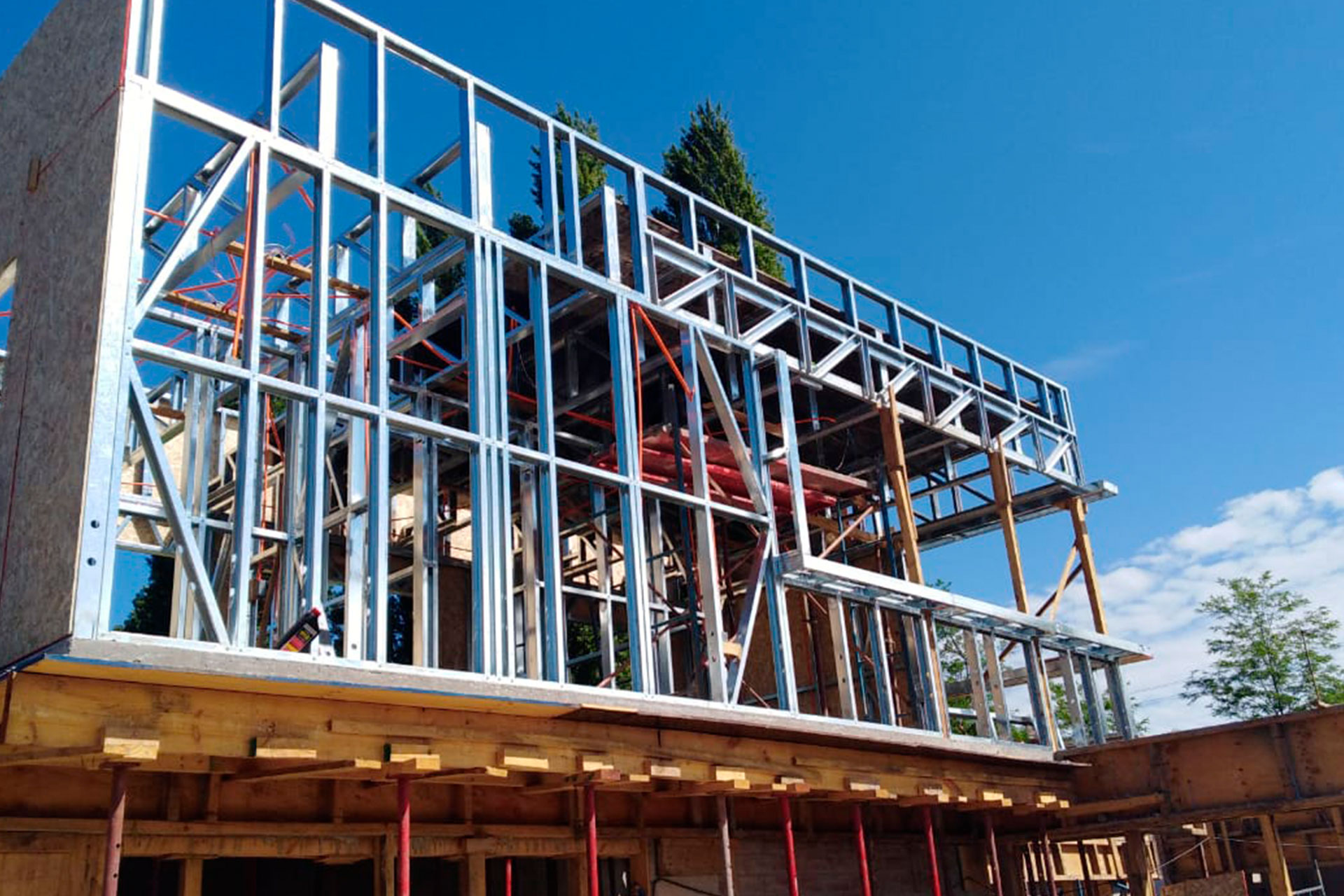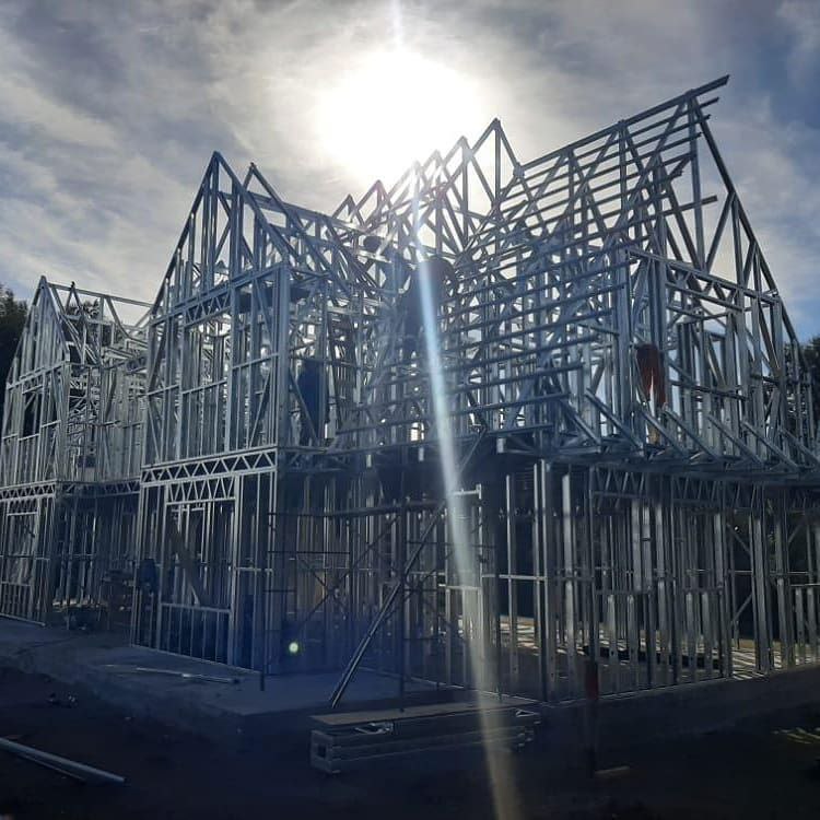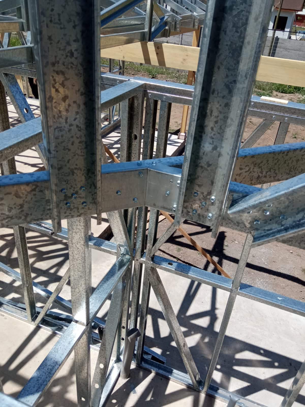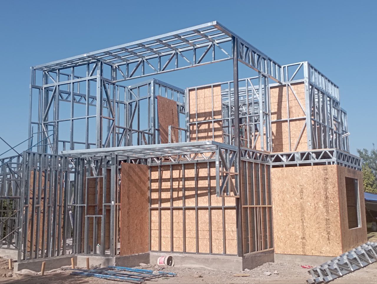 Estructura de acero para vivienda de dos pisos, con detalles de forrado en proceso y alta precisión en la ejecución.