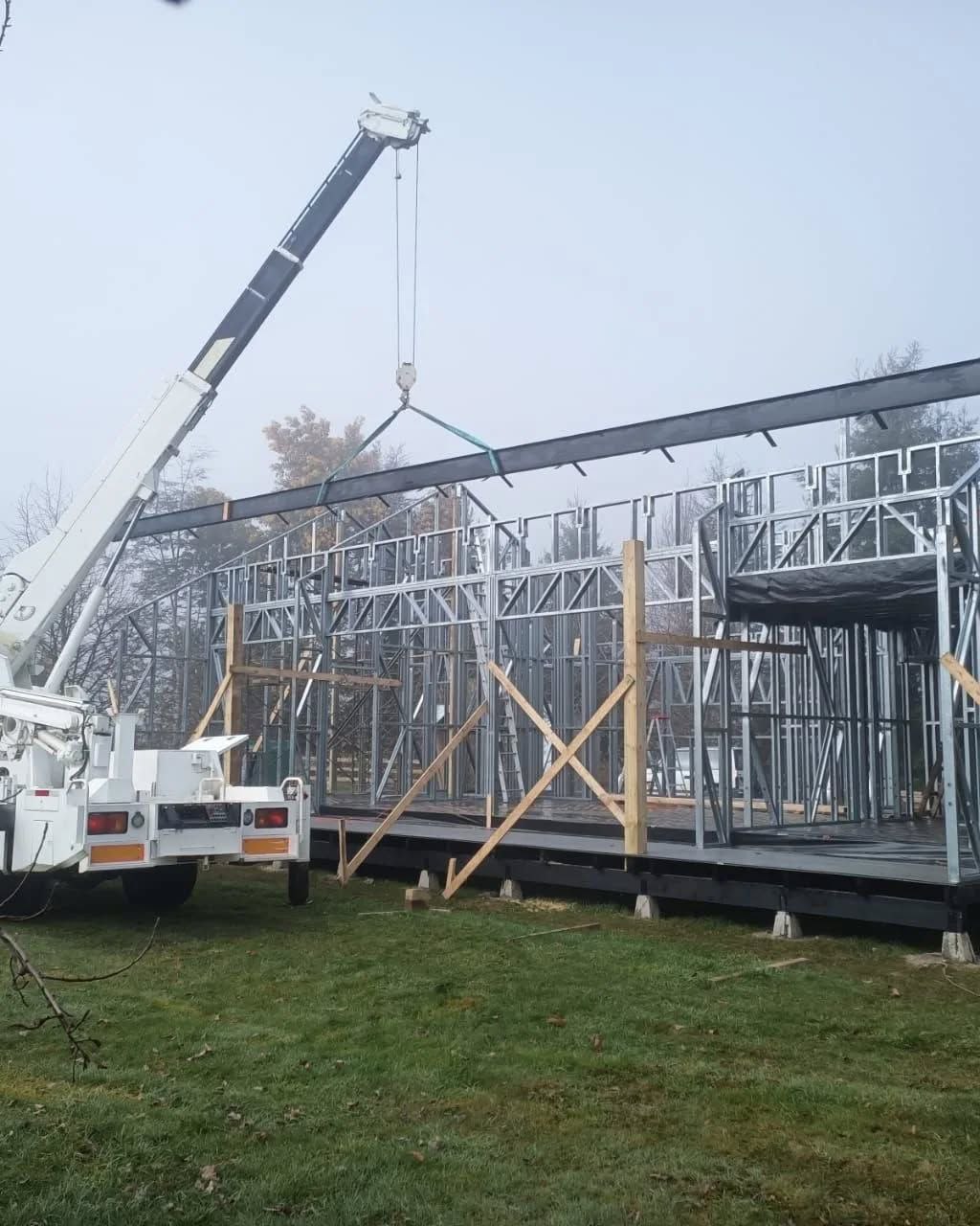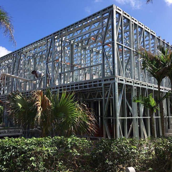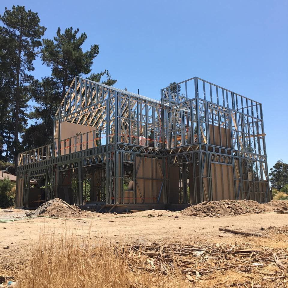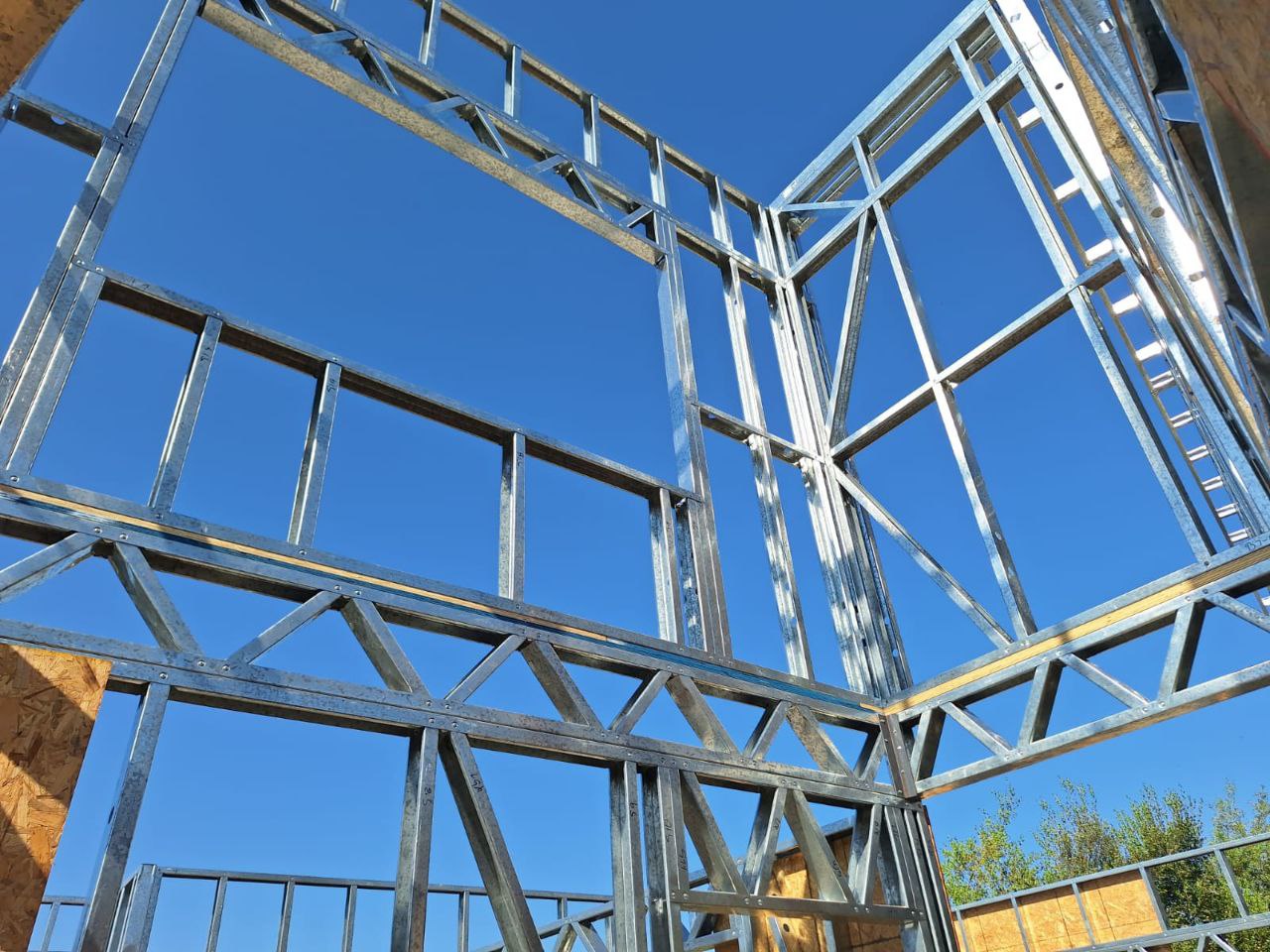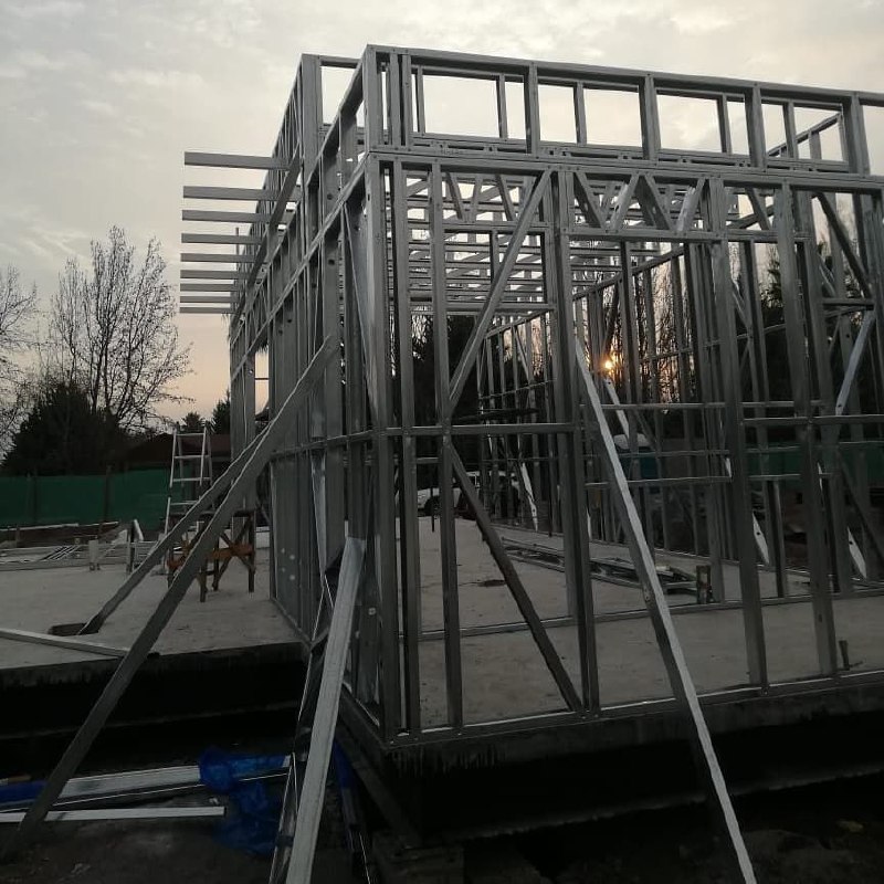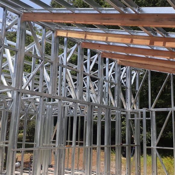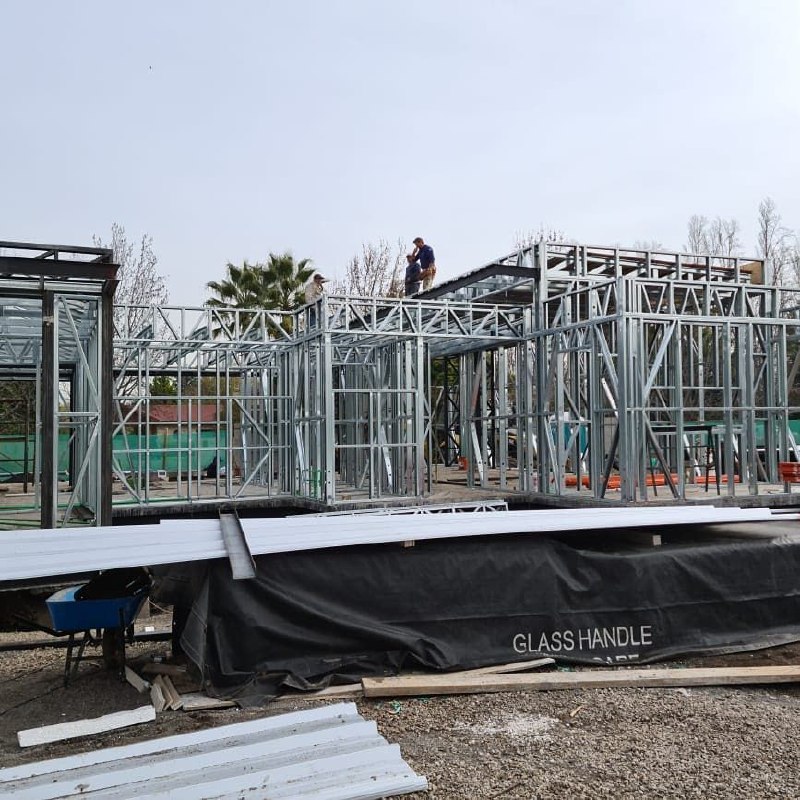 Estructura de acero para vivienda de dos pisos, con detalles de forrado en proceso y alta precisión en la ejecución.