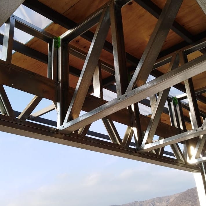 Se utilizaron vigas reticuladas y una configuración estructural que permite un ensamble rápido, liviano y resistente, ideal para construcciones en zonas urbanas con espacios limitados.