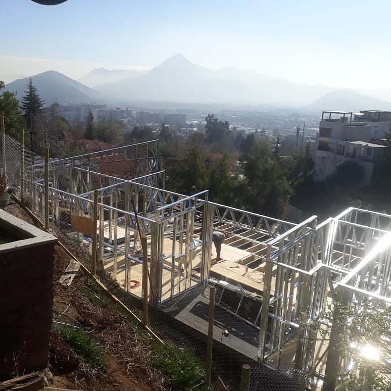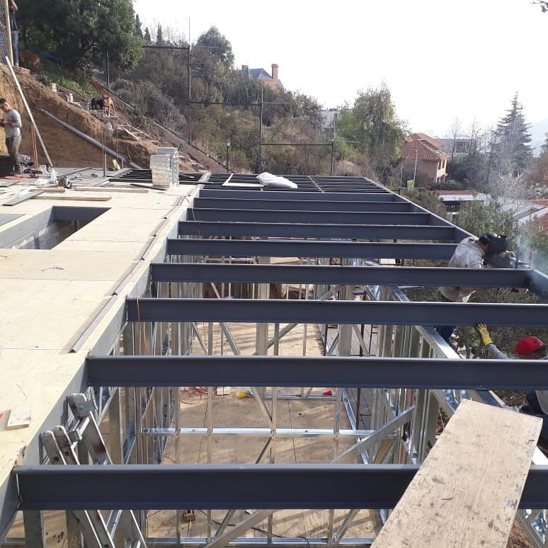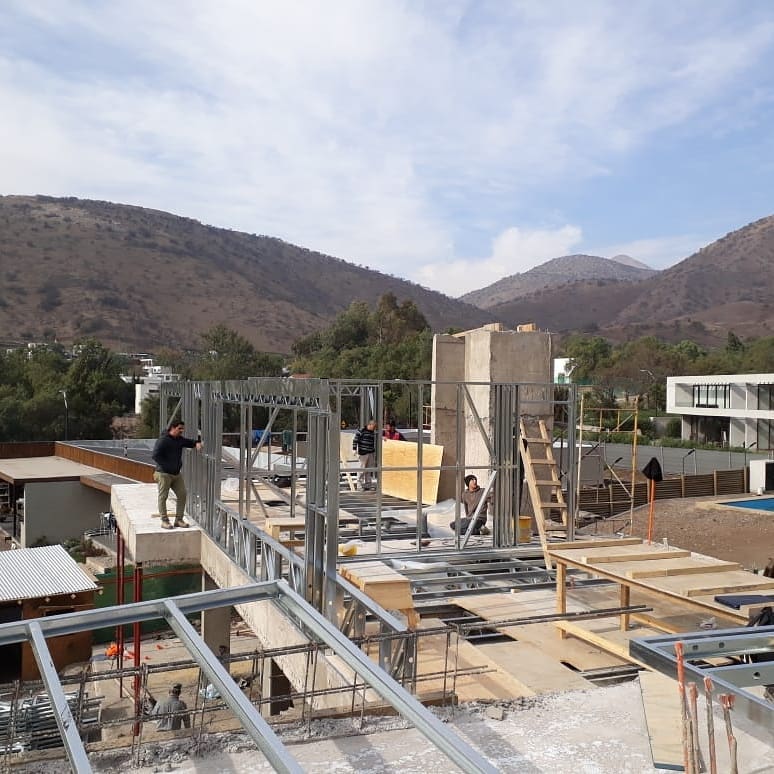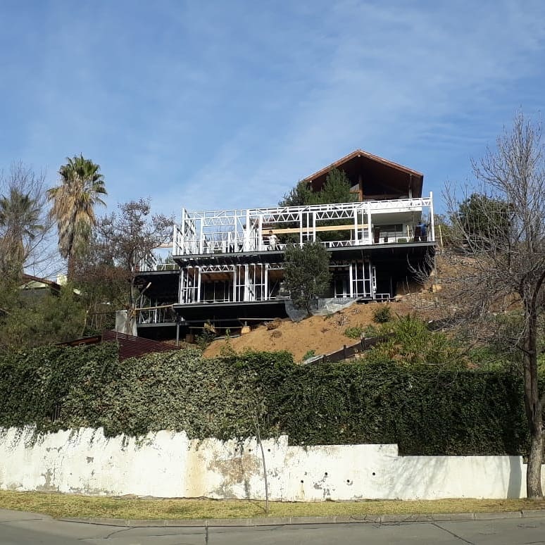 Proyecto habitacional desarrollado en la comuna de Las Condes. Esta vivienda de dos niveles refleja la exactitud y calidad de nuestras estructuras de acero galvanizado. En las imágenes se aprecia parte del proceso de forrado, donde se combinan eficiencia técnica y acabados limpios para lograr un resultado sólido y estéticamente equilibrado.
