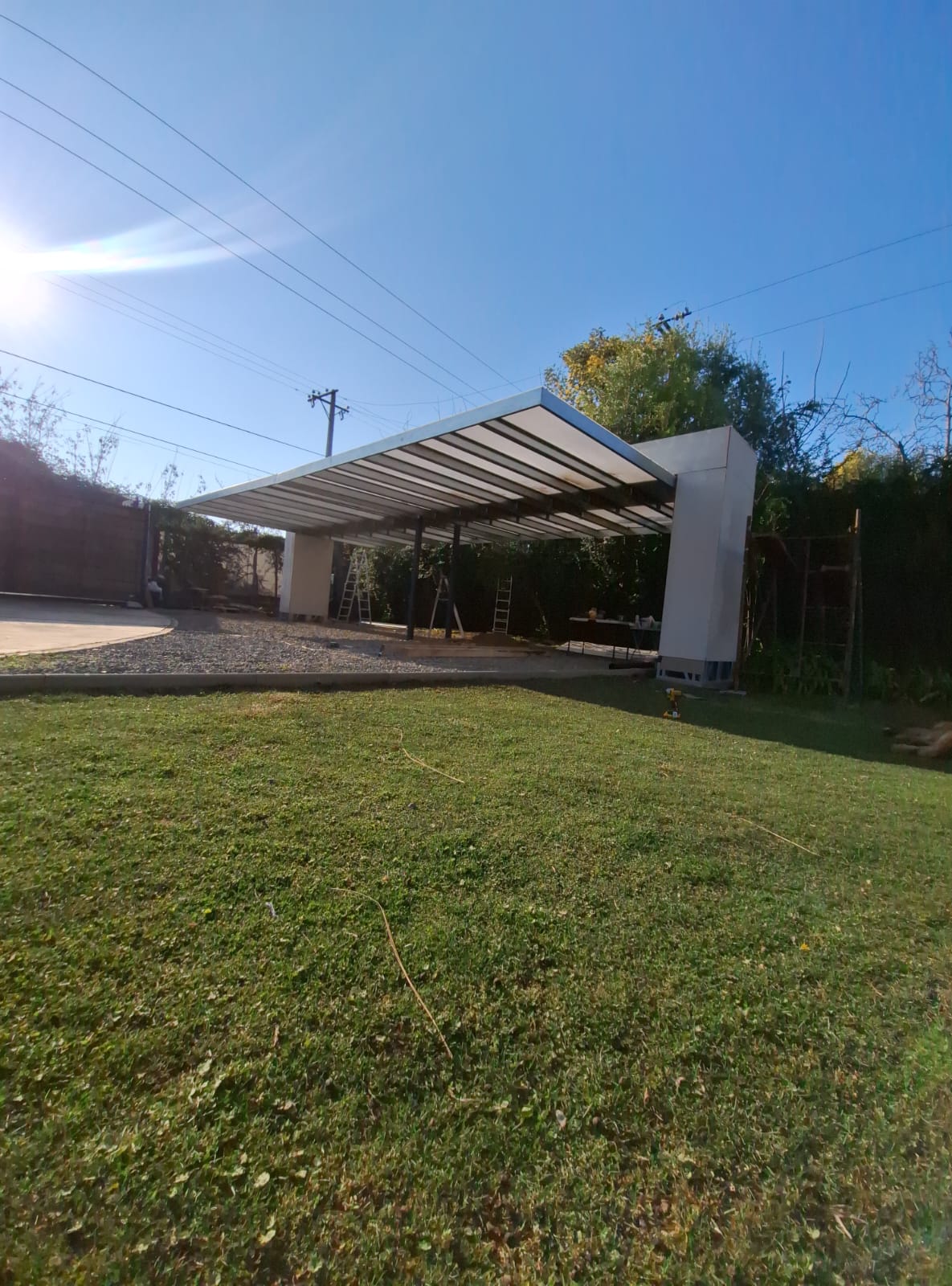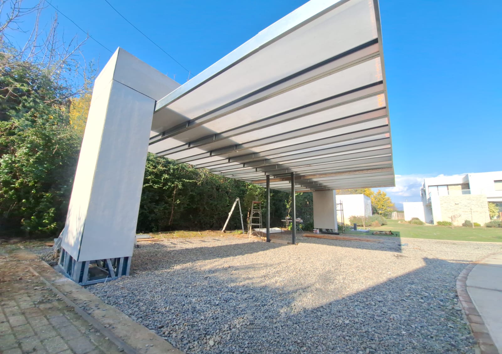 Se ejecutó la instalación de techumbre diseñada específicamente para cubrir una terraza y estacionamiento. Gracias a la planificación previa y el diseño a medida, se logró un montaje preciso, funcional y de alta durabilidad.