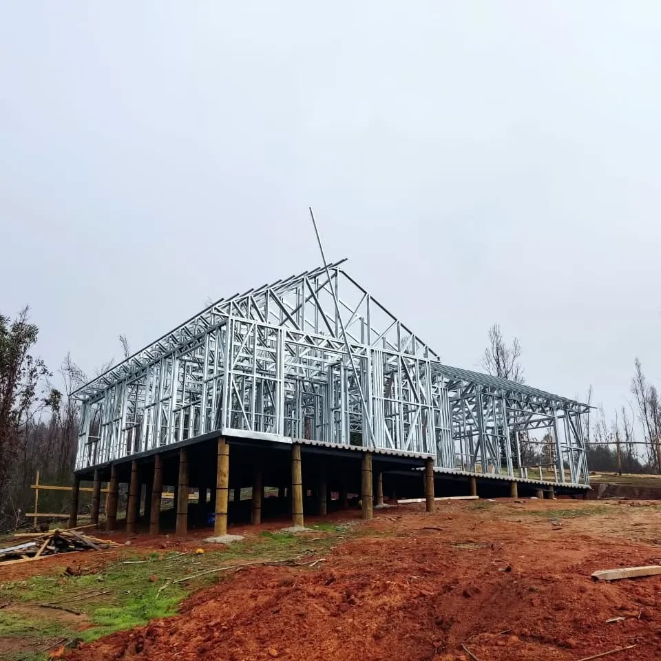 Este proyecto en Pichilemu contempla el montaje completo de una estructura de acero galvanizado tipo Steel Frame, elevada sobre una fundación en pilotes metálicos, ideal para enfrentar condiciones del terreno húmedo y salino característico de zonas costeras.