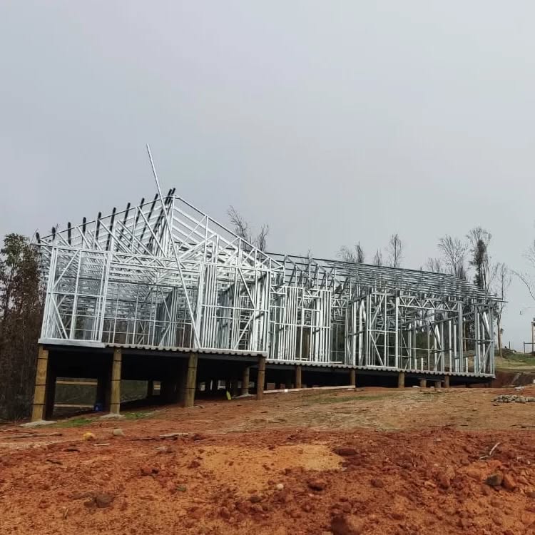 La estructura incorpora muros portantes, divisiones interiores, refuerzos en vanos estructurales y cerchas livianas, todo fabricado bajo diseño técnico y corte automatizado, lo que garantiza precisión y rapidez de ejecución. La solución en altura favorece la ventilación inferior, reduce el contacto con la humedad del terreno y permite adaptarse a pendientes o desniveles sin necesidad de rellenos masivos.