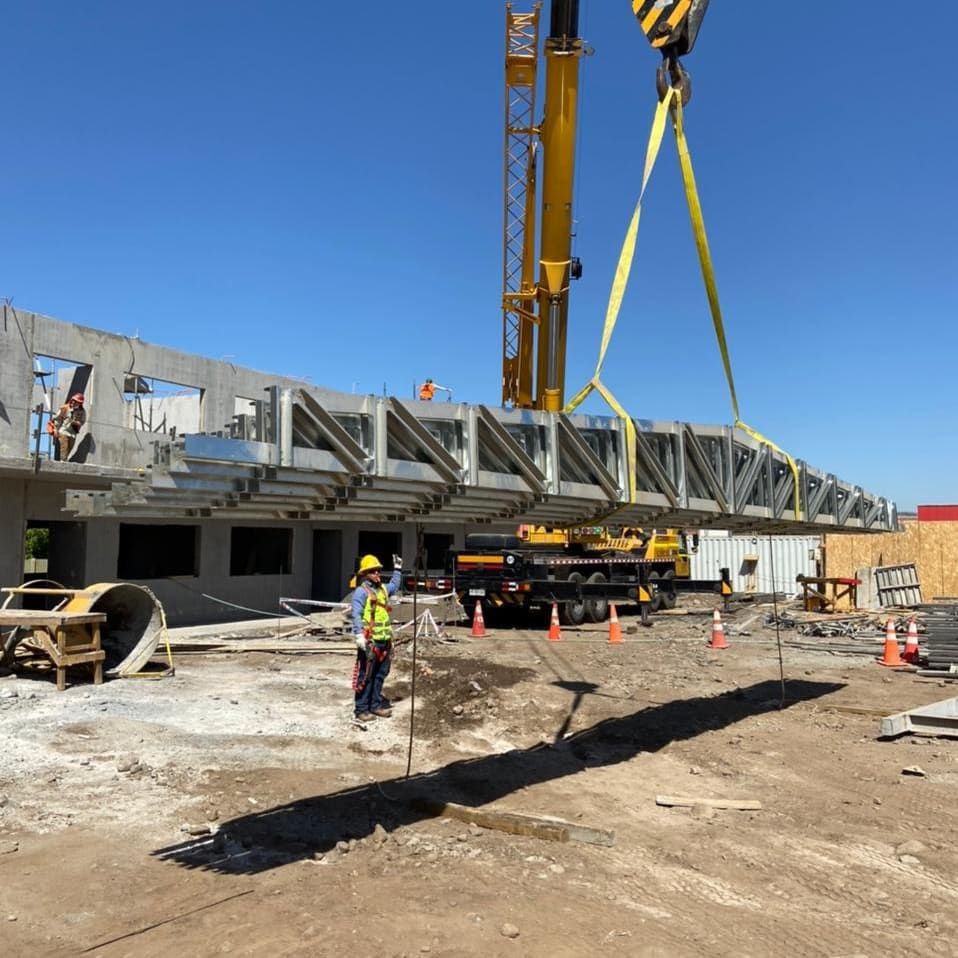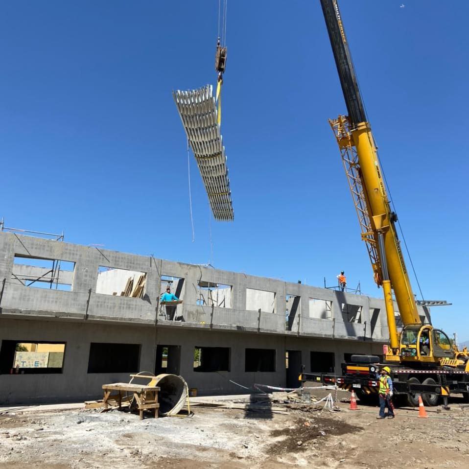 Montaje de estructura prefabricada en dos niveles, lista para recibir terminaciones.