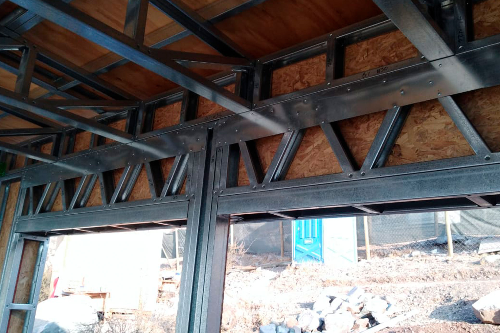 Las vigas y cerchas fueron instaladas directamente sobre montantes, y el sistema de volcamiento fue restringido con tensores y zapatos de anclaje, ya ocultos bajo el forrado exterior.
